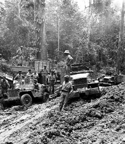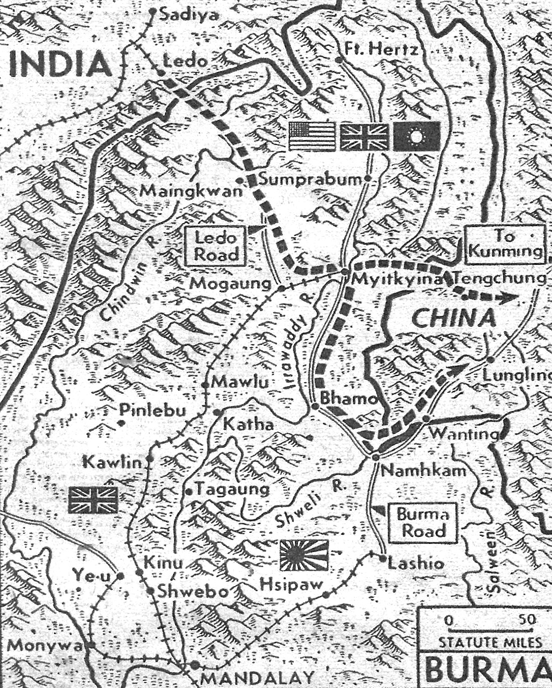Theoretically the fighting should have stopped with the advent of the monsoons. The Japs probably reasoned that it was impossible to supply 50,000 troops so far from a railroad. But "Vinegar Joe" Stilwell had other plans. He wanted to stage a surprise attack on Myitkyina on the Irrawaddy river. Could General Pick, regardless of the monsoon, maintain the road already built and at the same time support a surprise attack in force? It was a vital decision. General Pick committed himself to support the attack, and also agreed to provide two combat engineer battalions to assist in the attack, which was to start with seizure of the Myitkyina airfield, and end with the fall of the town after a 74-day siege. One of the supporting features needed for the attack was an airfield on the east side of the Hukawng valley. The engineers worked day and night, excavated 50,000 yards of earth and on the morning of the thirteenth day the field was completed to the extent that it could accommodate all types of planes needed for the operation. The rains were a bit later than usual, but heavier. The season brought 150 inches of rain for Shingbwiyang. All the way back to Ledo, slides were blotting out the highway, and crews fought them day and night. Yet the route was never blocked for longer than ninety-six hours - and that happened but once. The time had been insufficient for graveling of the road across the valley. Six Bridges Lost. Six major bridges were washed out in one 24-hour period. The big bridge over the Tarung was lost, and presented one of the toughest problems. This river, according to Colonel Green, is about as wide as the Mississippi at Cairo, Ill. It has been known to rise ten feet in ten hours, and it carries tremendous amount of drift. Only military necessity would cause anyone to try and bridge it during the monsoon season. The job was started at midnight, June 16, and completed in forty days. During the same 40-day period a Chinese regiment of engineers built a corduroy (log) causeway eight miles long, covering a section where three thousand feet of road had been lost. To build the bridge and Causeway 2.550 piling and over 1 million feet of lumber and bridge timber was used. Two small portable sawmills turned out the million feet of lumber in thirty days. Despite all the difficulties, the end of the monsoon season found the road better than it had been in May. In October clearing weather permitted resumption of field operations along both the old refugee trail, south of Myitkyina, and the new main road, south of Warazup. By January 27, 1945, both routes had connected with an old trail to Bhamo. The intersection is 270 miles from Ledo, and Bhamo is 367 miles from the railroad terminal. On January 28 the first convoy crossed the Chinese border, near Wanting, and it reached Kunming on February 4. However, the engineers continued to work on the Namhkan-Wanting section, developing it from a rough, narrow trail to a heavy-traffic highway. The completed Ledo road is designed to carry more than 60,000 tons per month, and one military police post has reported the passing of 8,500 vehicles in a 24-hour period. Officials have estimated that by the present time supplies should be moving over the road at the rate of about 13,000 tons per month. It has been said that one ton of supplies in China is worth as much as four tons elsewhere. The construction job involved: Moving more than 50,000 square yards of dirt per mile for 483 miles - a total of 13½ million cubic yards, or enough dirt to build a wall ten feet high and three feet wide in a straight line from New York to San Francisco. Building of 160 bridges over sizable streams; among these were two steel suspension bridges, one with a 380-foot clear suspension and the other with a 460-foot suspension; and the construction of a large steel floating bridge across the Irrawaddy. Installation of 105 miles of drainage pipe. Hauling and distributing as much gravel as could be carried in 1,100 trains of fifty cars each, or a single train 470 miles long. The road is thirty-two feet wide in the mountains and forty-nine feet wide where is crosses the valleys. Although the actual construction work was principally done by American soldiers - most of them Negro troops, thousands of natives were employed. They helped build the bases and sub-bases, handled supplies and were employed in malaria-prevention activities. Each of India's 200 dialects was represented, and the language problem alone was stupendous. Often sign language was the only answer. The quartermaster had to stock a dozen different types of rations for them.Due to caste and customs, strict segregation was necessary. As an illustration, some of the workers were "self-feeders;" a self-feeder refuses to eat food prepared by another lest the other become his brother and claim all his possessions. They Call It “Pick’s Pike.” "Pick's Pike" was the name some phrase maker gave to the project, and it stuck. When General Pick hove into sight of the workers - and he was usually in the field - the soldier who first saw him usually announced that "here comes the man with the stick." Like many others, he carried a rattan stick, with a hook on the end. Convenient for hooking around a tree and pulling one's self up a bank. When General Pick first got the stick it reached from the ground to his chin. Before the road was completed it had been worn so that it reached only to his diaphragm. The soldiers said they could tell how the job was progressing by the manner in which he carried the stick. If it was swung jauntily, then everything was dandy. If it was firmly clutched, then the time had come to batten the hatches for a blow. Few people realize that there is an oil pipe line along the Ledo road. But recently Representative Mansfield of Montana told Congress quite a bit about that line. He said it starts at Calcutta with 6-inch pipe, intended to transport gasoline and diesel fuel from tanker ships a distance of 750