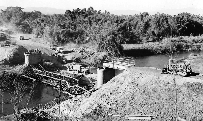 "We can't build you a jeep road," replied Colonel Pick, "but I think we can build you a road that will take truck traffic. When do you want it finished?" "Can you do it by January 17?" "Okay." The soil in that area is clay and shale. The shale is no good for road surfacing, so it was necessary to haul gravel out of the beds of the streams - sometimes it had to be hauled twenty-five or thirty miles. There were no by-passes, no side roads. It was as though a tunnel were being driven through the jungle. The lead bulldozer blazed the trail. It was followed by clearing crews, who blasted the big trees - often six feet in diameter - and other crews leveled and graded and dug ditches, installed culverts and drains. A detachment of Chinese troops built temporary bridges of hand-hewn timber. And finally the surface was "metaled" with eight to twelve inches of gravel. Four days ahead of schedule, the lead bulldozer broke into Shingbwiyang and the Hukawng valley, which are within Burma's border. Within two hours after the road was broken through there arrived at Shingbwiyang the first convoy of fifty-five 2½-ton trucks, bearing combat troops of the Chinese army, headed for the Jap front line, twenty miles forward. Later that day the engineering regiment held a celebration, with a stage show, a band, movies, publication of a mimeographed newspaper and the distribution of PX rations. Troops Using the New Road. Shingbwiyang was 102 miles from Ledo. During January many Chinese-American troops moved to the front over the route, and in February Brig. Gen. Frank Merrill's famous Marauders used it to start their campaign that punctured the Japs' myth of invincibility. The tactical situation complicated the Job. The road couldn't progress ahead of General Stilwell's troops - the troops needed road-borne supplies. Obviously it must be a boot-strap proposition, with combat and construction moving almost hand-in-hand. General Stilwell asked Colonel Pick to build a temporary road which would follow close behind the troops. Many lateral trails would be necessary to supply the combat units spread across the advancing front. On December 31, 1943, two armor-plated bulldozers moved out of Shingbwiyang and began to break a trail southward through the valley towards Tanai river, forty-three miles away. Ahead of them and on either side were protecting troops. Frequently they were held up by enemy fire. The temporary road followed the old refugee trail through the principal villages of the valley. The engineers developed it into a double-track combat highway. But at the same time construction was started on a permanent route, which made an arc to the eastward along higher ground, and rejoined the refugee trail at the lower end of the valley. Now, instead of cutting shelf paths along mountainsides, the problem was to raise the roadbed above flood danger. It involved much grading, many bridges and causeways. At the same time construction of an airfield at Shingbwiyang was begun. It was needed to fly in yet more supplies, and to evacuate wounded. It was one of three all-weather fields and two temporary landing strips that were to be built alongthe route. This was one of the engineers' incidental assignments, but finally, in the aggregate, airport construction represented a seal-coat surfaced runway of approximately seventy-five acres. Pick Becomes a General. In March Colonel Pick was promoted to the rank of brigadier general. By May the temporary road was at Warazup, eighty-seven miles from Shingbwiyang. The bulldozers had averaged better than a mile a day when they were not held up by the fighting.