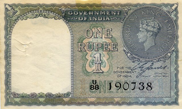 GOVERNMENT OF INDIA - 1940 ONE RUPEE NOTE - FACE