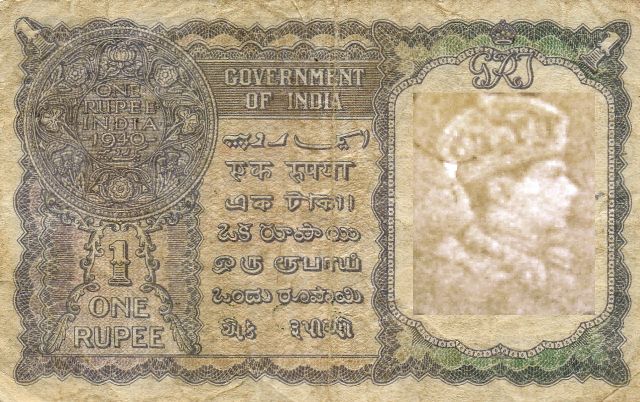 GOVERNMENT OF INDIA - 1940 ONE RUPEE NOTE - BACK SHOWING WATERMARK PORTRAIT