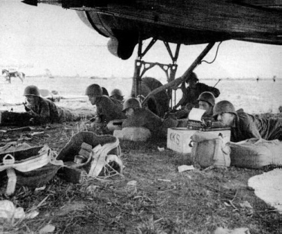 General Stilwell, reflectively fondling his Winchester carbine, talks with two of General Merrill's officers at Myitkyina airfield. The man at the left, armed to the teeth with carbine, pistol and dirk, is Captain Dick Young, an Hawaiian-born Chinese who is Stilwell's personal aide. Two hours after Stilwell flew out, Japanese fighters made fierce strafing attack on the field.
