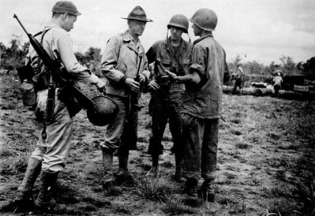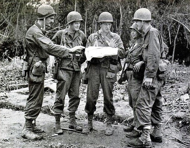 ON MARCH BEHIND JAPANESE LINES, BRIG. GENERAL MERRILL (WITH MAP) CONFERS WITH STAFF. SECOND FROM RIGHT IS LIEUT. COLONEL CHUN LEE, CHINESE LIASON OFFICER.