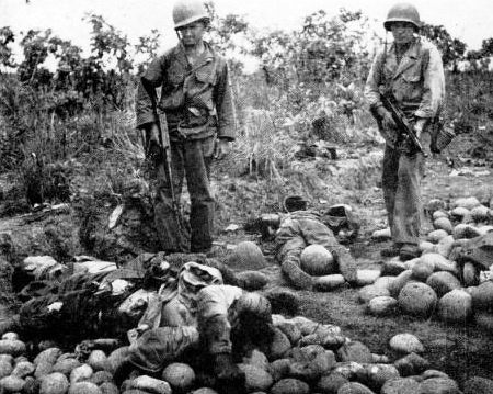 Three Japanese were killed at edge of airfield an hour before this picture was made.Headless body in foreground, bleeding on pile of stones, was mutilated by grenade explosion.