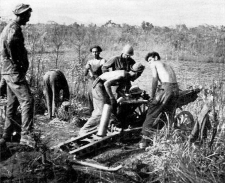 Merrill's artillery shells Japanese falling back into Myitkyina itself.Gun is U.S. 75-mm howitzer, a fine little weapon which may be carried in planes or in pieces on backs of pack animals.