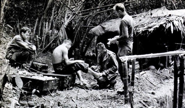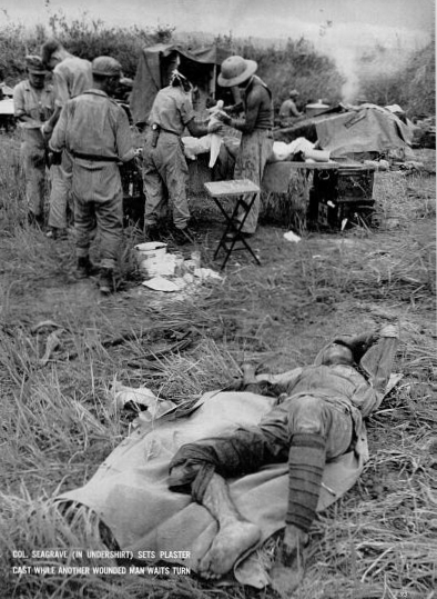 At first-aid station in bamboo thicket a Marauder is treated for foot injury.Two medical units, one led by Lieut. Colonel Gordon Seagrave (author of Burma Surgeon). traveled with columns.Their supplies were carried on horseback in big boxes like one patient sits on above.