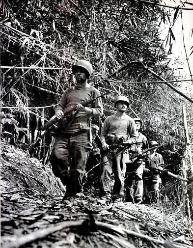 Marauder patrol, eyes searching the bamboo underbrush with feral alertness, walks down the jungle trail to protect the main column. All of these men carry automatic weapons for quick firing in case they should meet any Japanese. Second man also carries curved Gurkha knife. Little groups like this continuously patrol around columns to prevent possible surprises.