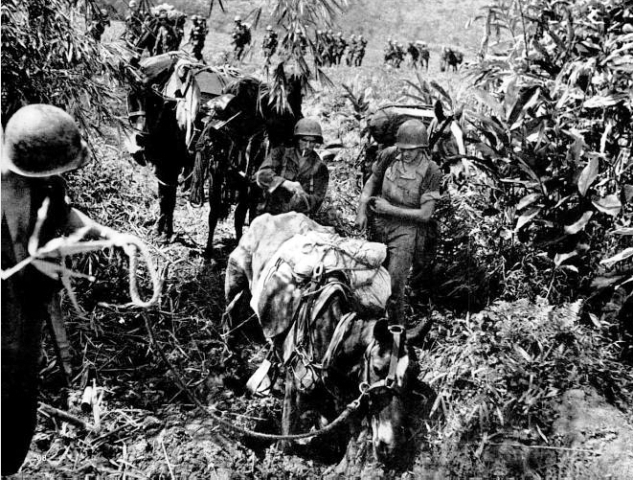 FILE OF "MERRILL'S MARAUDERS" PASSES THROUGH CLEARING ON LONG MARCH TO MYITKYINA. SAME DAY THEY PASSED UNMOLESTED WITHIN MILE OF BIG JAPANESE ENCAMPMENT.