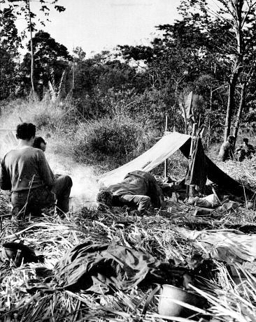 Marauder blows on tiny fire to warm his breakfast in canteen cup.Breakfast, like every other meal on Merrill's march, was canned K ration.The men wake stiff and sore from dampness of nightly rains and humid expirations of the heavy underbrush.During march over hills and down Irrawaddy River valley to Myitkyina, they traveled light.They even discarded all of the mess kit except cup and spoon.They carried no towels, toothbrushes, bedrolls, raincoats or extra clothing.Each man had only his weapons, ammunition and a "shelter half," or pup tent.