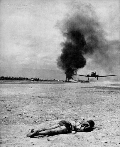 On stony Myitkyina airfield a dead Japanese lies where he was shot down.A C-47 transport takes off while another burns from strafing attack made by four Zeros five minutes previously.Airfield, two miles south of Myitkyina, was captured on May 17 when Merrill's men hooked around city from the north at end of 25-day march.On May 23 the Japanese, still within sniping distance, made one big try to take it back.At the time, LIFE Photographer Hoffman was the only correspondent there.When the attack began, Hoffman was sleeping in a wrecked C-47.Weakened by a terrific Japanese machine-gun barrage, he left the plane in a violent rainstorm and spent the rest of the night with three other men in a slit trench filled neck-deep with water.Marauders beat off Japanese, moved on to Myitkyina itself, where they are still fighting.