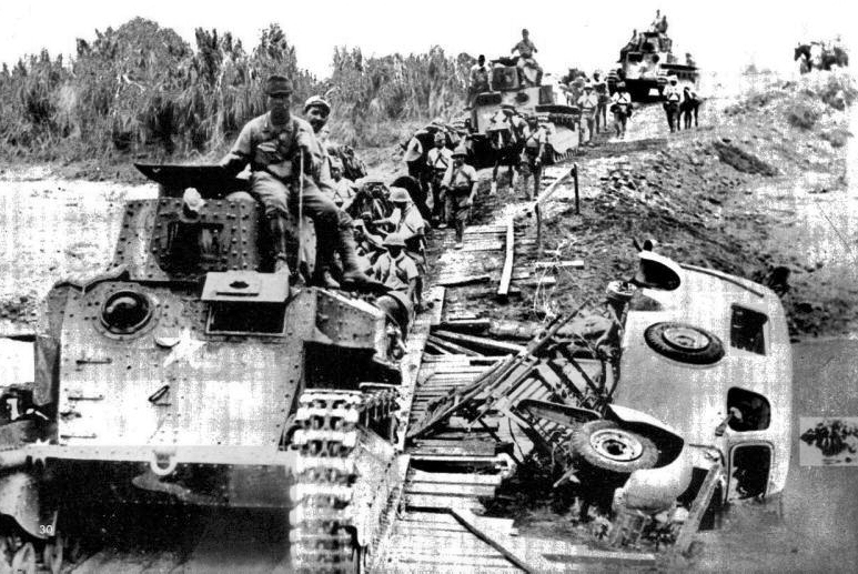 THREE OF THE FEW JAP TANKS IN BURMA, 8-YEAR-OLD 14-TONNERS, COME OVER A PLANK BRIDGE