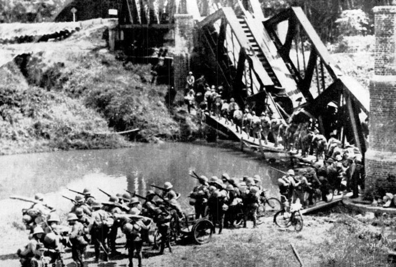 JAP COLUMN IN BURMA CROSSES FOOTBRIDGE BESIDE WRECKED RAILWAY BRIDGE,