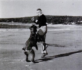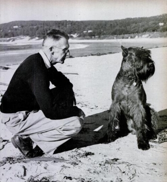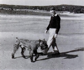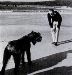 General Stilwell, who says his household rank is "just after the dog," passes a few minutes with his giant Schnauzer, Gary, on the beach near his home.