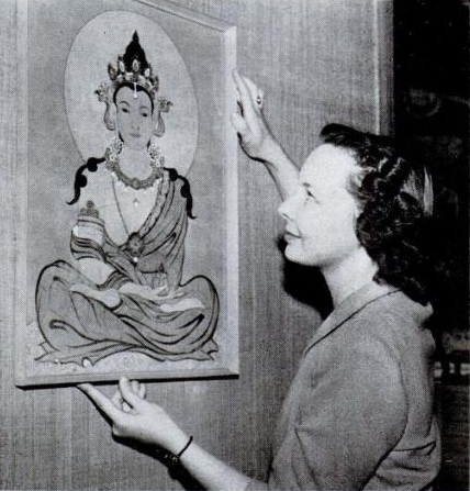 MISS STILWELL HANGS A BUDDHA. SHE LEARNED ART UNDER PRINCE PU JU.