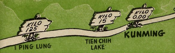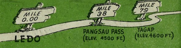 MILE 38 - This is the summit of Pangsau Pass (Elev. 4500 ft.) and the India-Burma border.From the top of the pass, eight miles of steep, winding road stretch in a vast panorama below you.And, as you start down into Burma, the blue waters of Forbidden Lakes glimmer in the swampy valley floor to the south. MILE 79 - This is Tagap Hill (Elev. 4600 ft.) It marks the farthest point of Jap infiltration innorthern Burma. In March 1943, a large Jap patrol advanced to Tagap (a Kachin village) but was forcedto turn back when their native porters and elephant contractors deserted. MILE 103 - Shingbwiyang was the site of the Japs' northernmost supply base in Burma. It was capturedby the American-trained Chinese Army in India late in 1943 and was turned into an American sub-depotwhen engineers pushed Stilwell Road down from the Patkai Mountains to the floor of the Hukawng Valley.Shingbwiyang, which once was a large Kachin village connected with the outside world by trails whichwere passable only during the dry season, lies at the foot of the Patkais. It is drenched withcontinuous rains during the monsoon, experiencing seasonal rainfalls exceeding 200 inches. MILE 178 - This is Jambu Bum (pass) where a fierce week-long battle was waged by American and Chineseinfantry to clear the gateway to the Mogaung River Valley. This was a decisive battle in the Northern Burma Campaign which laid the groundwork for the surprise assault on the Jap citadel of Myitkyinaa few weeks later. MILE 189 - This sub-depot on the Mogaung River, known as Warazup, was the scene of the biggest tank battlein northern Burma. The narrow streams which you cross in this area during the dry season become angry torrents hundreds of yards wide during the monsoon. The entire valley becomes one vastswamp. In this section the roadbed has been built as high as 15 feet above the floor of the valleyto protect the highway from encroaching floods, prevalent between May and October. MILE 234 - This is the Kachin village of Namti, onetime Jap communications center midway betweenMyitkyina and Mogaung on the Rangoon-Mandalay-Myitkyina Railway. It now serves as an American sub-depot. MILE 254 - Here Stilwell Road crosses the Irrawaddy River over the longest bridge of the Ledo lifeline. MILE 372 - Bhamo once was the third largest city of Burma. Today it is a shambles of demolishedpagodas and burned-out buildings sprawled dead and grotesque among groves of teak trees on theIrrawaddy River. MILE 439 - Namkham, in the Shweli River Valley, is another of Burma's war-shattered towns. It isthe location of the great Temple of the Golden Eye, now in ruins, and Dr. Gordon S. Seagrave'sfamed Burma hospital. It was from Namkham that Dr. Seagrave and his petite Burmese nurses begantheir retreat from Burma in 1942 - an exodus described in Dr. Seagrave's book "Burma Surgeon."Dr. Seagrave - now a Lt. Colonel in the U.S. Army Medical Corps - and his nurses recently returnedto Namkham after having marched with American and Chinese troops from Ledo through north Burmain the jungle campaign to drive the Japs from the path of the Ledo lifeline to China. Dr. Seagrave'shospital, situated on a knoll overlooking the town, served as a Jap army headquarters and was demolished by American bombers and Chinese artillery. Today, however, the hospital is being restoredand wards have been set up among its ruins. In the meantime, part of Seagrave's medical unit moved on south in Burma with the front line troops. MILE 465 - Mongyu is a tiny Shan village on a hill overlooking the junction of the Ledo and BurmaRoads. MILE 507 - Wanting (969 kilometers from Kunming) is a handful of customs buildings scattered amongbarren hills on the China-Burma border. Wanting was the scene of some of the bloodiest fightingof the Salween campaign, changing hands three times before soldiers of the Chinese ExpeditionaryForce finally secured the town and drove the Japs on down the Burma Road toward Lashio.