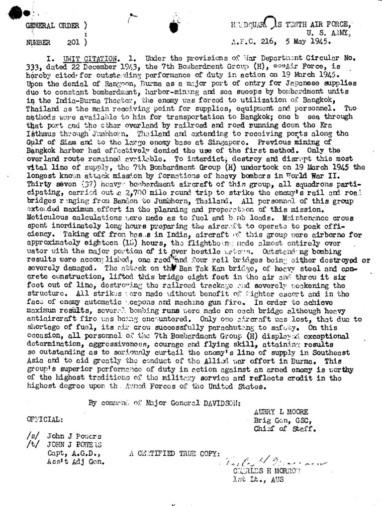 While the article describes the mission rather well, Charles mentioned that some of the planes were actually in the air for 20 hours. They struck the rail yards at Na Nien from levels as low as 440 feet and braved ack-ack to sow their bombs, leaving a large oil fire and also damaged trains and the Kanchanaburi bridge over the Kwai river. The EAC Liberators were out again after this record length mission, leaving a trail of wreckage along the Bangkok-Chiengmai rail line, while others bombed wireless installations on Great Coco Island, 50 miles northeast of the Adamans. These missions, along with our Naval Blockade were to impair major Japanese supply lines to Burma, and were effective in doing so.