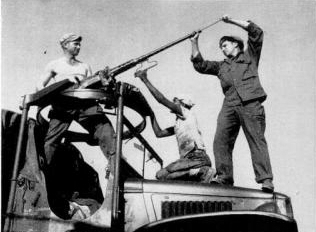 Americans clean their guns at Myitkyina motor pool. The town was taken from the Japsduring the monsoon of last summer. Its fall made completion of road possible.