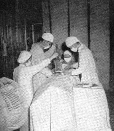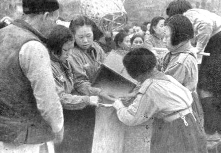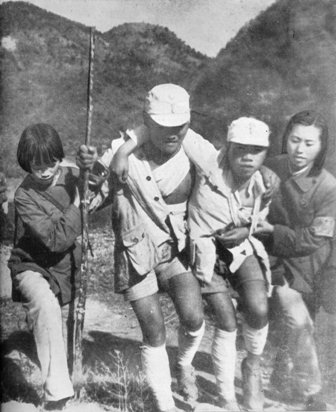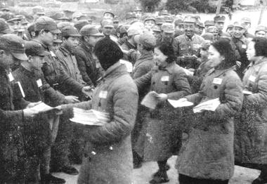 Madame Ma Chao-chun presenting wounded men with towels and articles for daily use