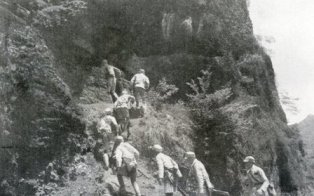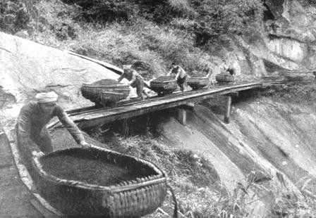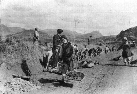 built, Chinese women, shoulder to shoulder with men, take up picks and spades. They work on high cliffs in cold winds