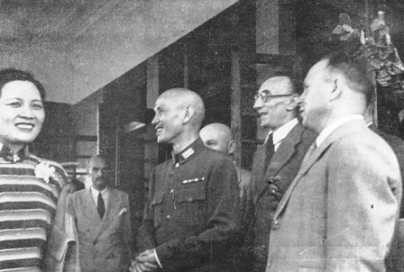 Wendell Willkie with Generalissimo and Madame Chiang at their official residence. On the left U.S.