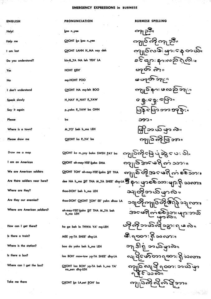 | DO'S | | 1. Avoid Mosquito bites. | | 2. Treat all cuts and scratches promptly, no matter how trivial. | | 3. Drink only sterilized water or a beverage known to be safe. | | 4. Take extra salt. | | 5. Keep physically fit - exercise; get sufficient rest. | | 6. Keep cool - wear loose clothing. | | 7. Learn how to greet the local people - respect their religions and customs. Try to speak the local language - even a few phrases will help win over the people. | | 8. Consult the headman in a village for permission to make camp, to attend a festival or to buy supplies. | | 9. Be constantly on guard with the hill tribes of the frontier. | | 10. Enter Kachin houses by the front door only. | | 11. Respect the Buddhist monks - the religious leaders and wise men of the country. Many carry "begging bowls" - drop in a penny. | | 12. Learn the Hindu caste marks - they are the insignia of the people. | | 13. Treat native women with the highest respect. | | 14. Bargain when purchasing from Mohammedans and Hindus, because their first price is about four times what they expect to get. But don't bargain with a Burman - he has only one price and you may "take it or leave it." | | 15. Be generous with cigarettes and tobacco. salt is an excellent trading medium. |