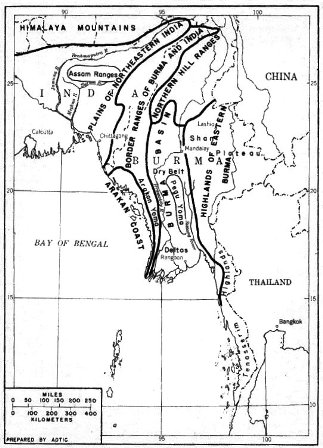 Burma is separated from Assam and Bengal, the provinces of northeastern India, by a series of rugged mountain ranges known as the Border Ranges, which in September 1943 marked the westward limit of the Japanese invasion into themainland of Asia. The southeastern pre-war boundary of Burma adjoined those of Thailand and Indo-China. The northeastboundary is formed by the Chinese provinces of Yunnan and Sikang, and in September 1943 was the approximate line separating the Chinese and Japanese forces in this region.