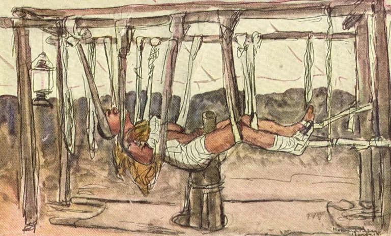 Anesthetized patient bandaged and carried by stretcher with center hole to fracture table. Stretcher is suspended by straps until series of straps are attached to patient. Then stretcher is lowered to ground. This fracture table was designed by Col. Seagrave in the Hukawng Valley, Burma.
