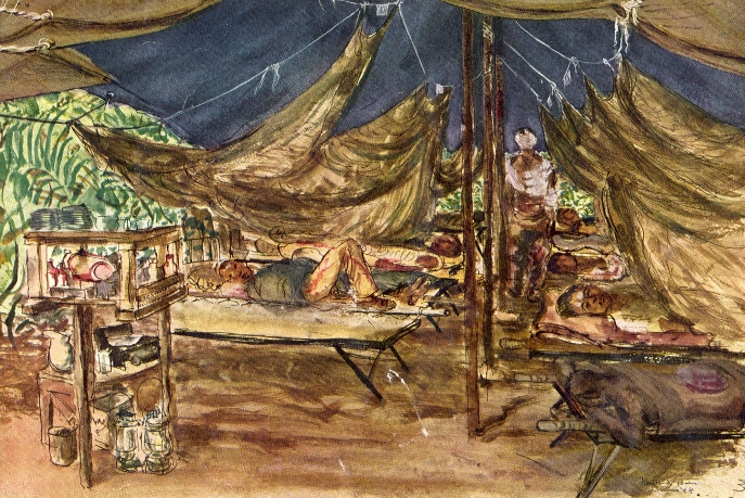 JUNGLE WARD After operation by a Portable Surgical outfit in the Burmese jungle, the wounded rest in a ward tent awaiting evacuation to field hospitals.