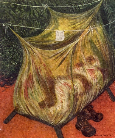 to protect him from mosquitoes and other tropical insects. Artist Baer has thoughtfully placed the man's shoes under
