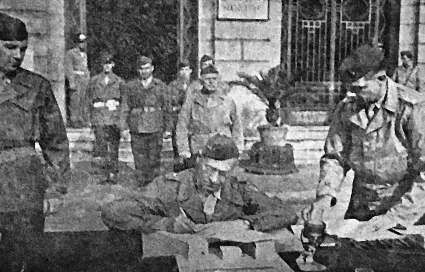 A touch of home also are the fall and winter landscapes, old prints on the wall, and of course a print of puppies and an innocent-eyed gal of yore.Homey, too, are the open booths with their high, red leather backed seats. But of deepest interest to the visiting marines today is the shiny, worn, round table where the leathernecks of the old Legation Guard tippedtheir mugs and regaled each other with tales on many a prewar night. Also screwed into the table top here and there are name plates (gold ones for those who have passed on). Here are a few name-plate remindersof those old days: S. Bonner, P. Johnson, Harry Bryan, Butch Dyson, Balloon Walters and (gold plates) E. Litke, Jack Fliey (a sergeant major) and C. Anner. Hempel's, 49 Hatamen Street, was opened in 1902 by Pa Hempel (his gold name plate says he died February 11, 1940), shortly after he was discharged