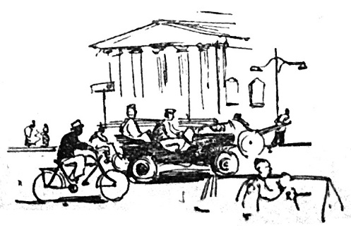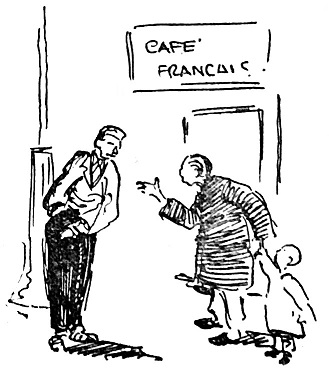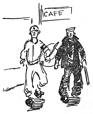 Planing in you see below the yellow glaze tiled-roofs of the Imperial pavilions and temples of Forbidden City glittering golden in the sunlight;the various embassies standing in their spacious grounds like Hollywood homes - well, d=some Hollywood homes -; the ancient gray walls partition the outerand inner cities. On the surface Peiping, cultural center of China for centuries and long the seat of emperors until the common people took over in 1911, is no less impressive.Wide, clean, smoothly asphalted thoroughfares, bisected by lovely parkways, teem with ricsha, pedicab and bicycle traffic, frequently scattered like chickensby the petulant honk of a late model Buick or Ford V-8. Although closeup the major hotels - Wagon Lits, Peking, Du Nord - and the temples and pavilions of Imperial City, Forbidden City and the Winter Palaceshow signs of disrepair from the long Jap occupation, there is outwardly in the city little evidence of the wanton pawing over by the Japs. On the practical side, as happened at Shanghai after the swabbies swarmed ashore, prices here are fast soaring with the influx of American dollarsin the pockets of silk and jade-hunting Marines. Month ago when Peiping was virgin territory for the souvenir and scotch seeker, a Mandarin coat sold for about $5. Canadian Club sold for the same, real honest-to-god Johnny Walker black label for about $7. But gastronomically speaking there's as much to satisfy the belly here as there is in beauty to feast the soul. As for babes - well, I tell you, Peiping is well worth a visit for any guy!