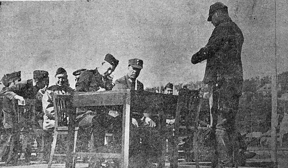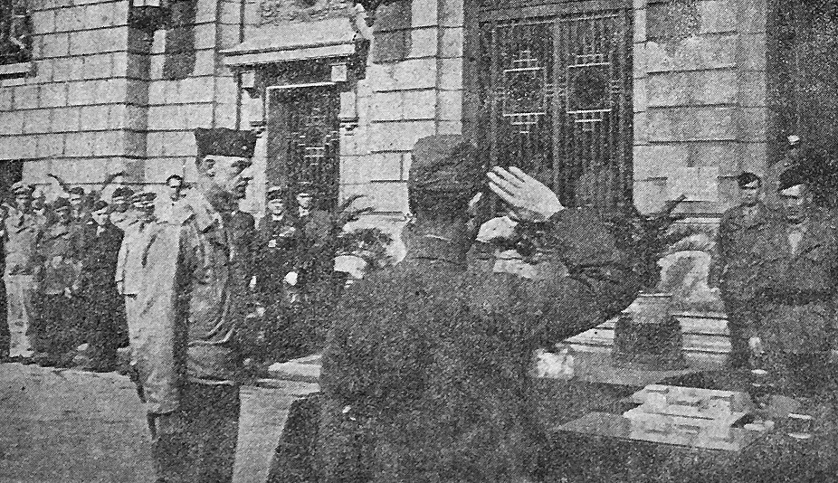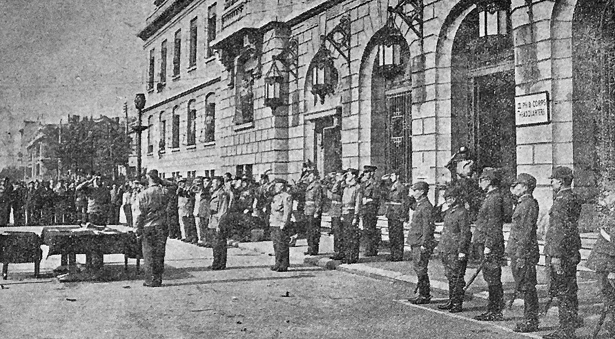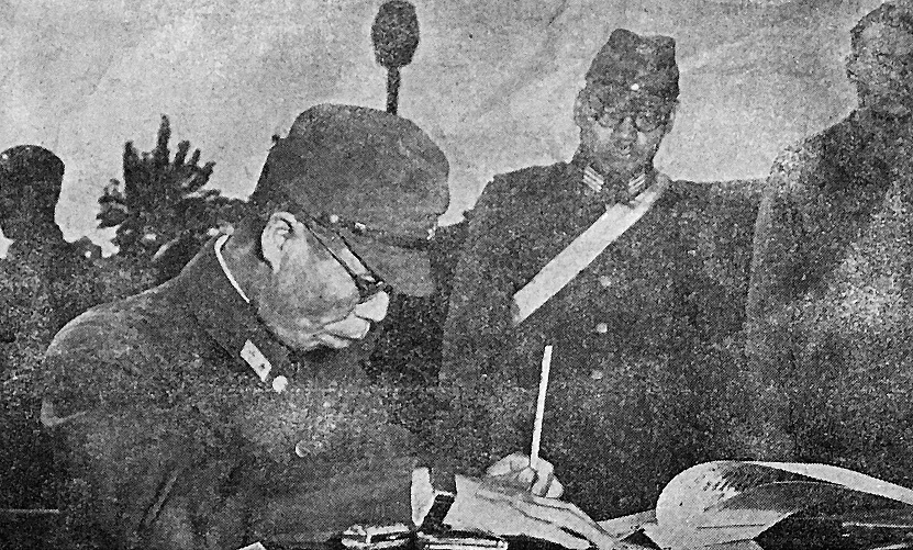 Marines Accept Jap Surrender Within a week after the first U.S. Marine units arrived in China, arrangements were made for the surrender of all Japanese forces in North China. There were three principal ceremonies - in Tientsin, Peiping and Tsingtao. Marine generals accepted surrenders in two of these. Sergeant Bill Rose, a Marine Corps correspondent, described the Tientsin surrender, and his terse description might well apply to all. "Surely it is historically significant," Rose wrote, "that this mass surrender of Japanese forces should come in North China. For it was inthis area more than eight years ago that the Japanese launched their march of conquest across Asia and much of the Pacific. "It was at Tientsin on Saturday morning, October 6, that Japanese Lieutenant General Ginnosuke Uchida, with six impressions from his ivory andjade name seal, signed away part of his empire's holdings. The surrender was accepted by Major General Keller E. Rockey, commanding general of the ThirdAmphibious Corps, on behalf of Generalissimo Chiang Kai-shek. "Also officiating at the ceremonies was Brigadier General William A. Worton, chief of staff of the Third Amphibious Corps, and Lieut. Col. C. P.Van Ness, designated as officer-in-charge of the surrender. "As the early morning sun began to warm the thousands of spectators, General Uchida and his aides arrived to sign the documents. Green-cladMarines of the First Division, who just three months before had fought the Japs on Okinawa, formed an honor-guard for the historic moment. In less thanhalf an hour, the surrender was over. "The Japanese, in single file, placed their centuries-old Samurai swords on the simple wooden table which had served for the signing, and marched away into oblivion. The First Division Band played the Star and Stripes, the Chinese National Anthem, and the Marine Hymn. Countless Chinese and thousands of Americans cheered. "Peace had returned to North China..." The Peiping surrender was accepted by Chinese General Sun Lien-chung, commander of the Eleventh War Zone, from Japanese Gen. Hiroshi Nemoto,commander-in-chief of Japanese Expeditionary Forces. This was also a colorful ceremony held on the Dragon Pavement, a lofty marble terrace in front of theTai Ho Tien, the "Supreme Harmony Throne Hall" of Peiping. There a great table, covered with rich red cloth, stood on the terrace center on a rich imperial yellow carpet. Present for the surrender were Marine General DeWitt Peck, commanding the First marine Division, and Brigadier Gen. William A. Worton, chief of staff of the Third AmphibiousCorps, and members of the First Regiment. The surrender date was significant - it was October 10, China's "Double Ten," the anniversary of the founding of the Republic of China. The surrender of troops of the Japanese Fifth Independent Mixed Brigade was made in Tsingtao on October 25 by Major General Eji Nagano, toMarine Major General Lemuel C. Shepherd, Jr., commanding general of the Sixth Marine Division. Lieutenant Gen. Chen pao-tsang, represented the Chinese Ministry of War. Thus did Marines accomplish the first phase of their mission in China.