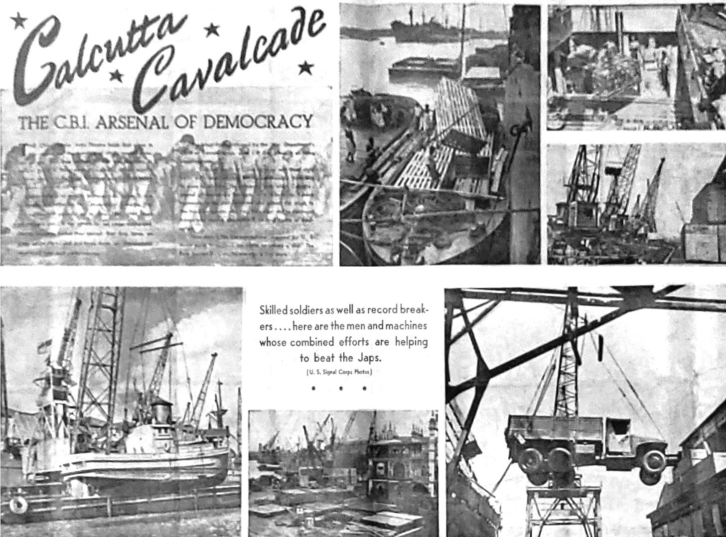 ![]() TOP LEFT (BACKGROUND) - Soldiers first, last and always. Calcutta's troops in addition to their miracle-approaching logistic achievement, make a small military appearance whenever they participate in reviews and parades. Marching with the precision of well-trained Infantry. Calcutta's SOS warriors are equally adept in every branch of the military. TOP CENTER - Crated Air Corps.equipment being loaded into small boats from an American Liberty ship, for transportation up country to Air Corps. units. Crane is part of ship's gear. TOP RIGHT UPPER - Army personnel check the unloading of ammunition from 'tween decks of American Liberty ship. Ship's gear is employed unloading. TOP RIGHT LOWER - Port Commission, semi-portal cranes shown unloading Air Corps.and substinence items. ABOVE LEFT - A 30-ton U.S. Army floating crane, assembled by Army personnel is shown discharging a motor towing launch. ABOVE CENTER - Very heavy equiment being unloaded by crawler and floating cranes. Note Mohammedan mosque in right foreground, which American officials allowed to remain when docks were being expanded. Quay cranes, and 30-ton dock cranes aere also shown. ABOVE RIGHT - U.S. Army "6 by 6" being unloaded by use of ship's gear.