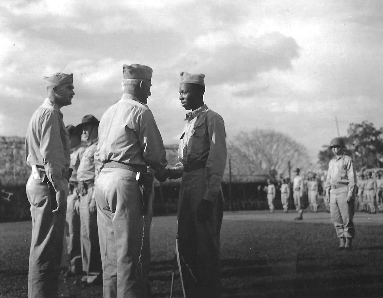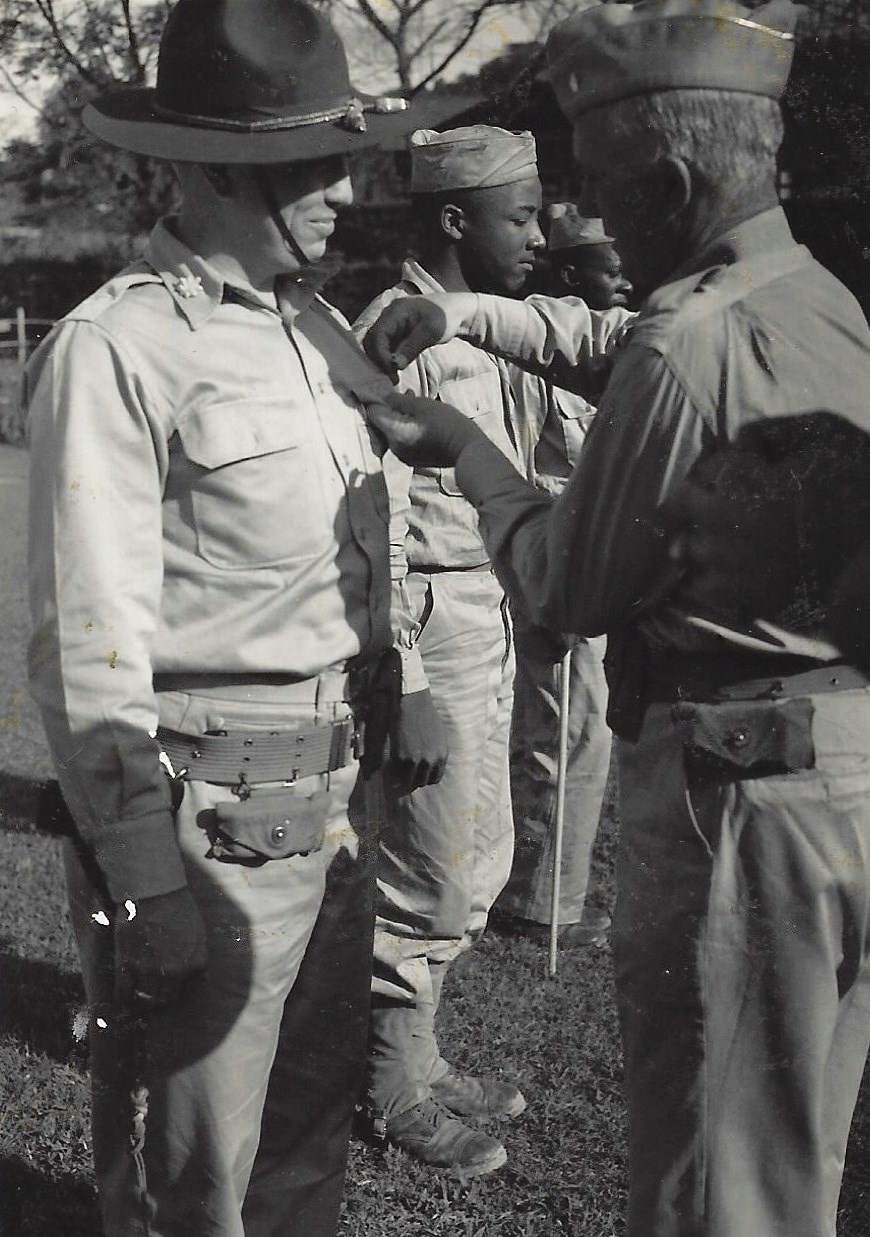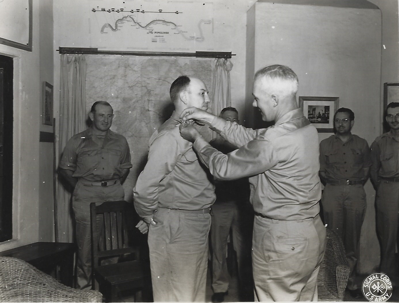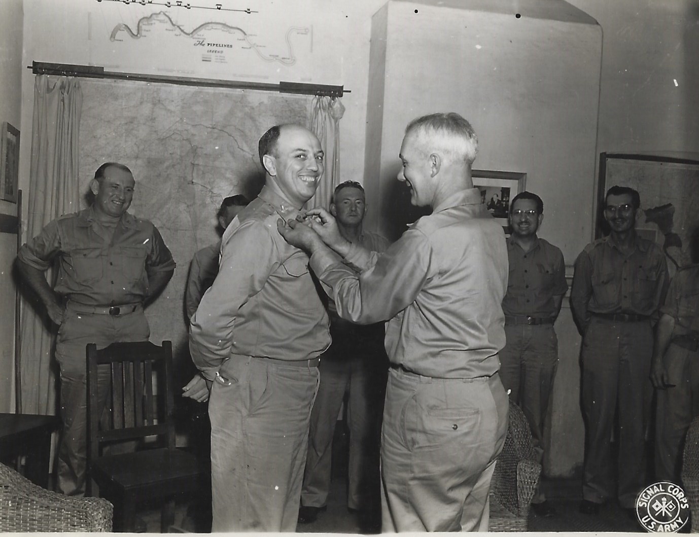 At a remote jungle base along the Ledo Road in Burma, Lt. Col. Charles Scott Davis (left), formerly of Omaha, was presented the Legion of Merit award. The citation, made by Brig. Gen. Lewis A. Pick (right), was for the outstanding services that Lt. Col. Davis performed as operation officer of the Missouri river division at Omaha. Gen. Pick was division engineer here before being assigned to overseas duty.