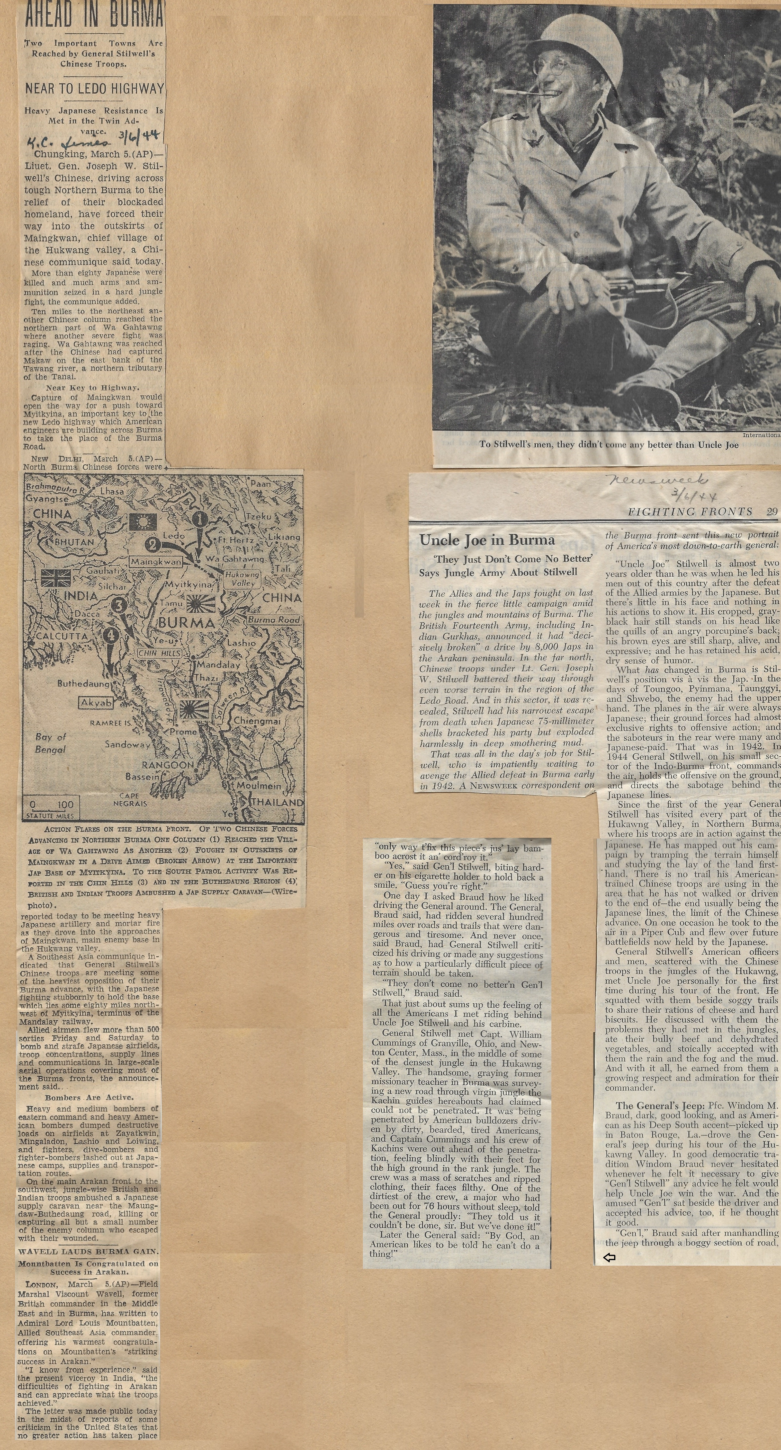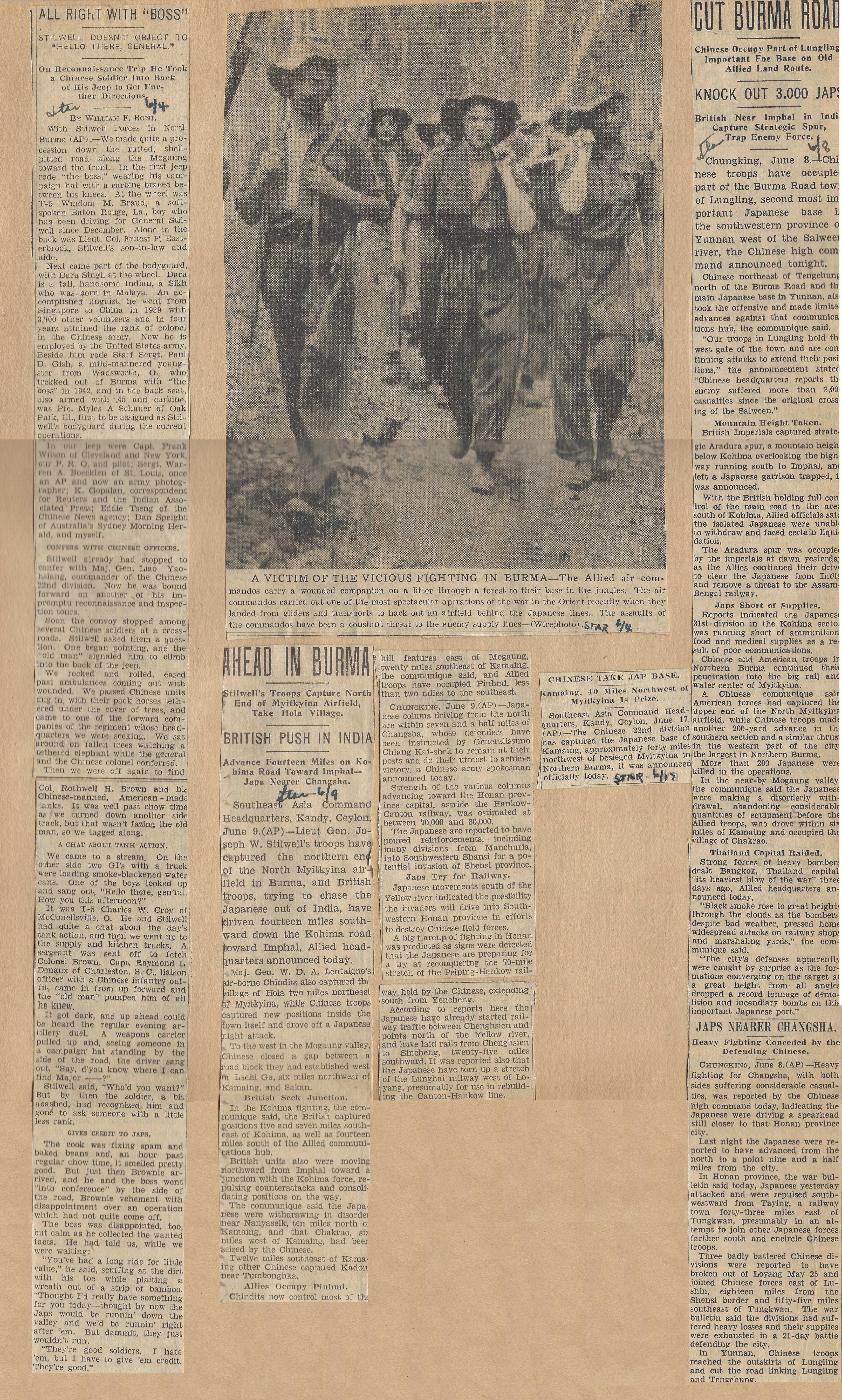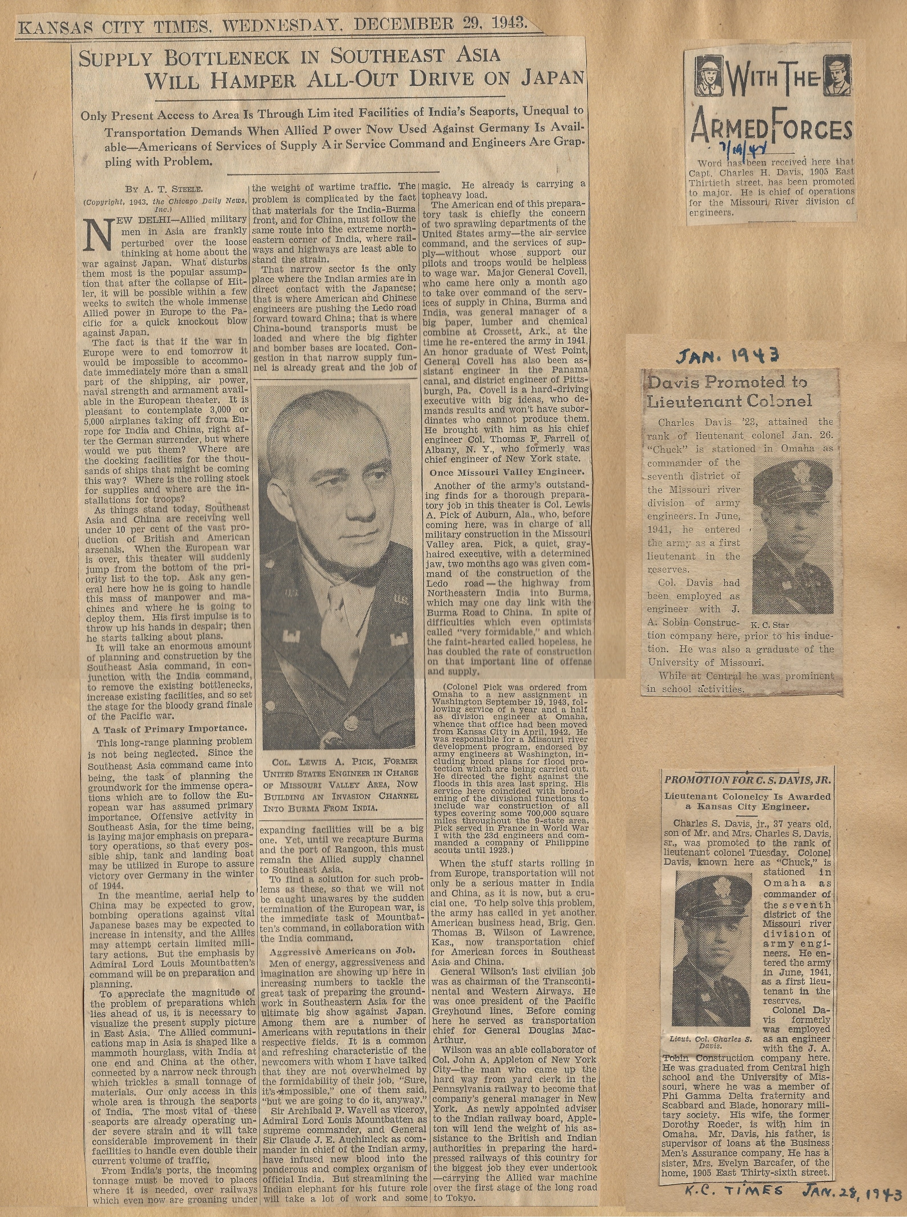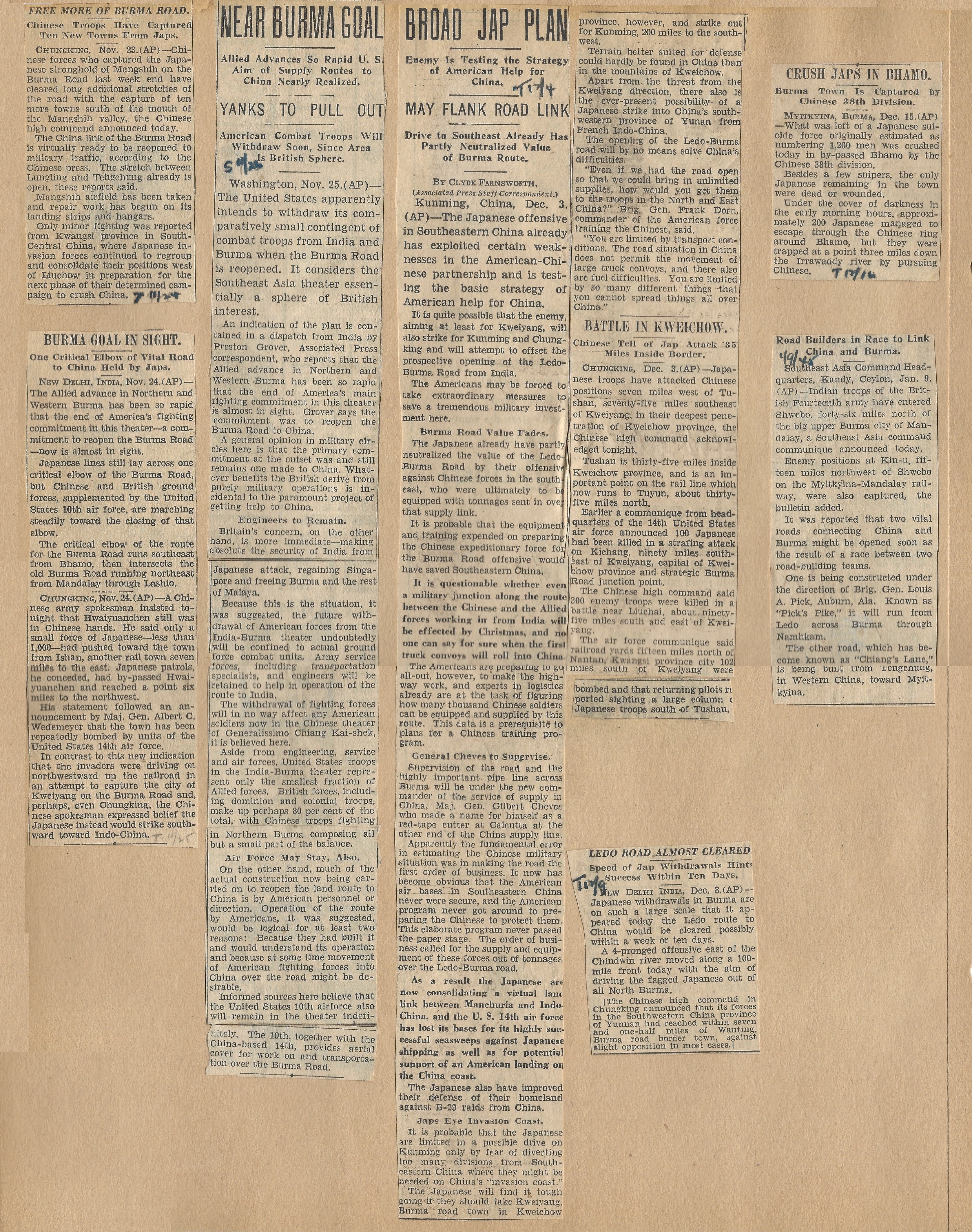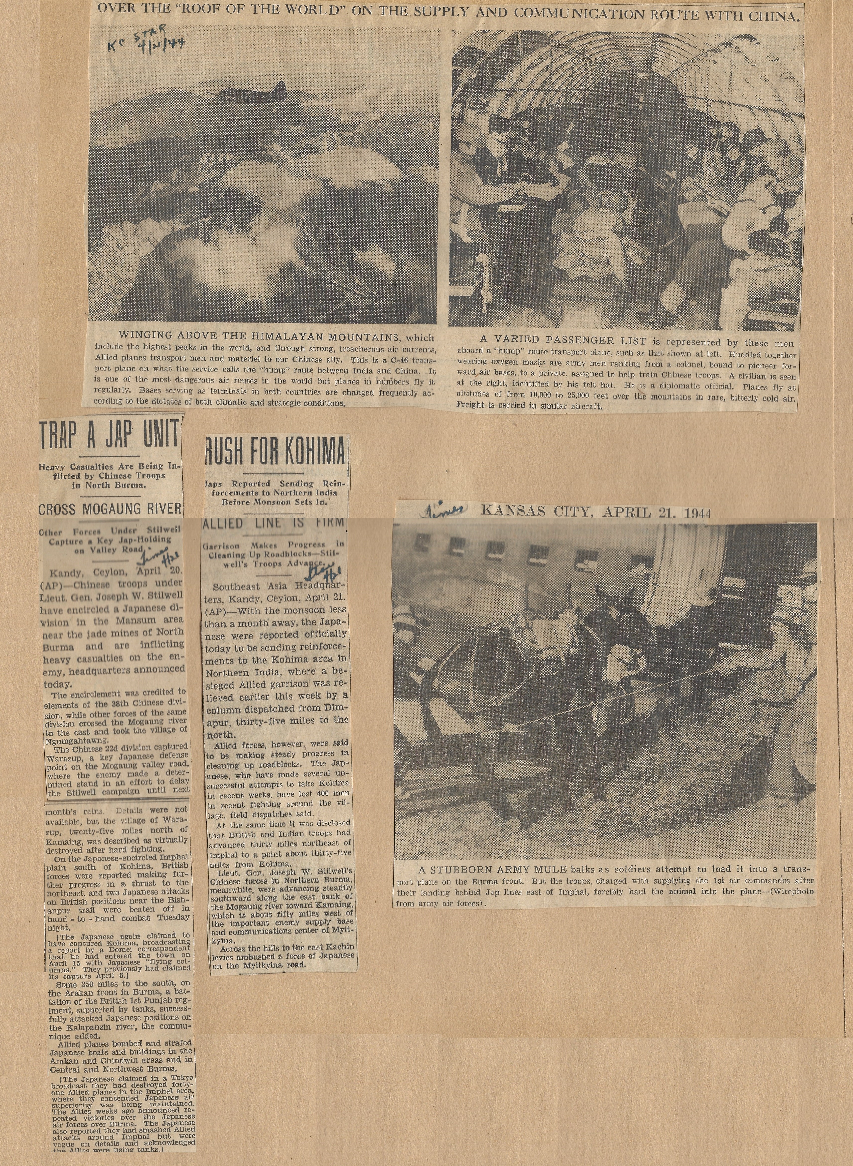 | Introduction In 1941, while war raged in Europe, most Americans preferred the country remain neutral and isolated from the conflict. That all changed on December 7th when the Japanese attacked Pearl Harbor and declared war on the United States. Just about every American was involved in the war, either being called to service in the armed forces, working in war production or other supporting roles. There were plenty of Moms who saw their sons off to some far-off place to fight. One such mom of Kansas City, Missouri, Josephine Smith Davis, saved newspaper articles about where her son was serving in a scrapbook. That place was the China-Burma-India Theater and her son was Lt. Col. Charles S. Davis. Below are the scrapbook pages filled with the CBI-related newspaper clippings she saved. For more about Col. Davis and his service in CBI - CLICK HERE Viewing Instructions Scroll down to view individual pages of the scrapbook. Click on the displayed page to open a new window with an enlarged image of that page. This image is more easily readable being 175% the size of the original. You can scroll up/down/left/right. Click on the image to close the window and return to this main page. Note that each page can be several scans pieced together and there may be some distortion where the scans were joined. To view all pages expanded - CLICK HERE Scroll down or click this box to continue to first page |
