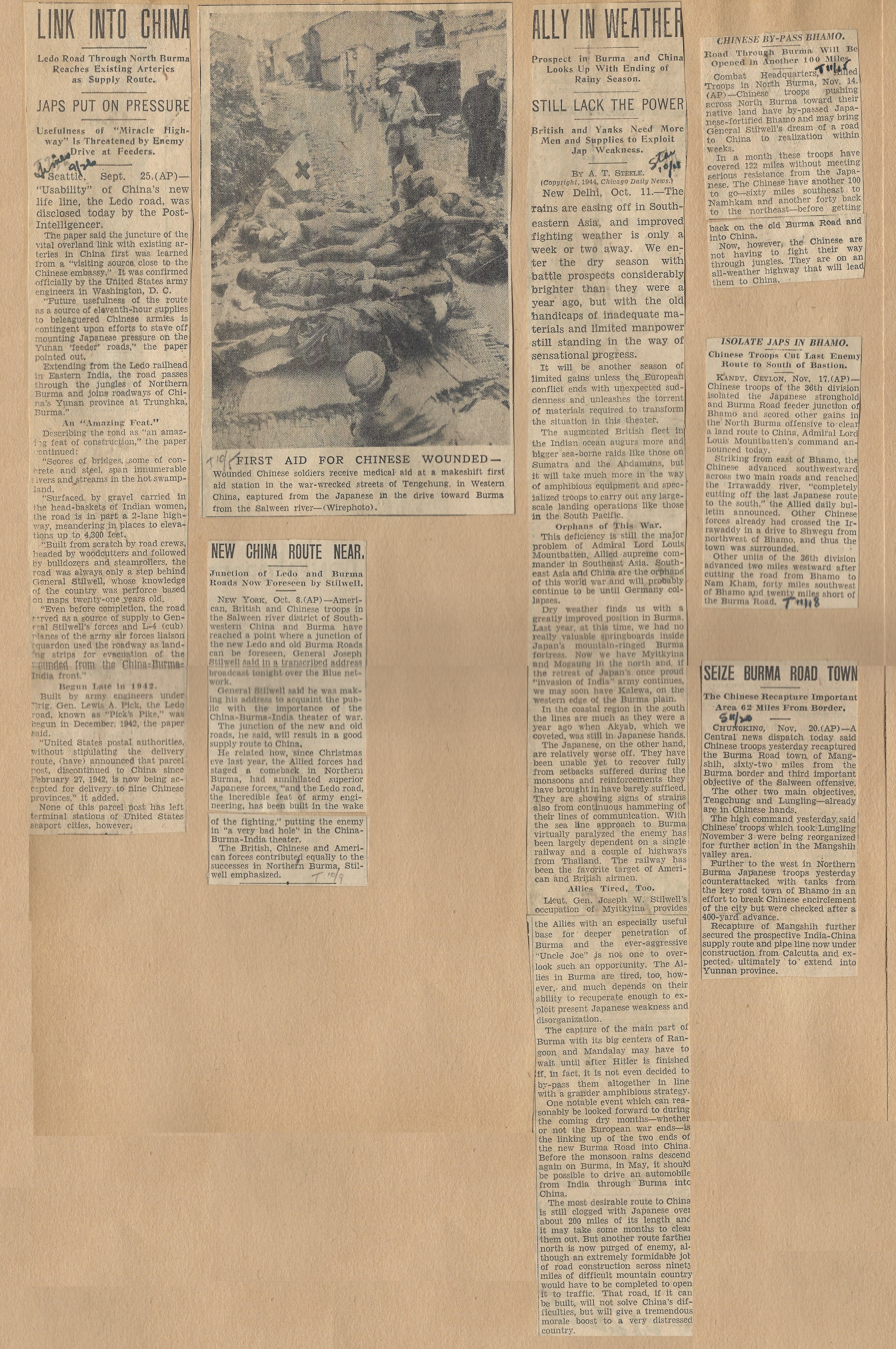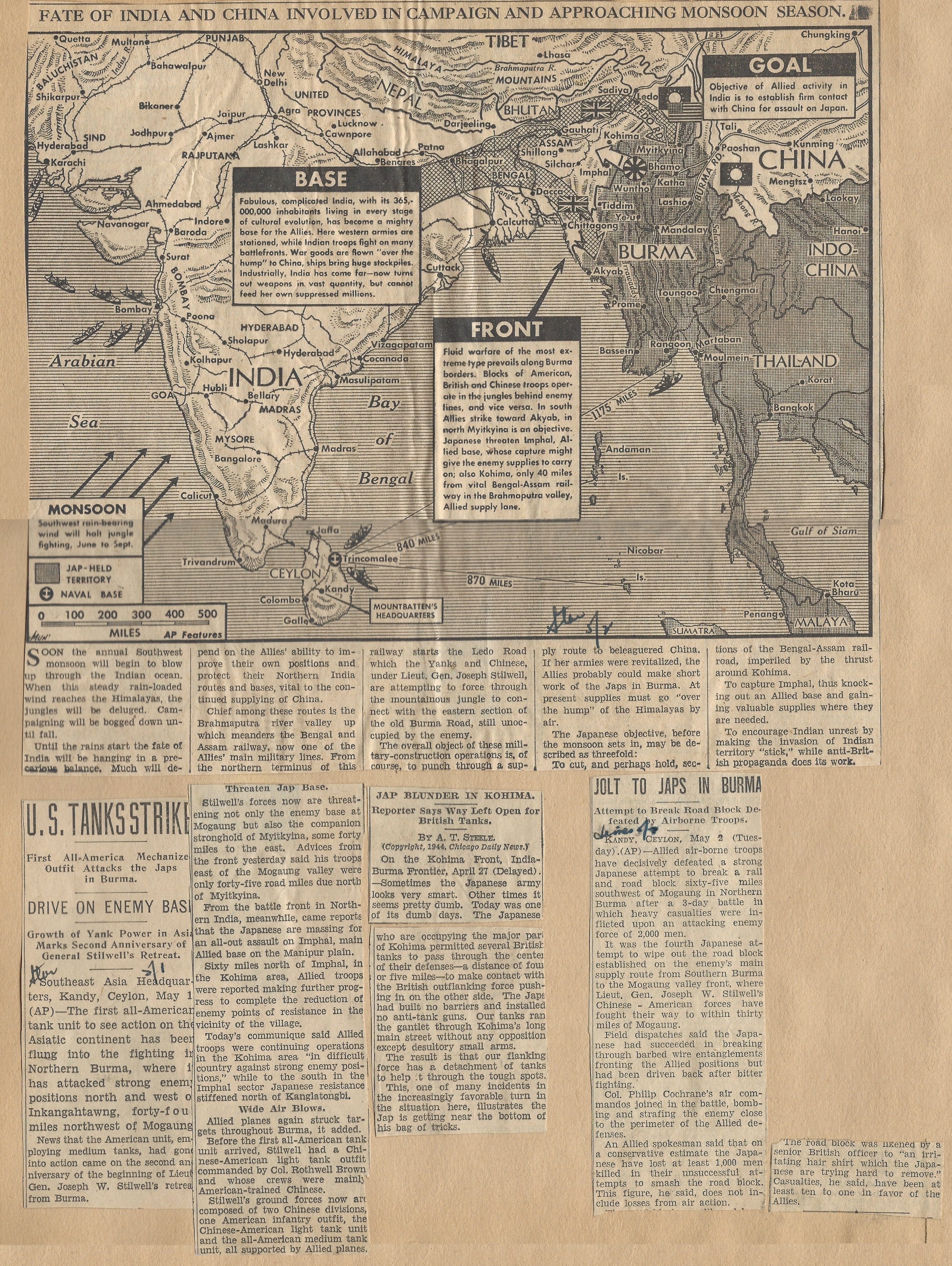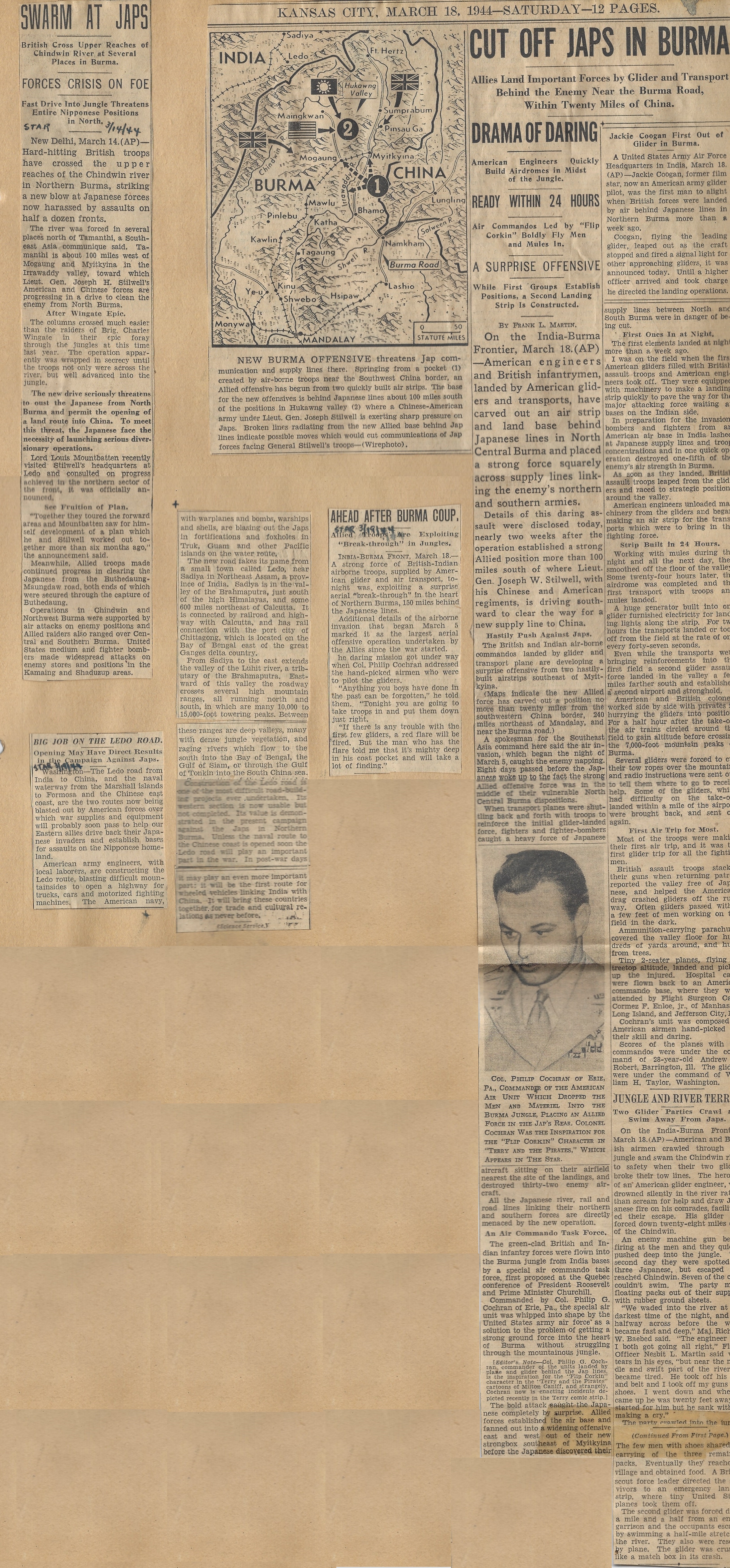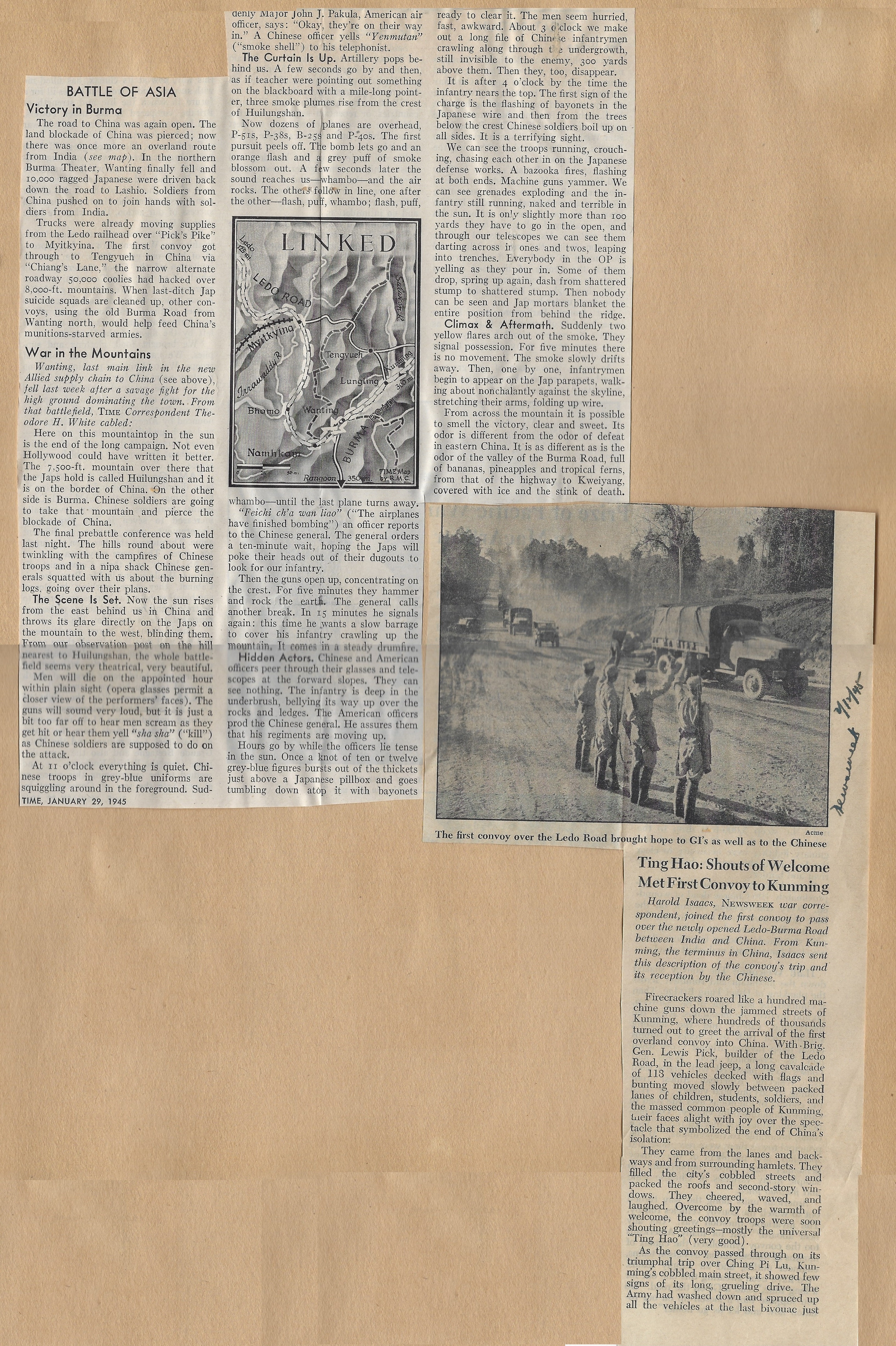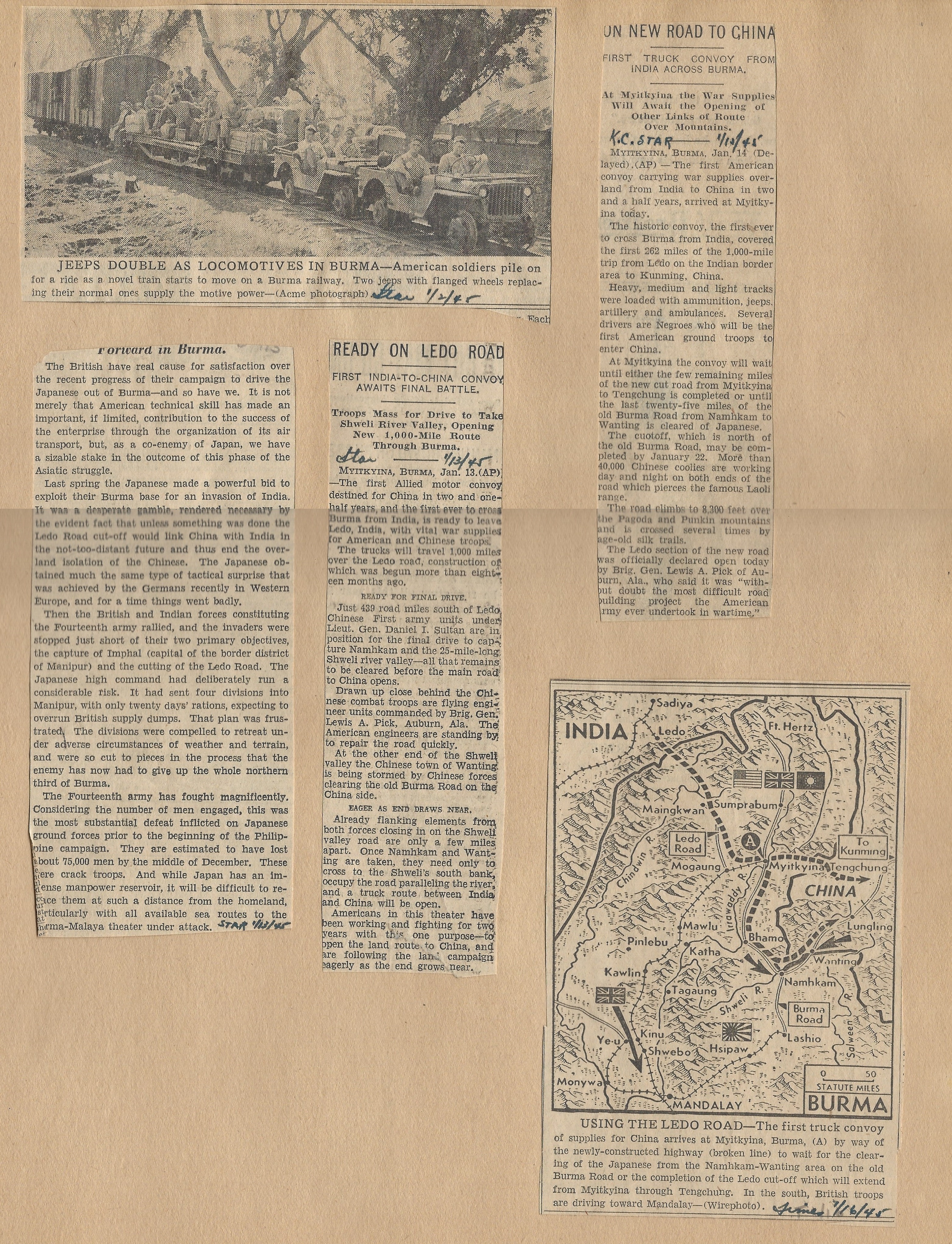 | Introduction In 1941, while war raged in Europe, most Americans preferred the country remain neutral and isolated from the conflict. That all changed on December 7th when the Japanese attacked Pearl Harbor and declared war on the United States. Just about every American was involved in the war, either being called to service in the armed forces, working in war production or other supporting roles. There were plenty of Moms who saw their sons off to some far-off place to fight. One such mom of Kansas City, Missouri, Josephine Smith Davis, saved newspaper articles about where her son was serving in a scrapbook. That place was the China-Burma-India Theater and her son was Lt. Col. Charles S. Davis. Below are the scrapbook pages filled with the CBI-related newspaper clippings she saved. For more about Col. Davis and his service in CBI - CLICK HERE Viewing Instructions Scroll down to view individual pages of the scrapbook. Click on the displayed page to open a new window with an enlarged image of that page. This image is more easily readable being 175% the size of the original. You can scroll up/down/left/right. Click on the image to close the window and return to this main page. Note that each page can be several scans pieced together and there may be some distortion where the scans were joined. To view all pages expanded - CLICK HERE Scroll down or click this box to continue to first page |