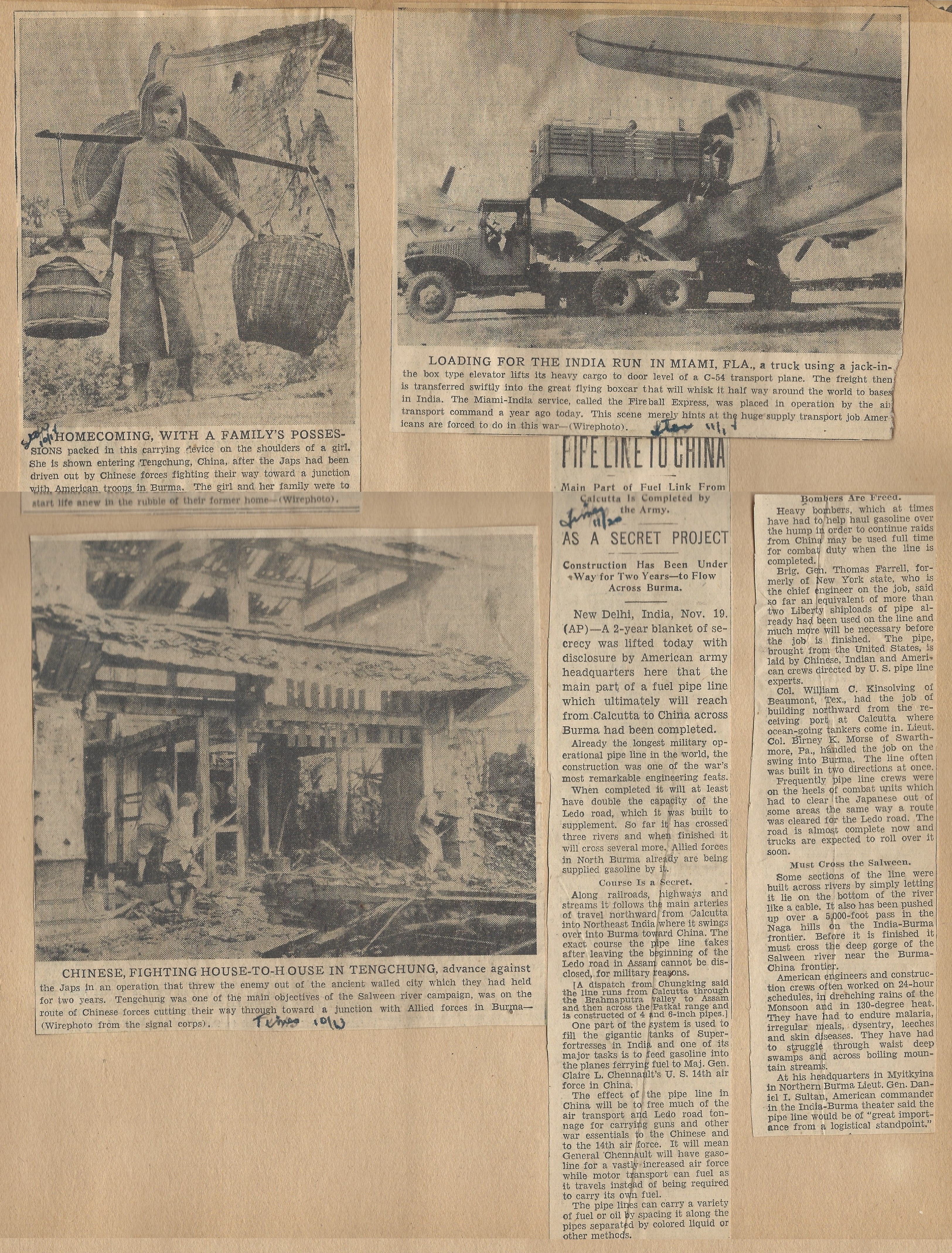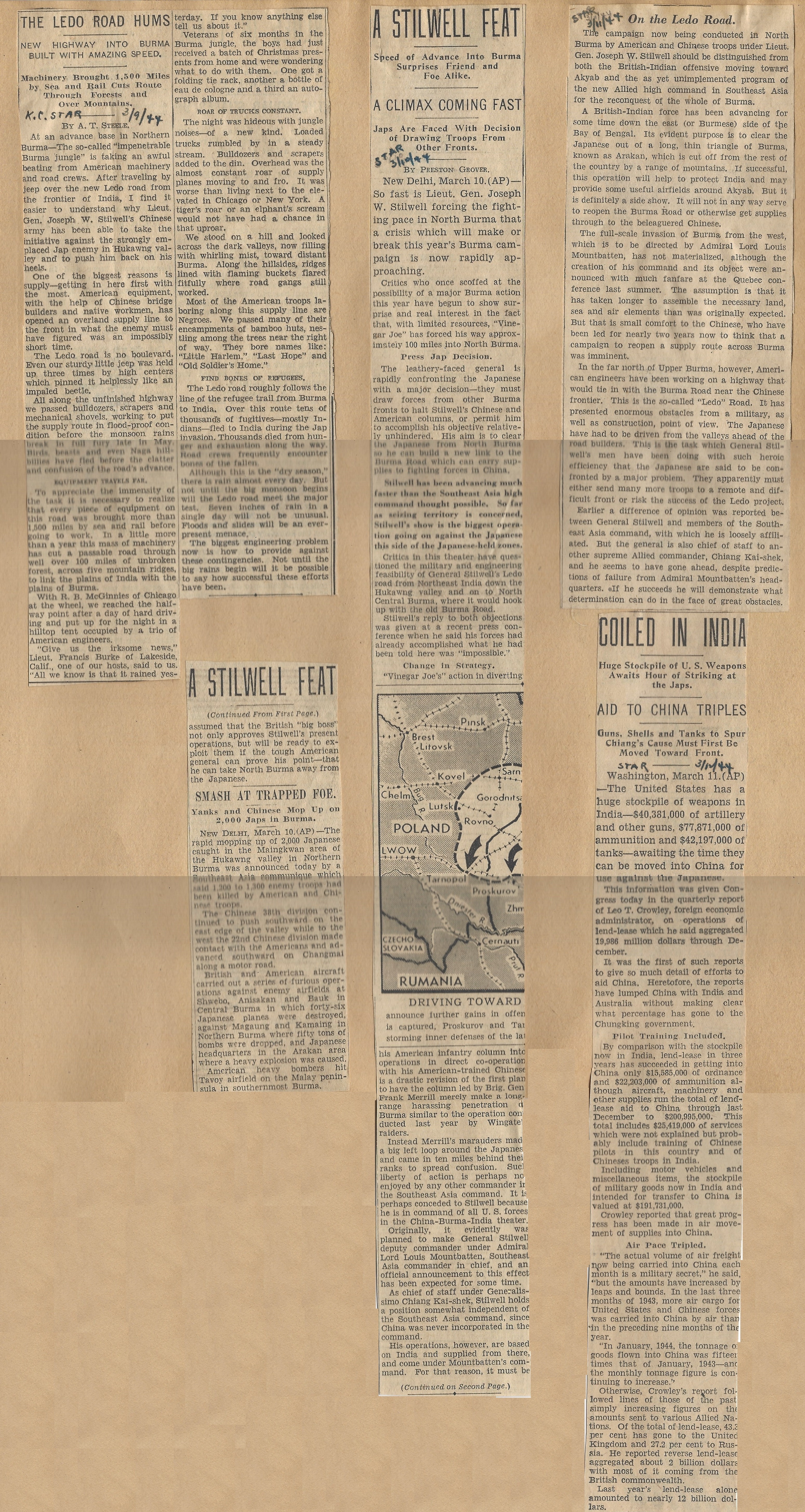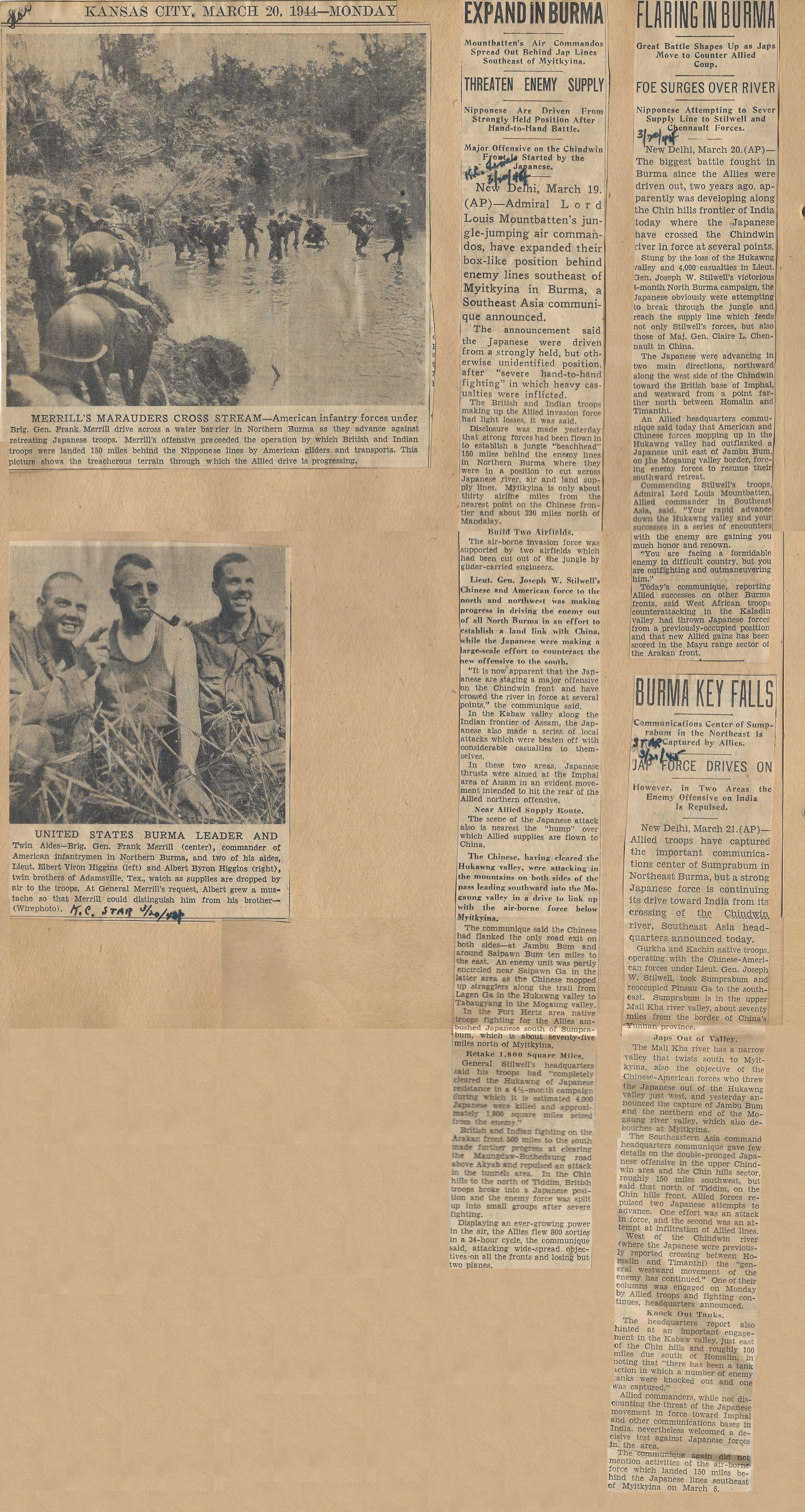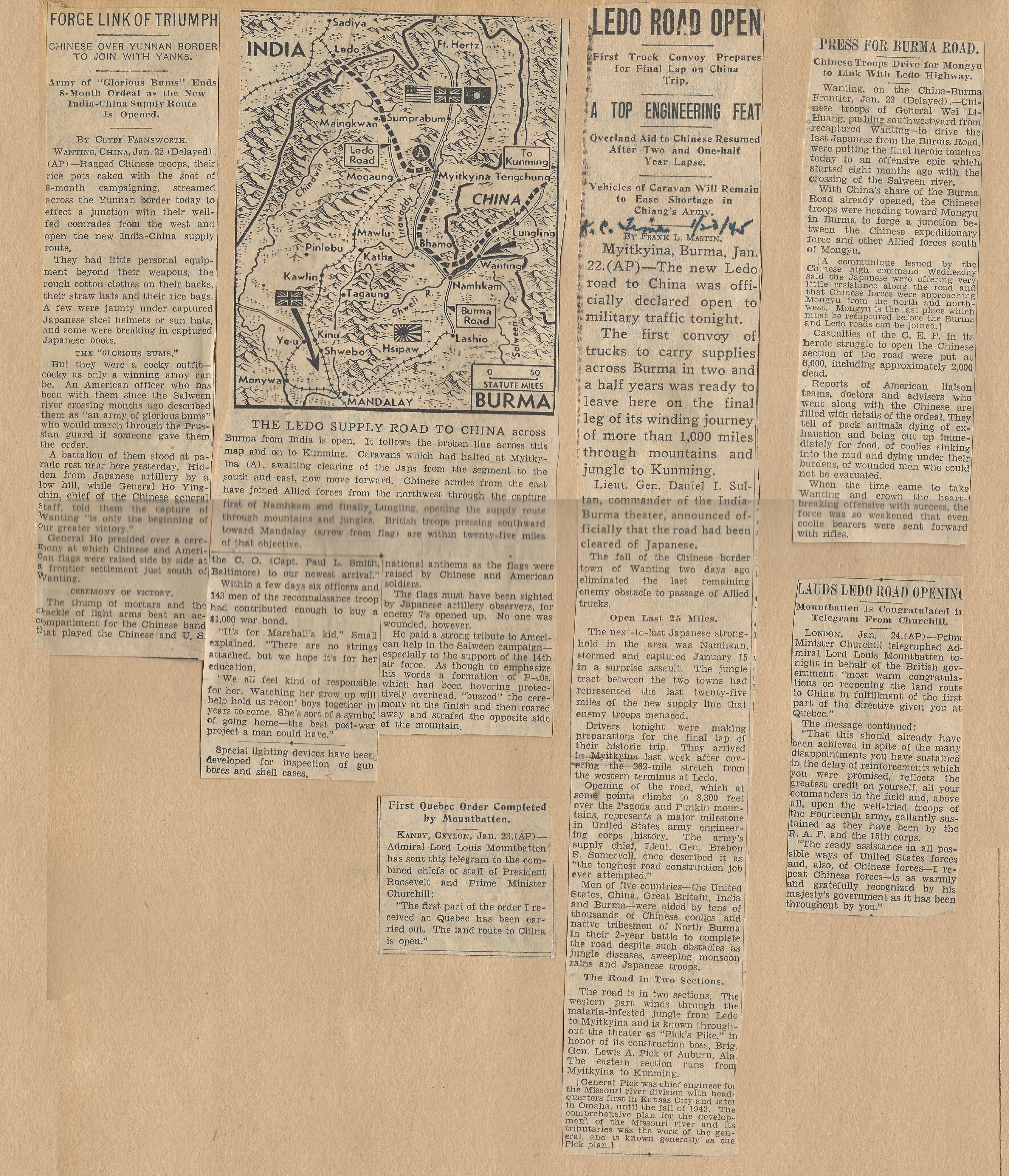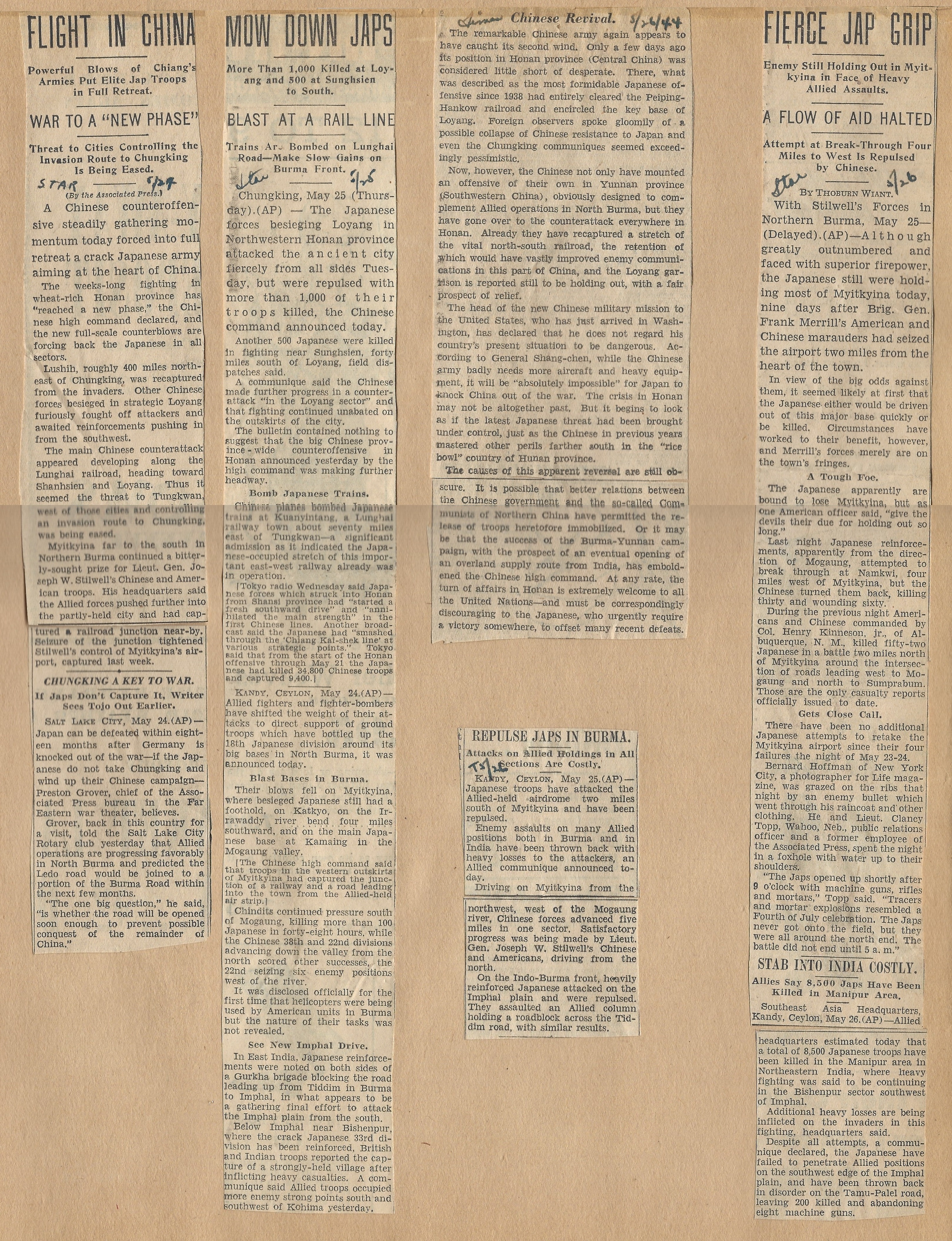 | Introduction In 1941, while war raged in Europe, most Americans preferred the country remain neutral and isolated from the conflict. That all changed on December 7th when the Japanese attacked Pearl Harbor and declared war on the United States. Just about every American was involved in the war, either being called to service in the armed forces, working in war production or other supporting roles. There were plenty of Moms who saw their sons off to some far-off place to fight. One such mom of Kansas City, Missouri, Josephine Smith Davis, saved newspaper articles about where her son was serving in a scrapbook. That place was the China-Burma-India Theater and her son was Lt. Col. Charles S. Davis. Below are the scrapbook pages filled with the CBI-related newspaper clippings she saved. For more about Col. Davis and his service in CBI - CLICK HERE Viewing Instructions Scroll down to view individual pages of the scrapbook. Click on the displayed page to open a new window with an enlarged image of that page. This image is more easily readable being 175% the size of the original. You can scroll up/down/left/right. Click on the image to close the window and return to this main page. Note that each page can be several scans pieced together and there may be some distortion where the scans were joined. To view all pages expanded - CLICK HERE Scroll down or click this box to continue to first page |