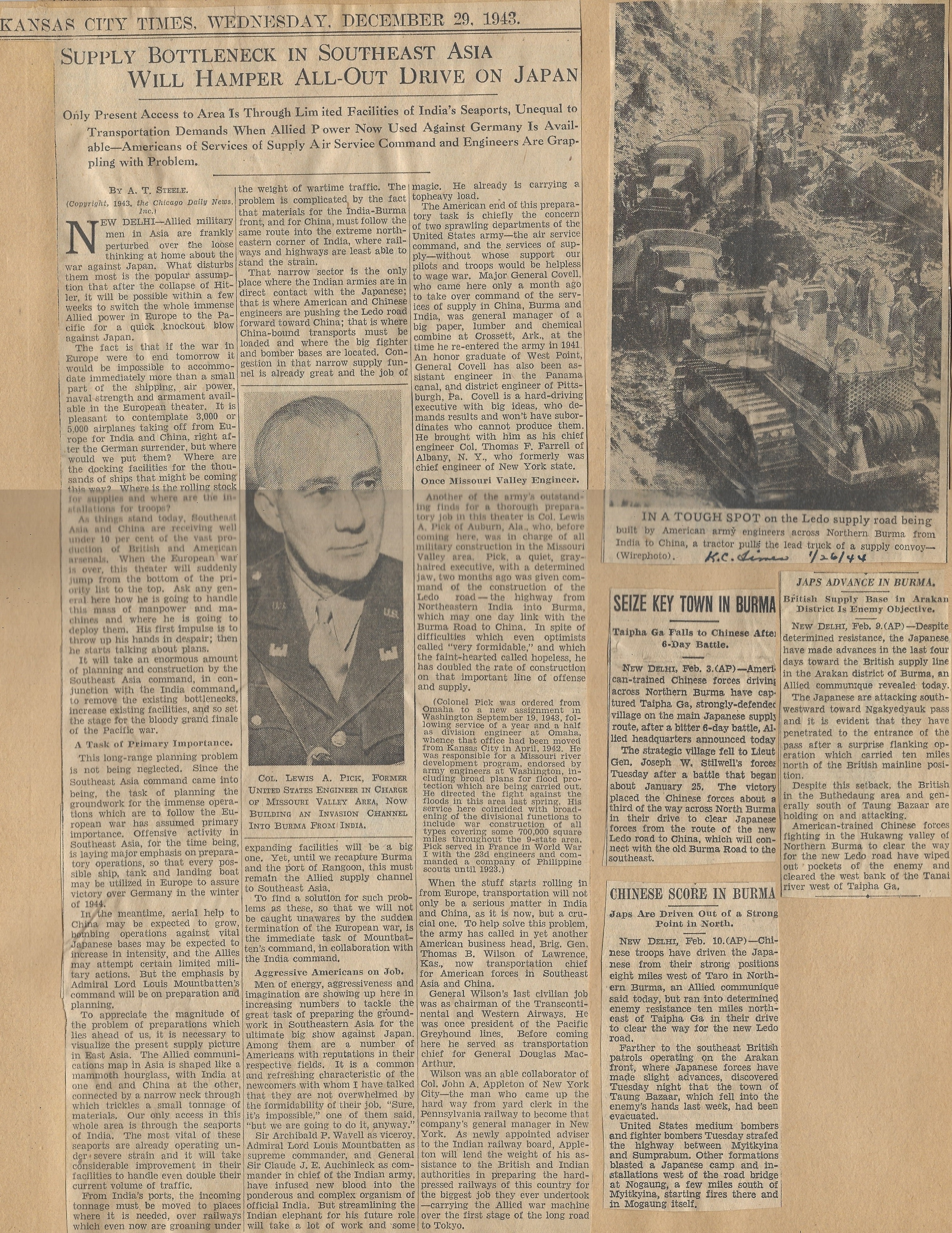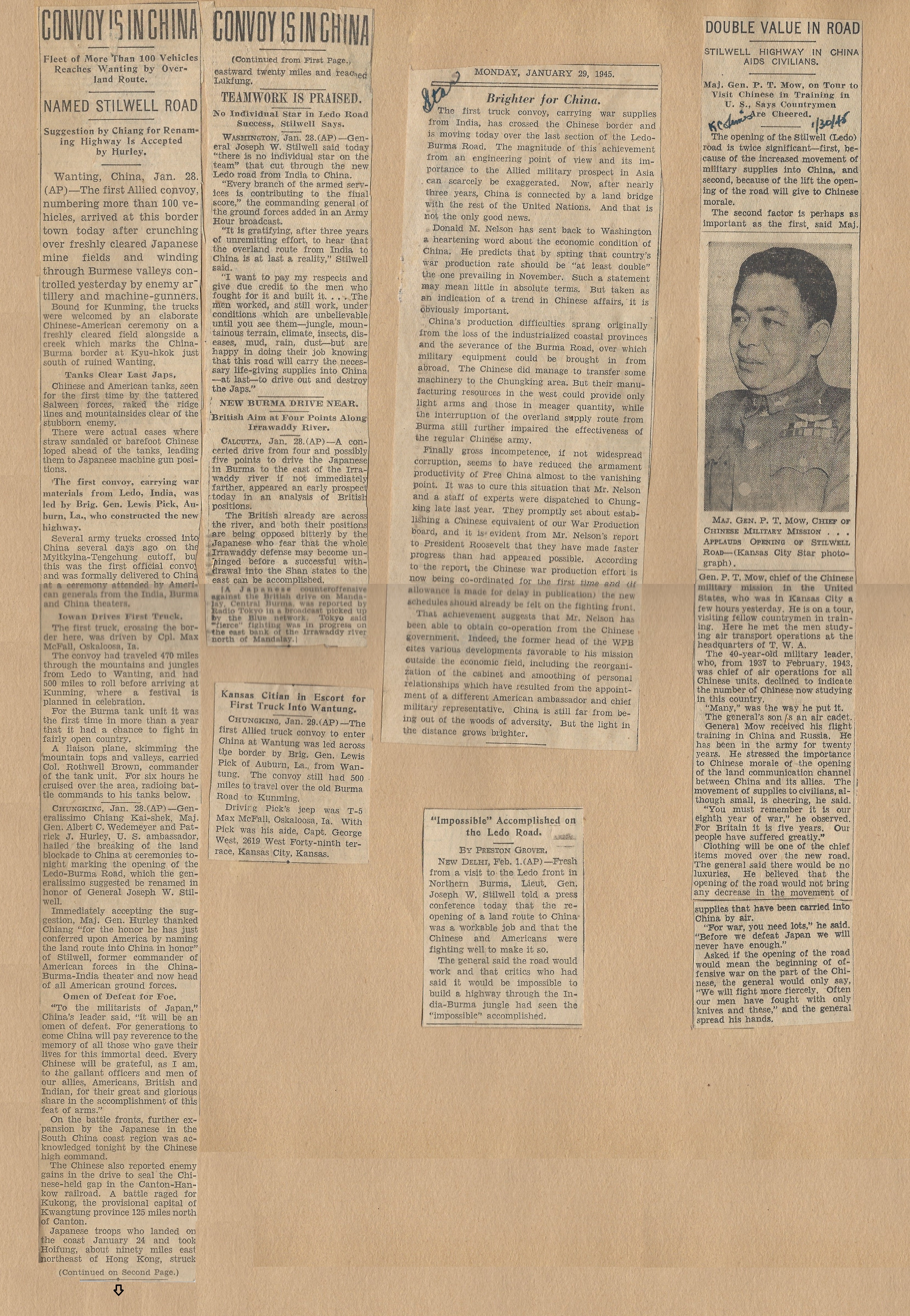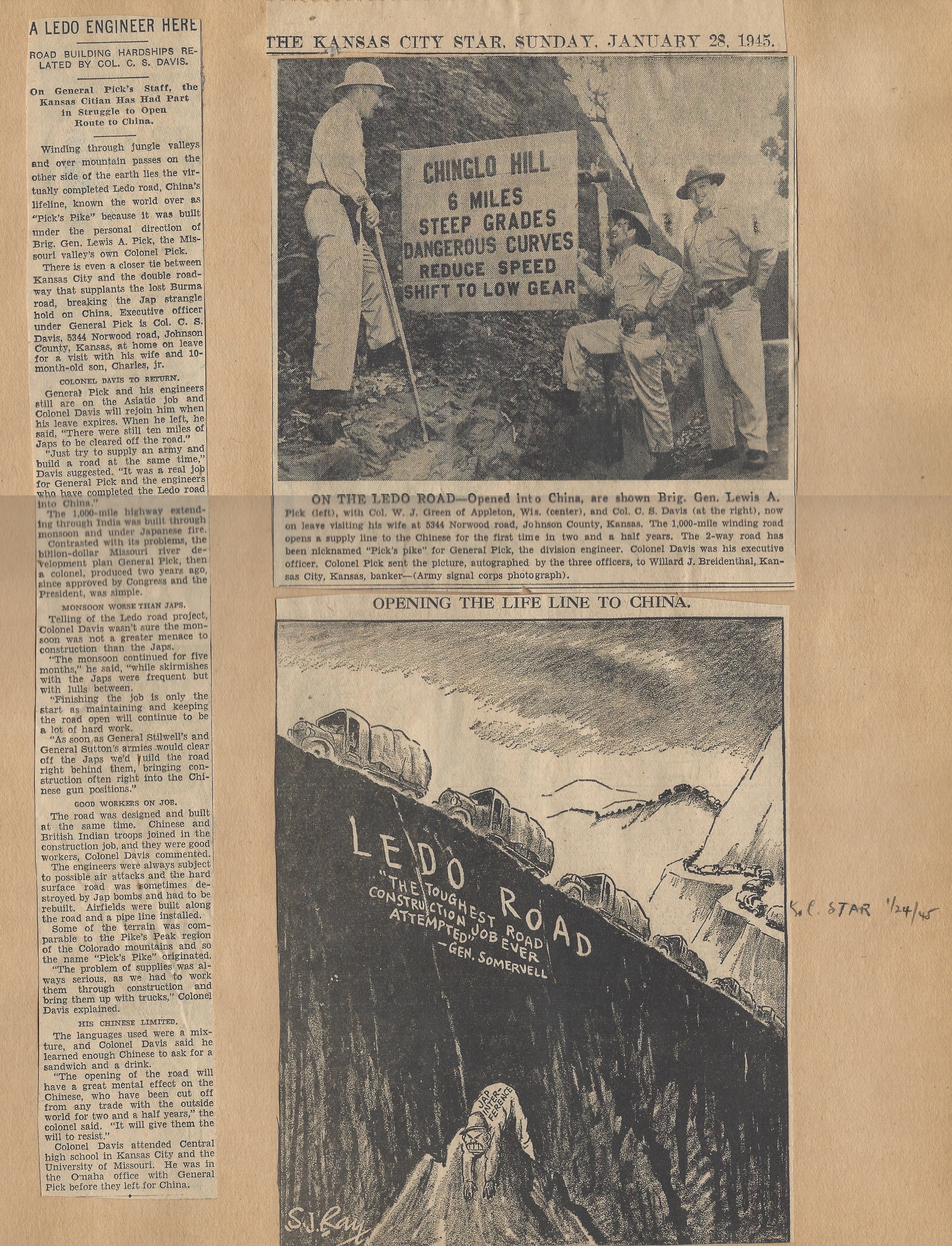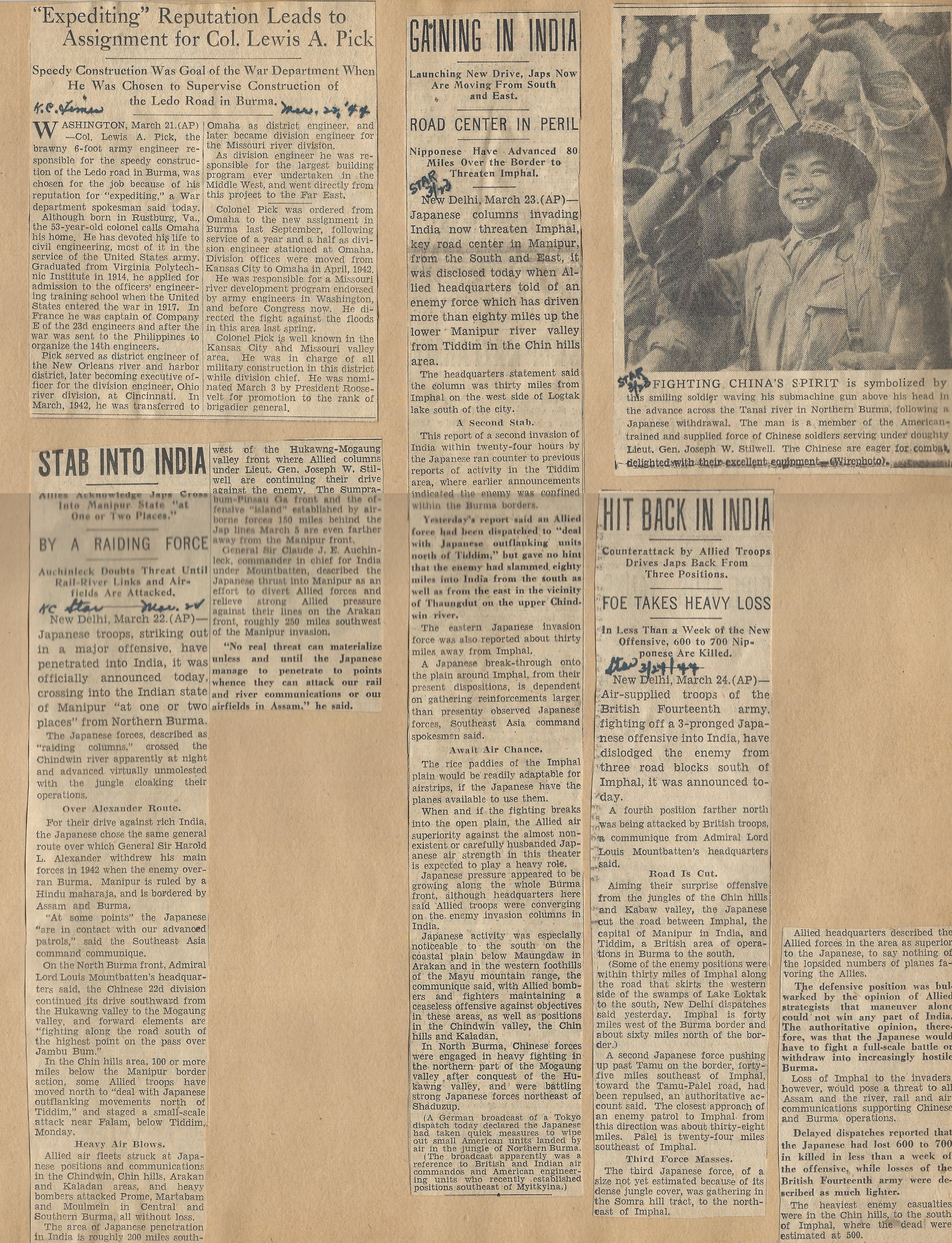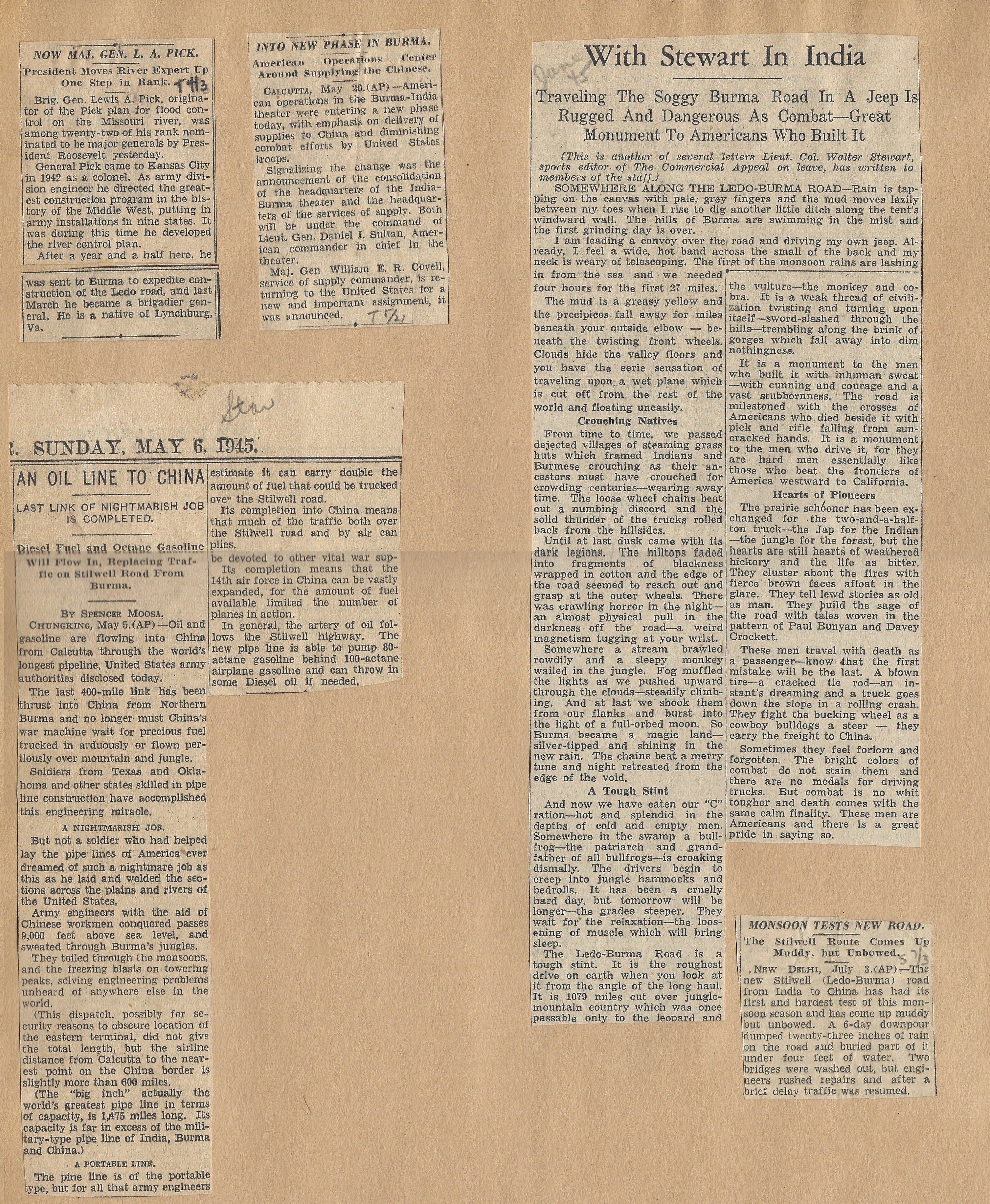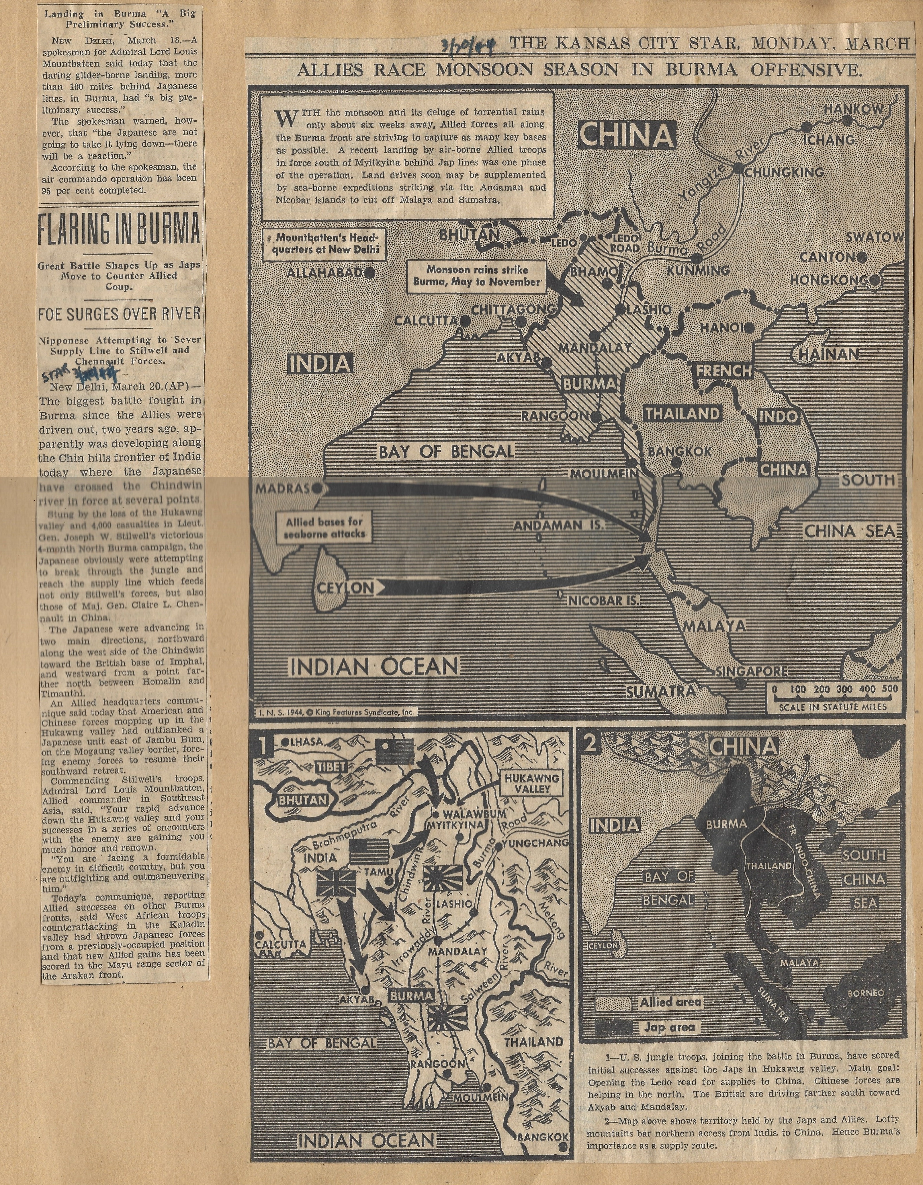 | Introduction In 1941, while war raged in Europe, most Americans preferred the country remain neutral and isolated from the conflict. That all changed on December 7th when the Japanese attacked Pearl Harbor and declared war on the United States. Just about every American was involved in the war, either being called to service in the armed forces, working in war production or other supporting roles. There were plenty of Moms who saw their sons off to some far-off place to fight. One such mom of Kansas City, Missouri, Josephine Smith Davis, saved newspaper articles about where her son was serving in a scrapbook. That place was the China-Burma-India Theater and her son was Lt. Col. Charles S. Davis. Below are the scrapbook pages filled with the CBI-related newspaper clippings she saved. For more about Col. Davis and his service in CBI - CLICK HERE Viewing Instructions Scroll down to view individual pages of the scrapbook. Click on the displayed page to open a new window with an enlarged image of that page. This image is more easily readable being 175% the size of the original. You can scroll up/down/left/right. Click on the image to close the window and return to this main page. Note that each page can be several scans pieced together and there may be some distortion where the scans were joined. To view all pages expanded - CLICK HERE Scroll down or click this box to continue to first page |