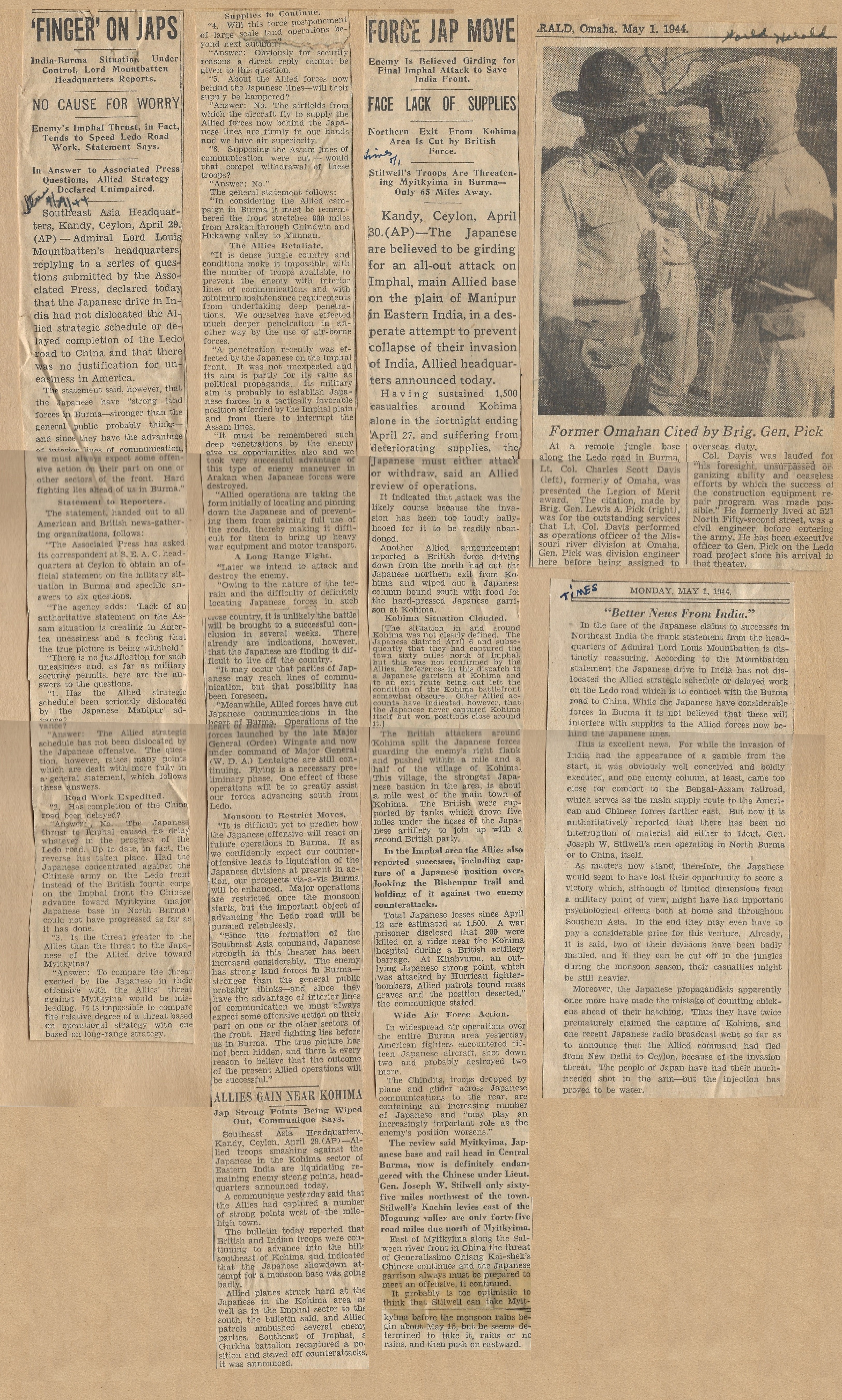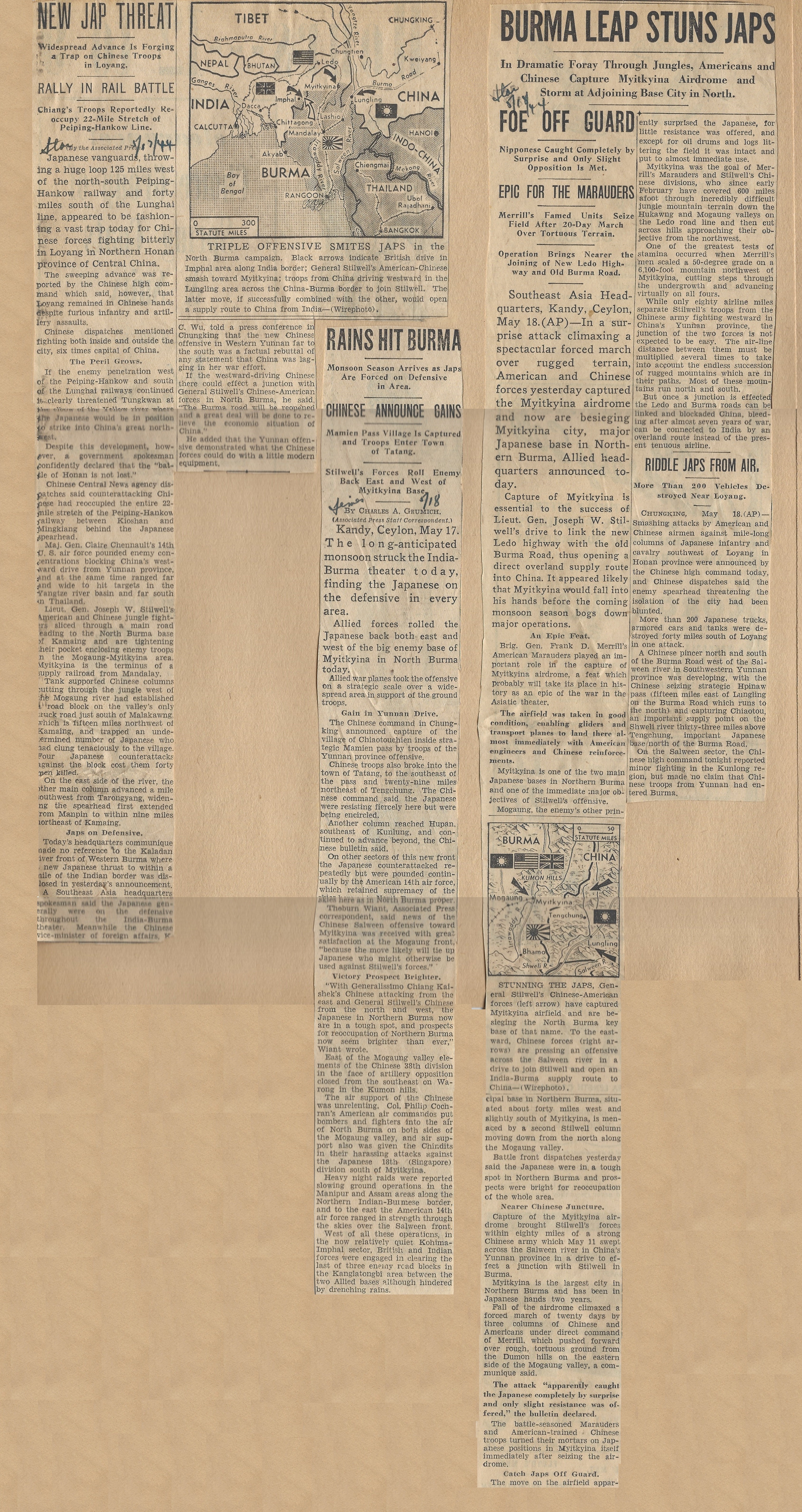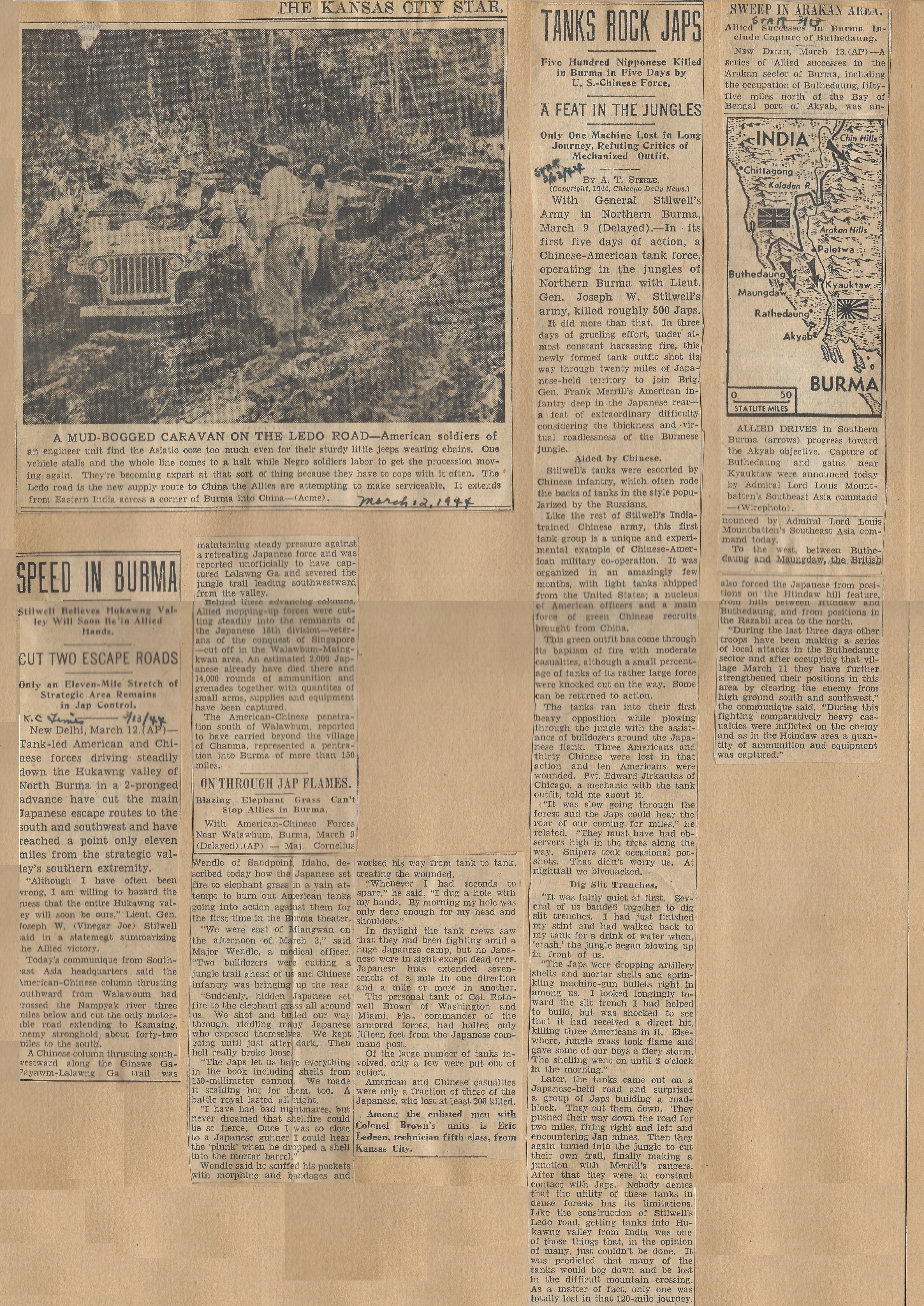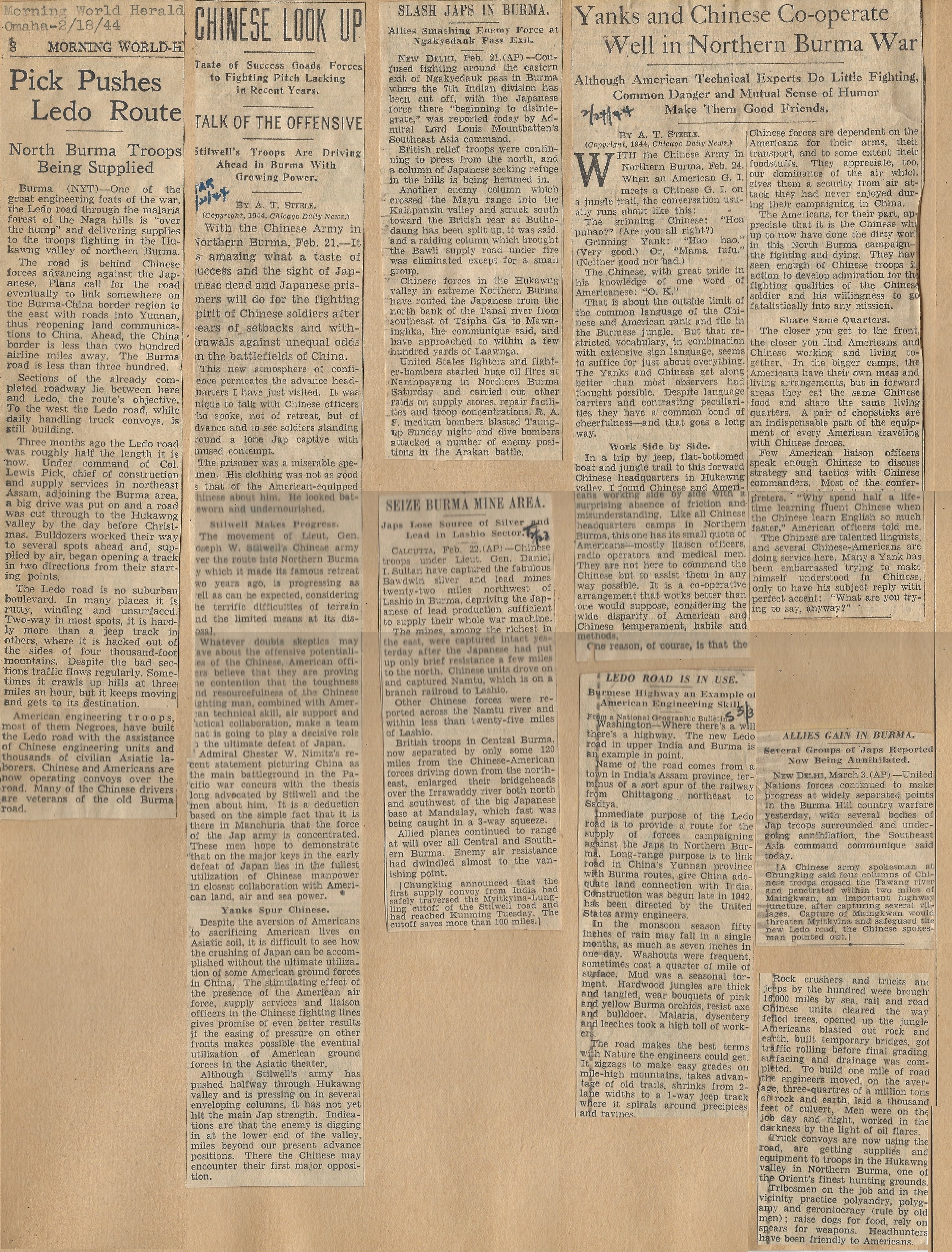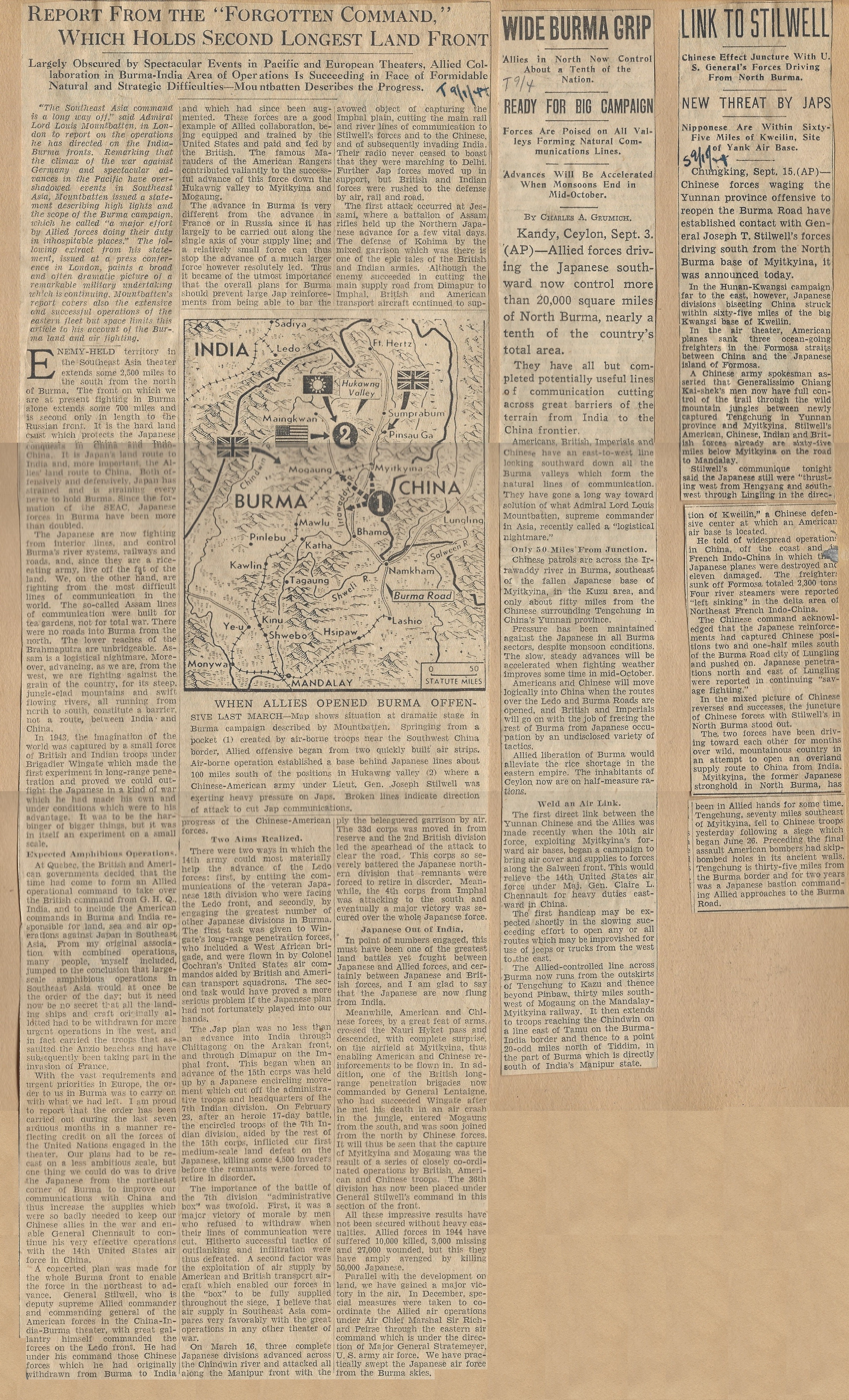 | Introduction In 1941, while war raged in Europe, most Americans preferred the country remain neutral and isolated from the conflict. That all changed on December 7th when the Japanese attacked Pearl Harbor and declared war on the United States. Just about every American was involved in the war, either being called to service in the armed forces, working in war production or other supporting roles. There were plenty of Moms who saw their sons off to some far-off place to fight. One such mom of Kansas City, Missouri, Josephine Smith Davis, saved newspaper articles about where her son was serving in a scrapbook. That place was the China-Burma-India Theater and her son was Lt. Col. Charles S. Davis. Below are the scrapbook pages filled with the CBI-related newspaper clippings she saved. For more about Col. Davis and his service in CBI - CLICK HERE Viewing Instructions Scroll down to view individual pages of the scrapbook. Click on the displayed page to open a new window with an enlarged image of that page. This image is more easily readable being 175% the size of the original. You can scroll up/down/left/right. Click on the image to close the window and return to this main page. Note that each page can be several scans pieced together and there may be some distortion where the scans were joined. To view all pages expanded - CLICK HERE Scroll down or click this box to continue to first page |