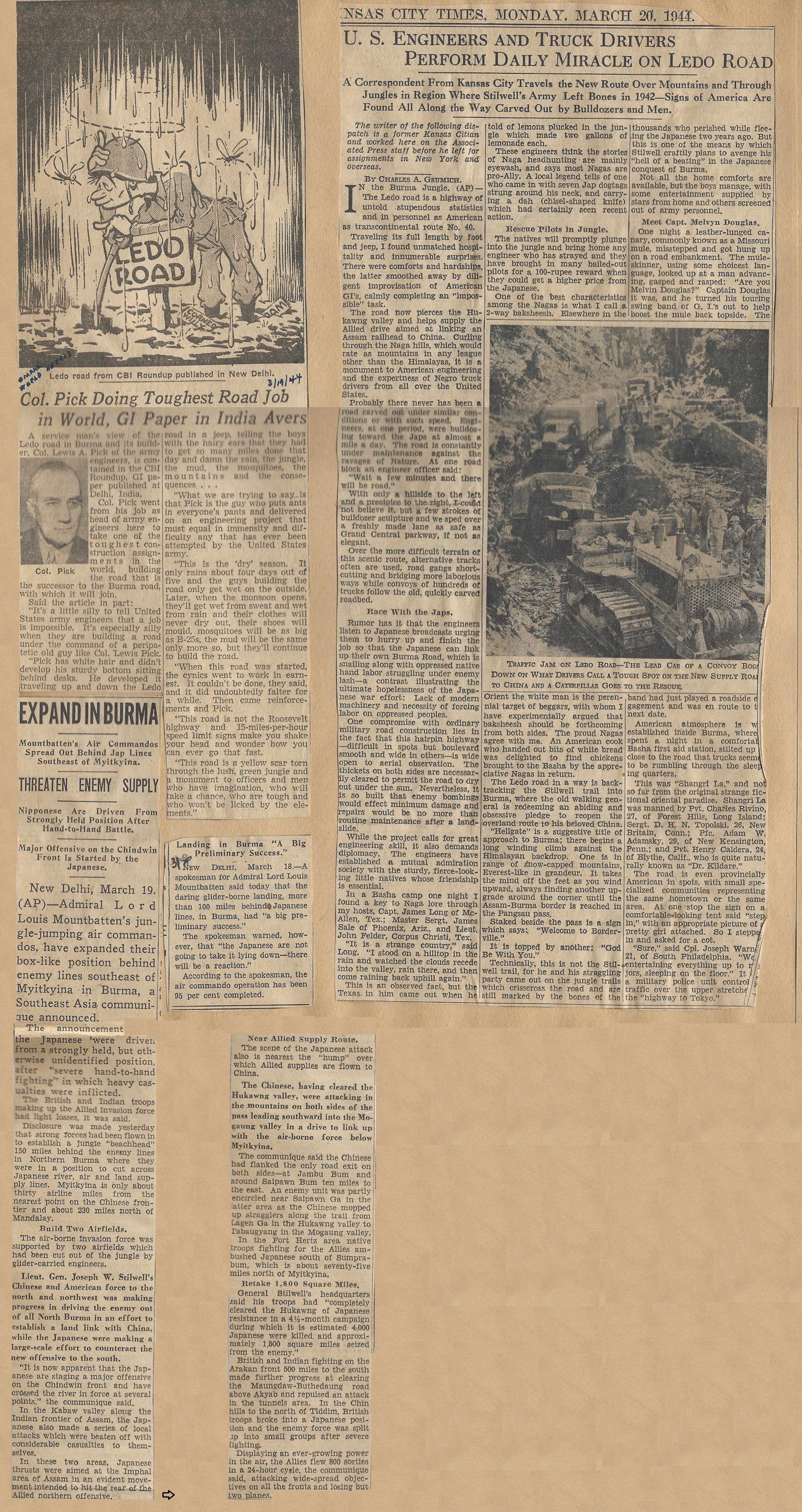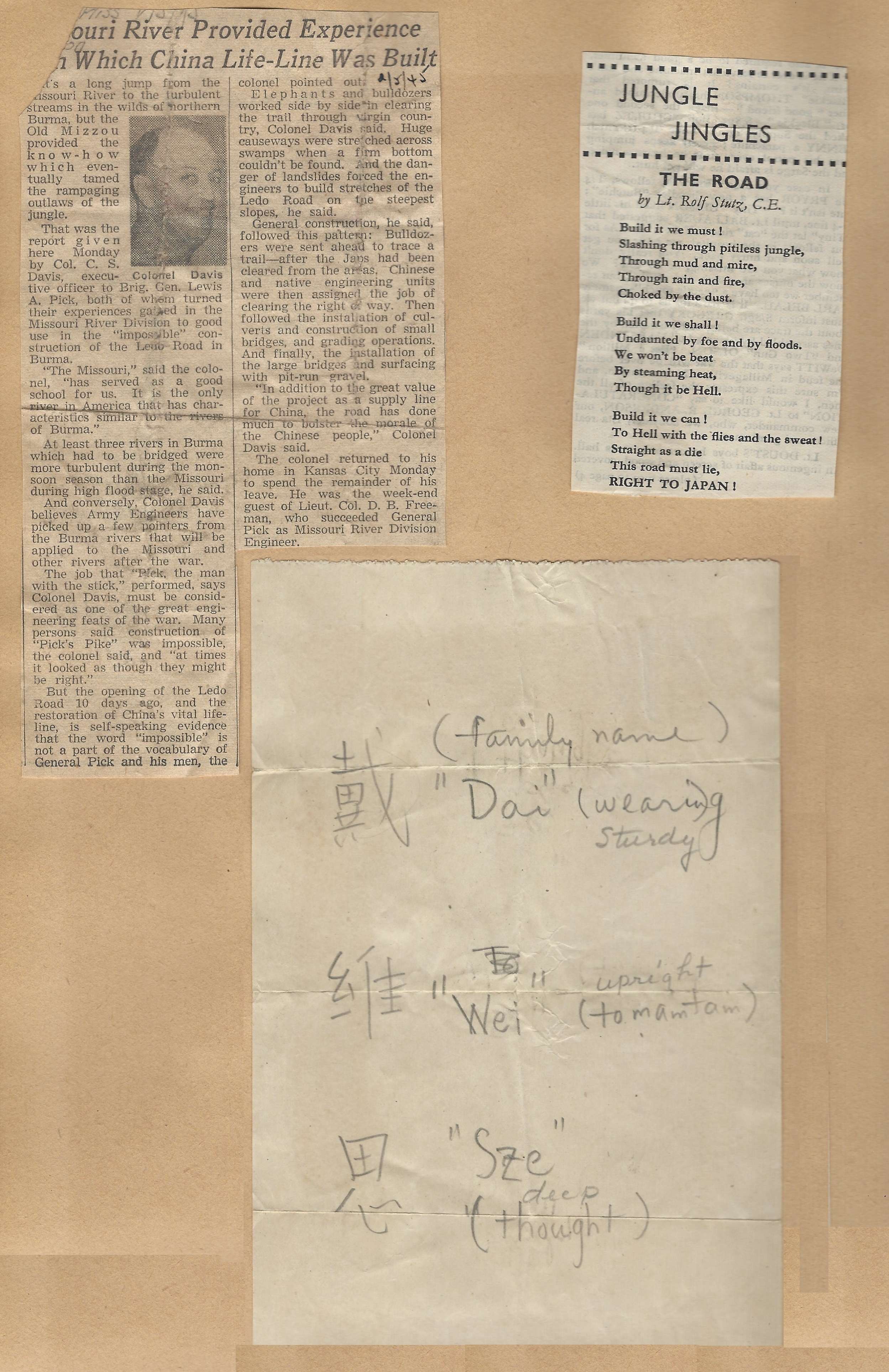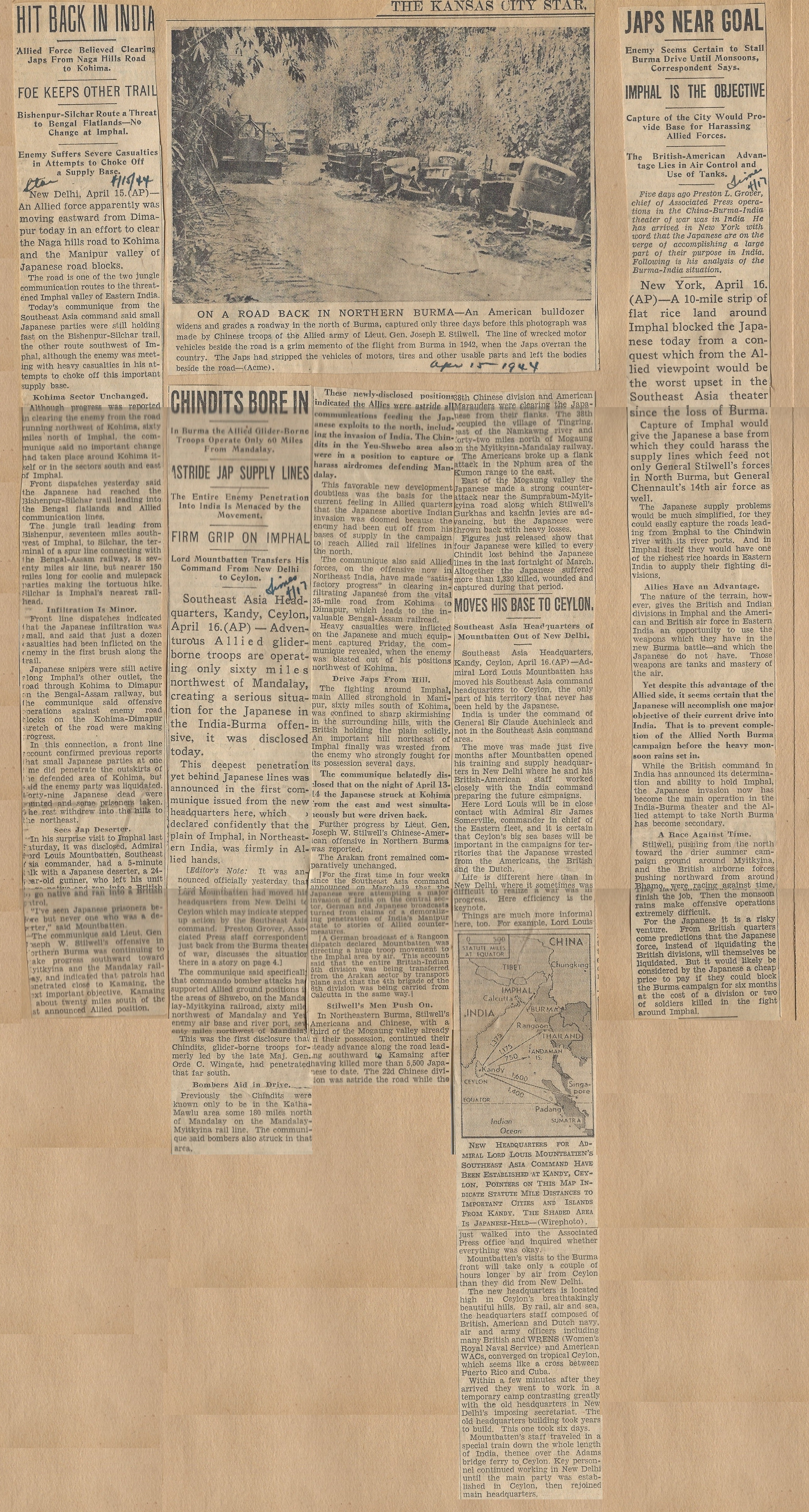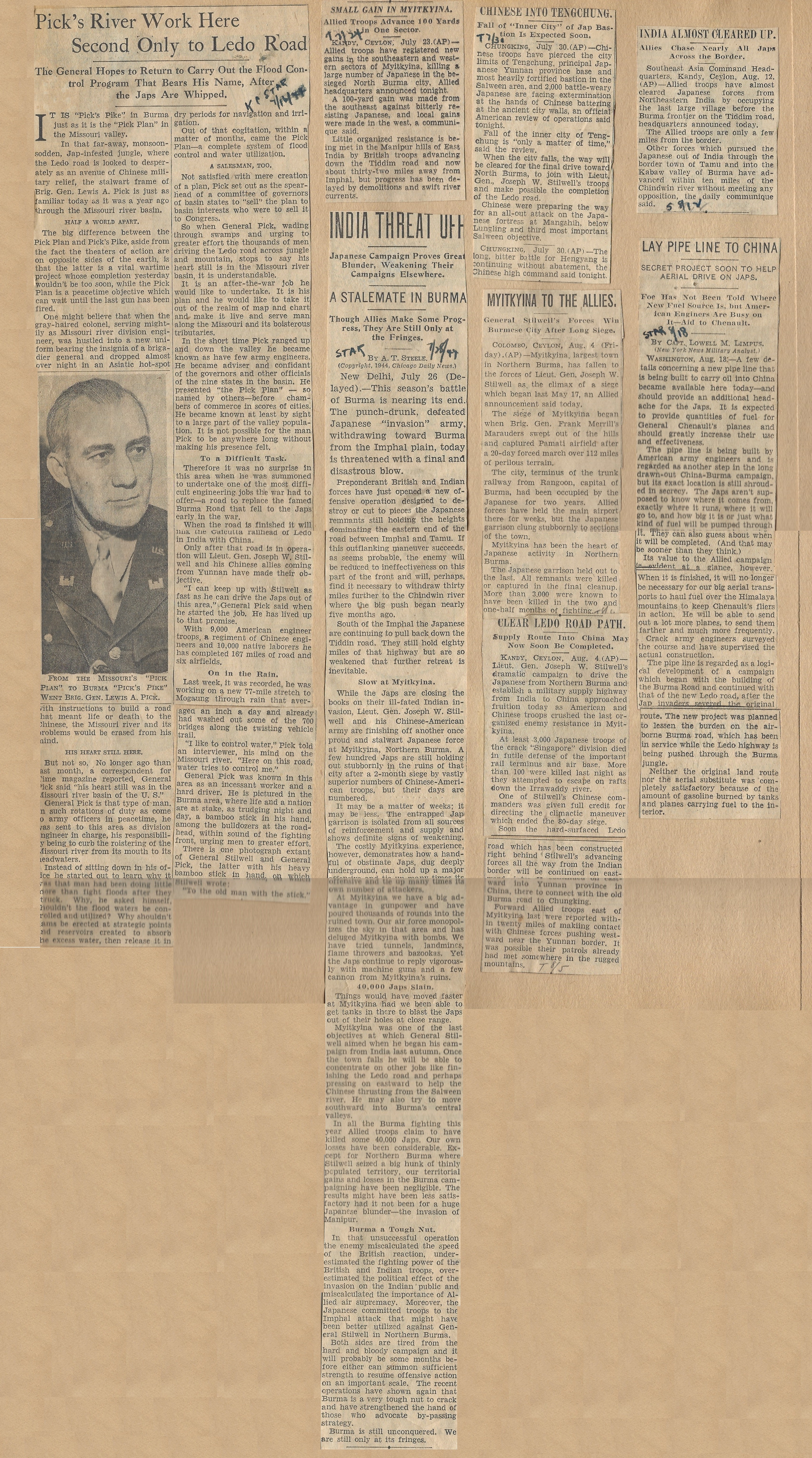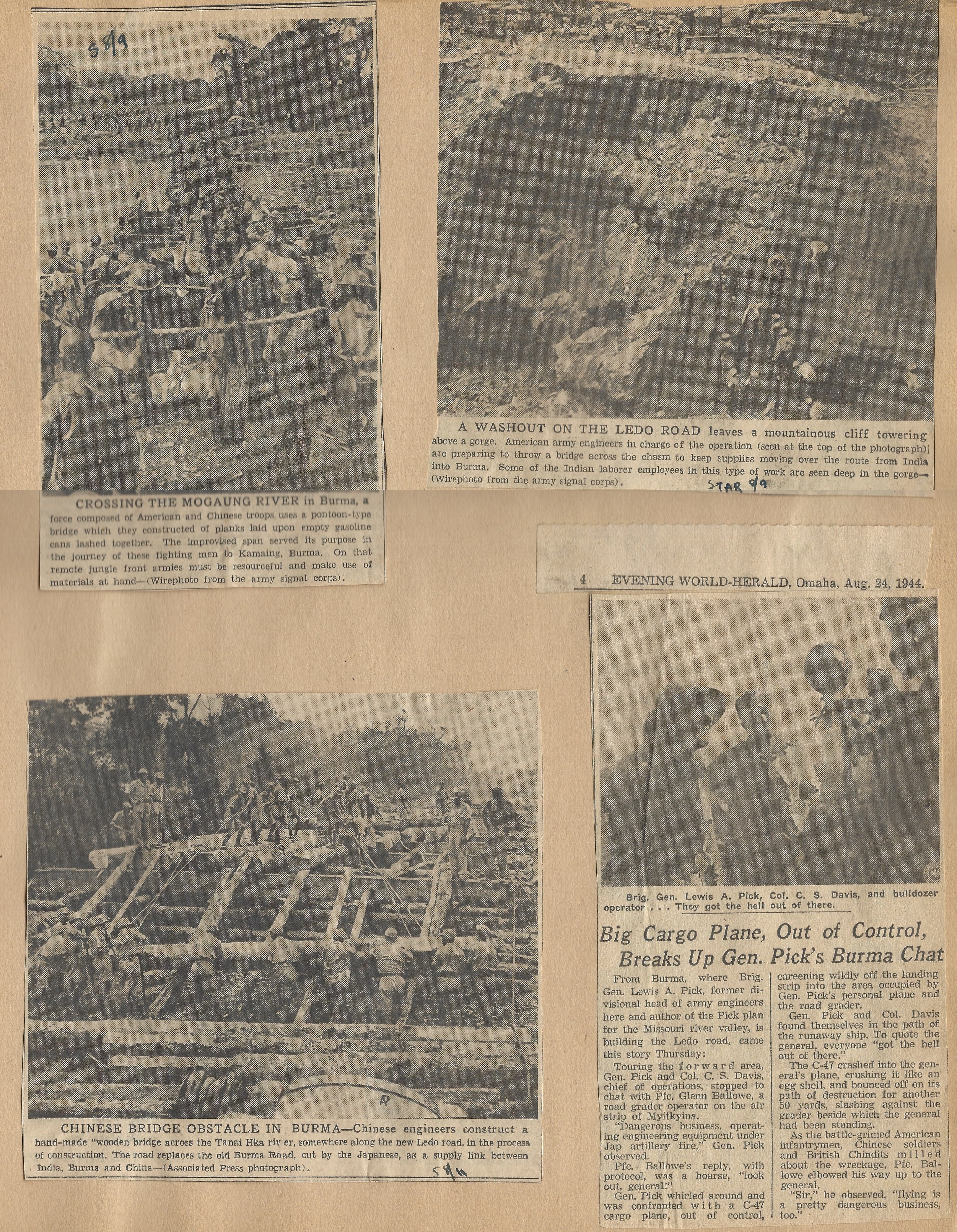 | Introduction In 1941, while war raged in Europe, most Americans preferred the country remain neutral and isolated from the conflict. That all changed on December 7th when the Japanese attacked Pearl Harbor and declared war on the United States. Just about every American was involved in the war, either being called to service in the armed forces, working in war production or other supporting roles. There were plenty of Moms who saw their sons off to some far-off place to fight. One such mom of Kansas City, Missouri, Josephine Smith Davis, saved newspaper articles about where her son was serving in a scrapbook. That place was the China-Burma-India Theater and her son was Lt. Col. Charles S. Davis. Below are the scrapbook pages filled with the CBI-related newspaper clippings she saved. For more about Col. Davis and his service in CBI - CLICK HERE Viewing Instructions Scroll down to view individual pages of the scrapbook. Click on the displayed page to open a new window with an enlarged image of that page. This image is more easily readable being 175% the size of the original. You can scroll up/down/left/right. Click on the image to close the window and return to this main page. Note that each page can be several scans pieced together and there may be some distortion where the scans were joined. To view all pages expanded - CLICK HERE Scroll down or click this box to continue to first page |
