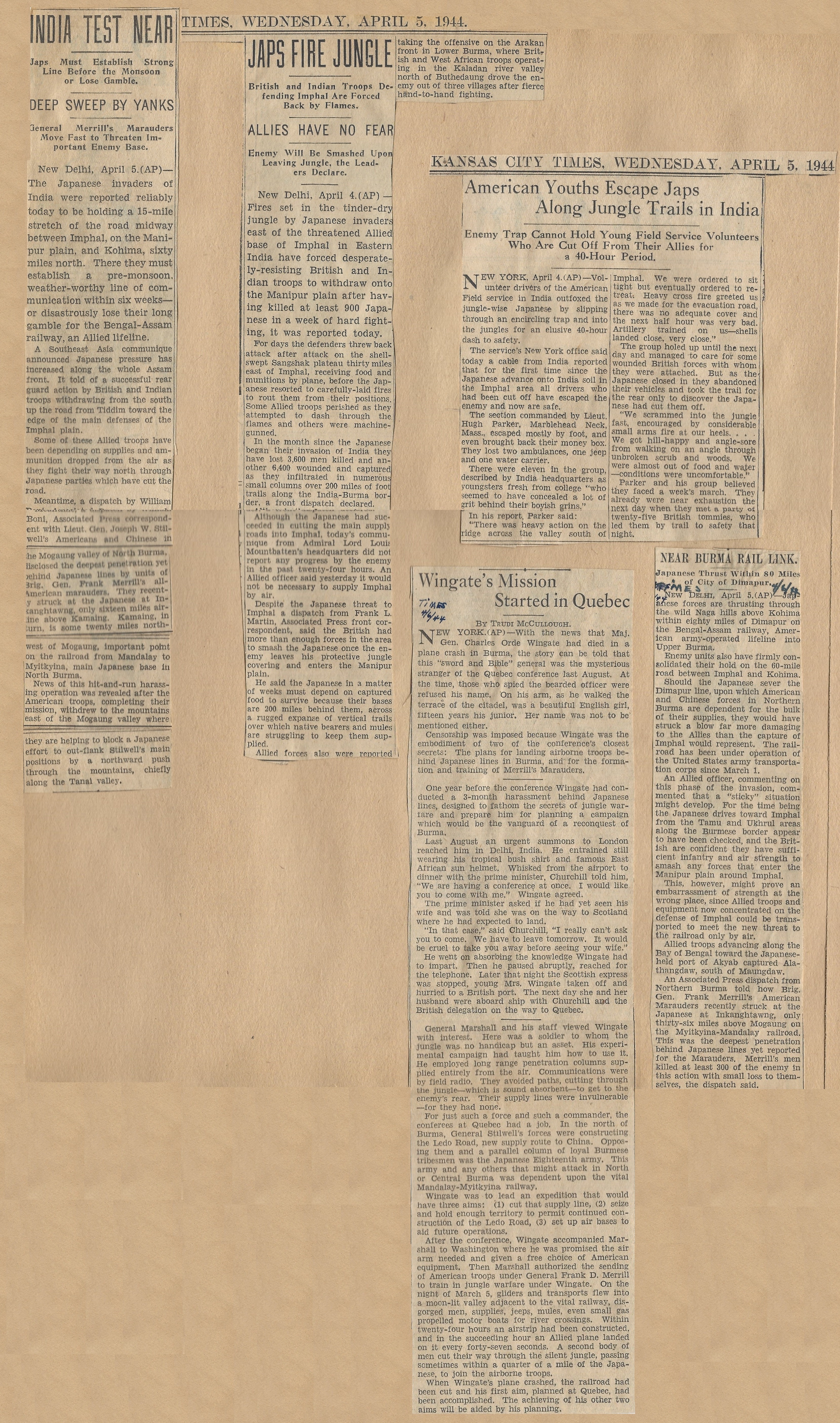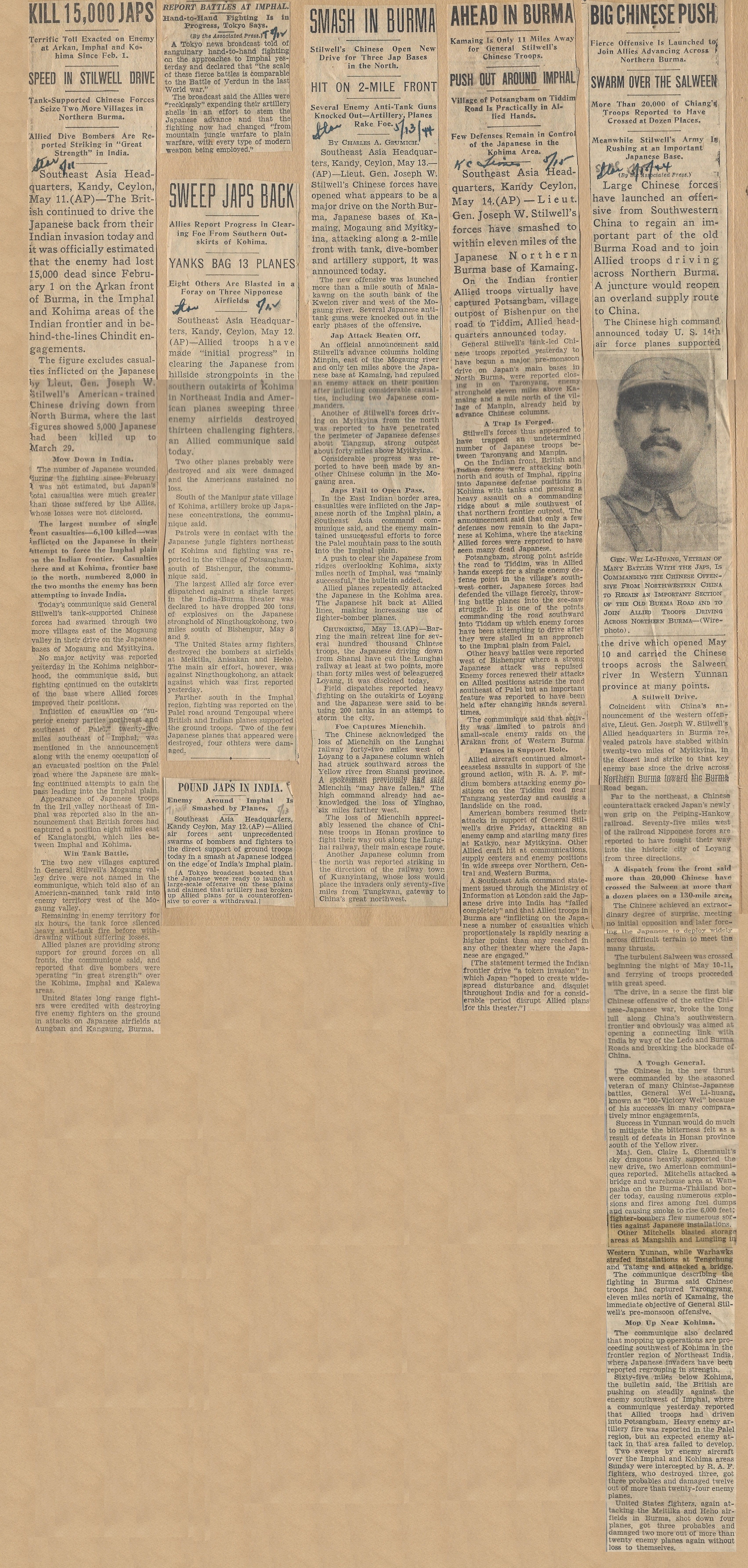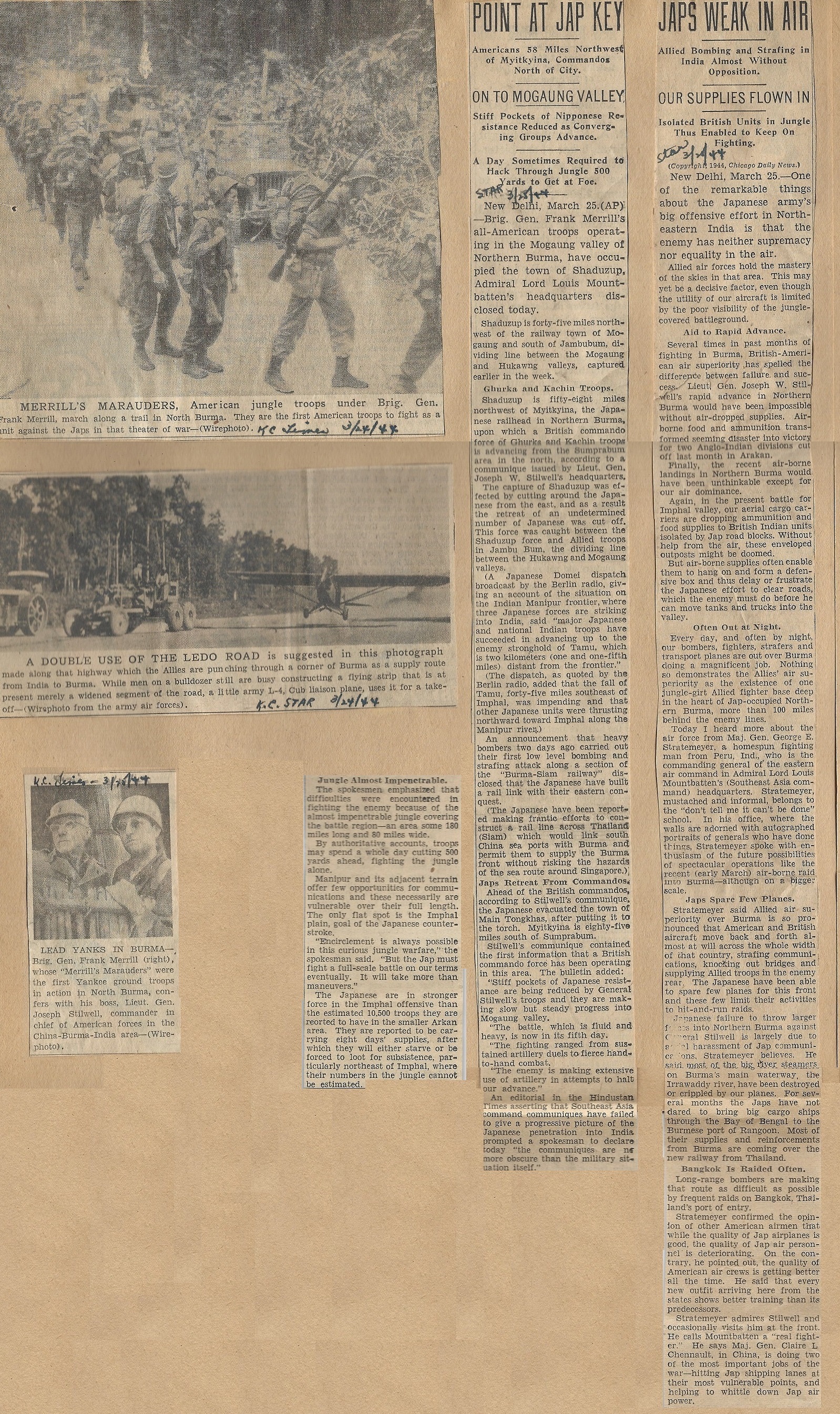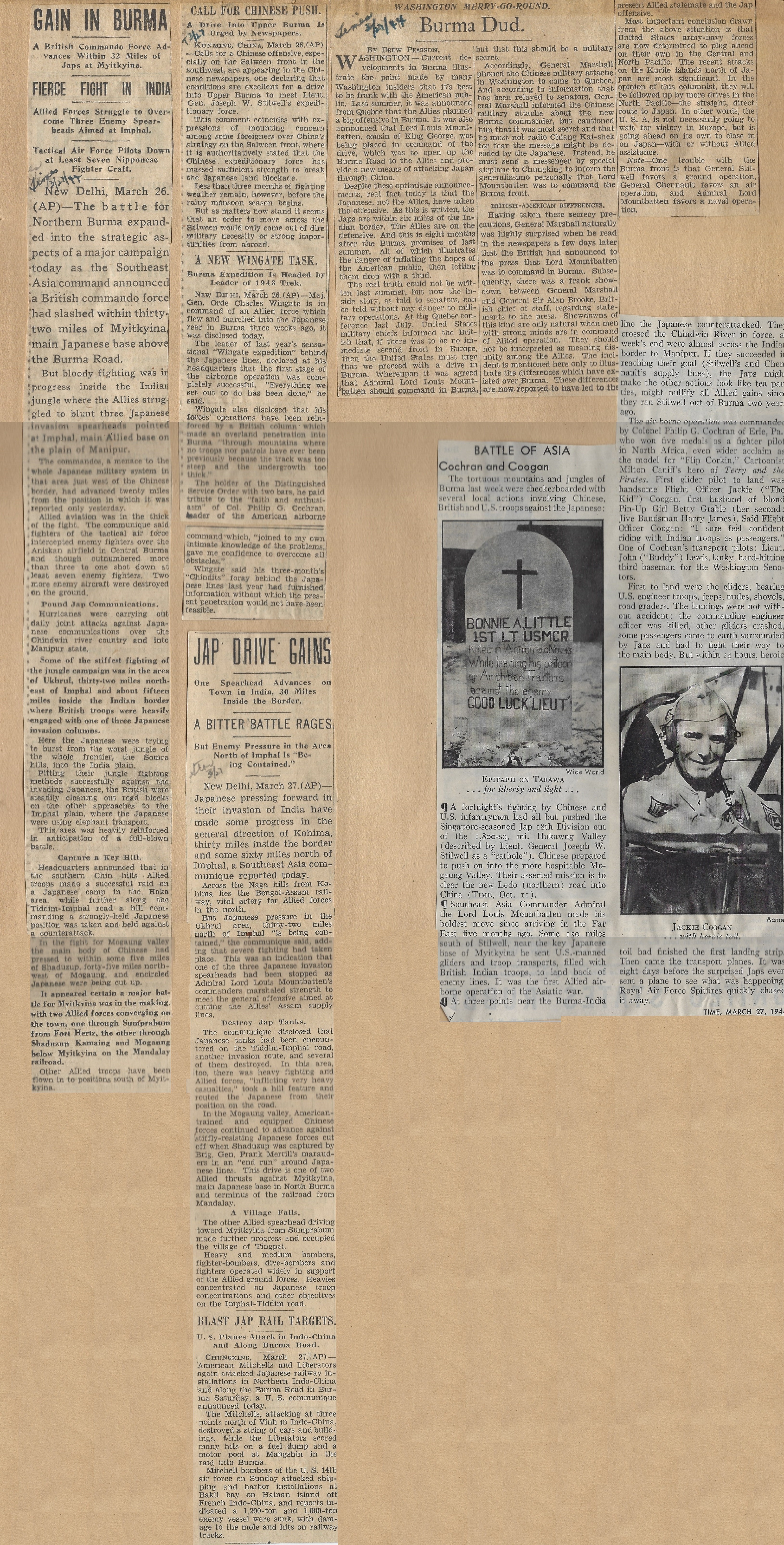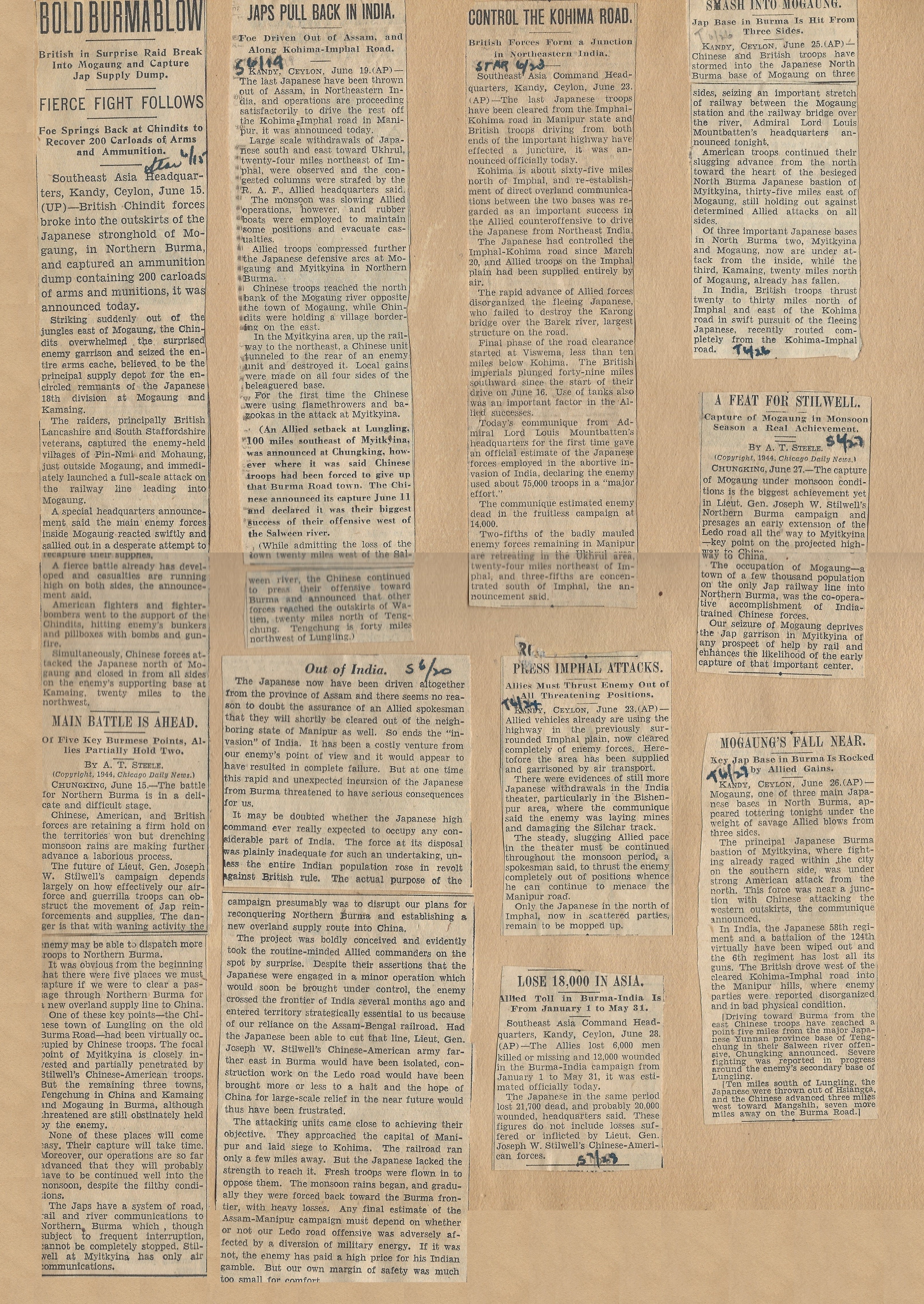 | Introduction In 1941, while war raged in Europe, most Americans preferred the country remain neutral and isolated from the conflict. That all changed on December 7th when the Japanese attacked Pearl Harbor and declared war on the United States. Just about every American was involved in the war, either being called to service in the armed forces, working in war production or other supporting roles. There were plenty of Moms who saw their sons off to some far-off place to fight. One such mom of Kansas City, Missouri, Josephine Smith Davis, saved newspaper articles about where her son was serving in a scrapbook. That place was the China-Burma-India Theater and her son was Lt. Col. Charles S. Davis. Below are the scrapbook pages filled with the CBI-related newspaper clippings she saved. For more about Col. Davis and his service in CBI - CLICK HERE Viewing Instructions Scroll down to view individual pages of the scrapbook. Click on the displayed page to open a new window with an enlarged image of that page. This image is more easily readable being 175% the size of the original. You can scroll up/down/left/right. Click on the image to close the window and return to this main page. Note that each page can be several scans pieced together and there may be some distortion where the scans were joined. To view all pages expanded - CLICK HERE Scroll down or click this box to continue to first page |