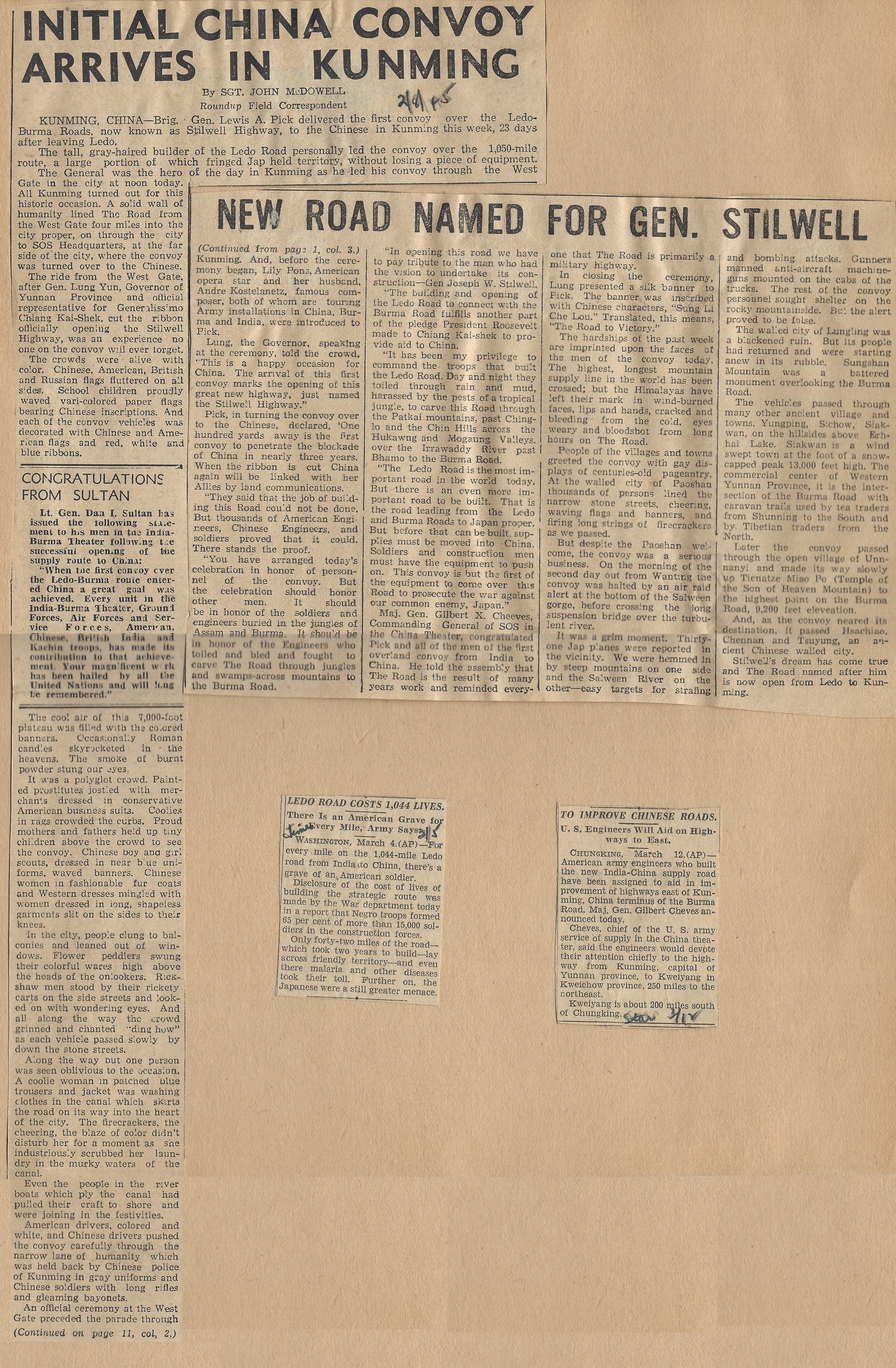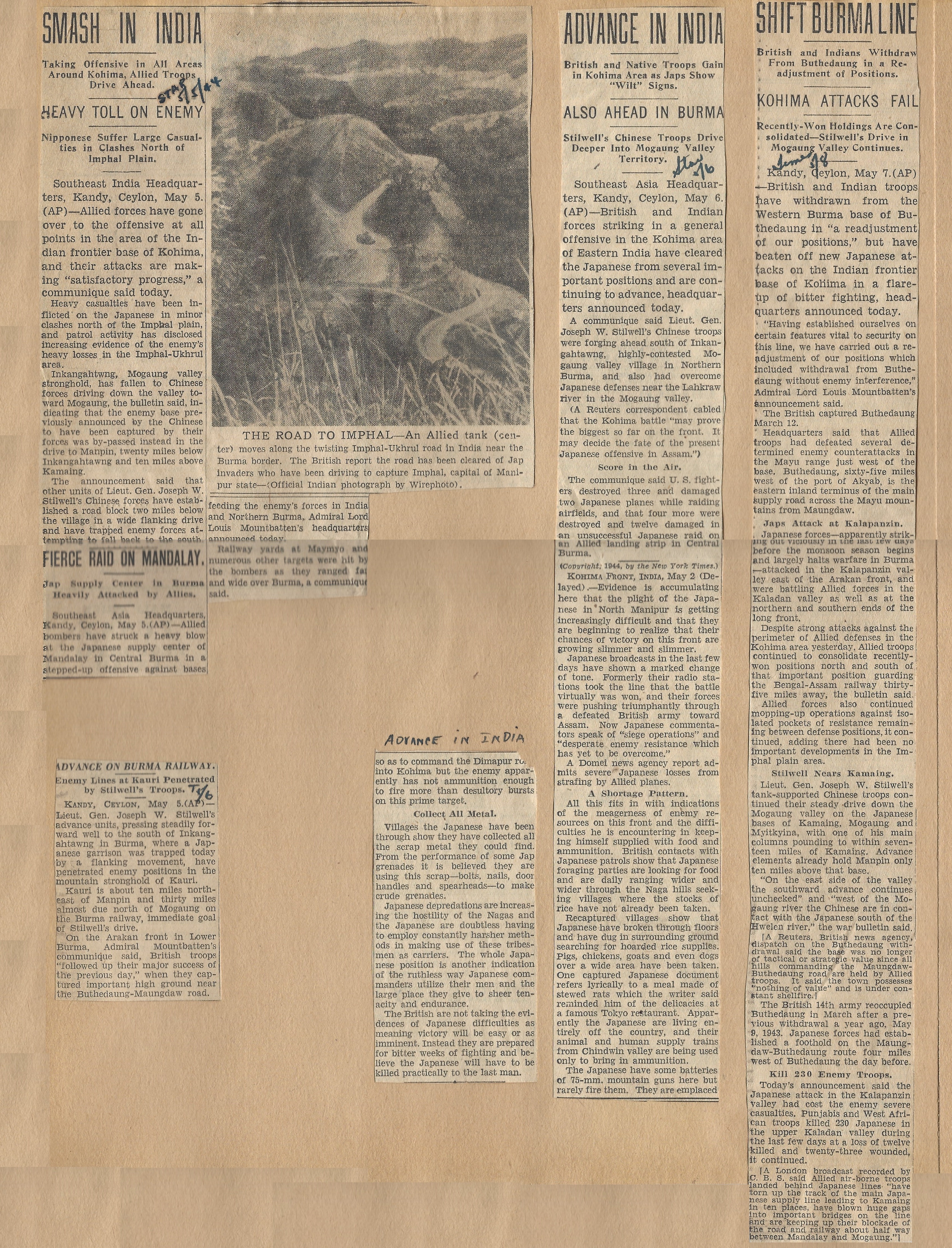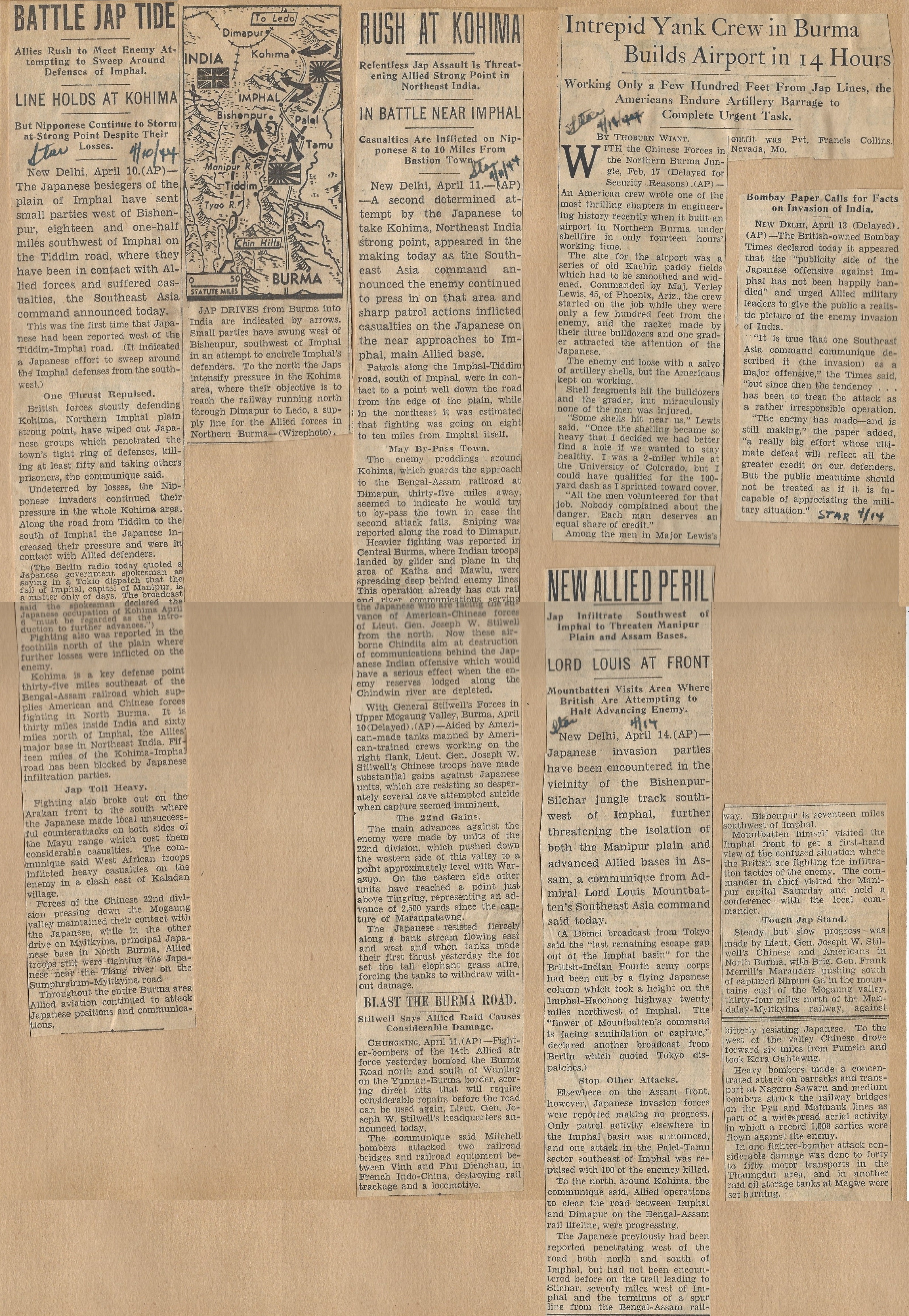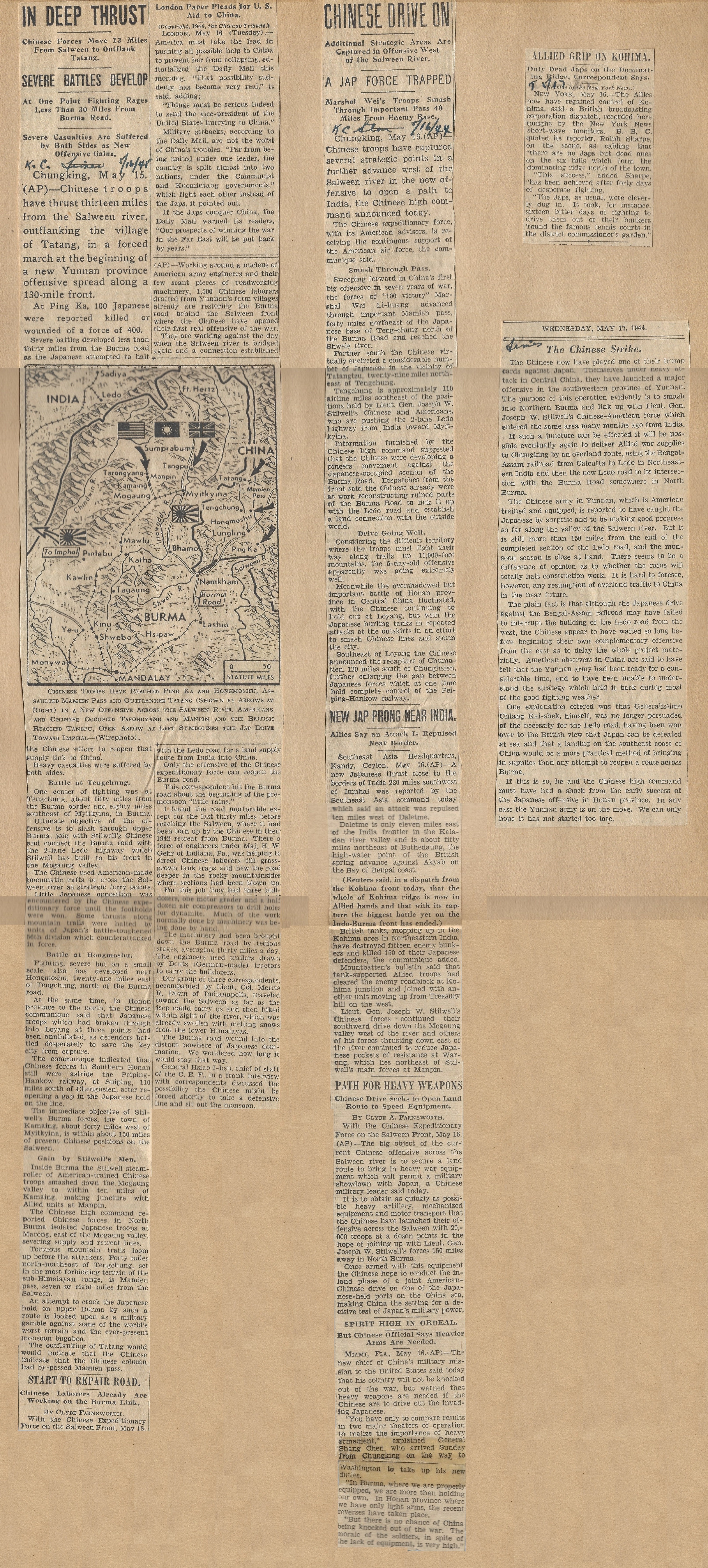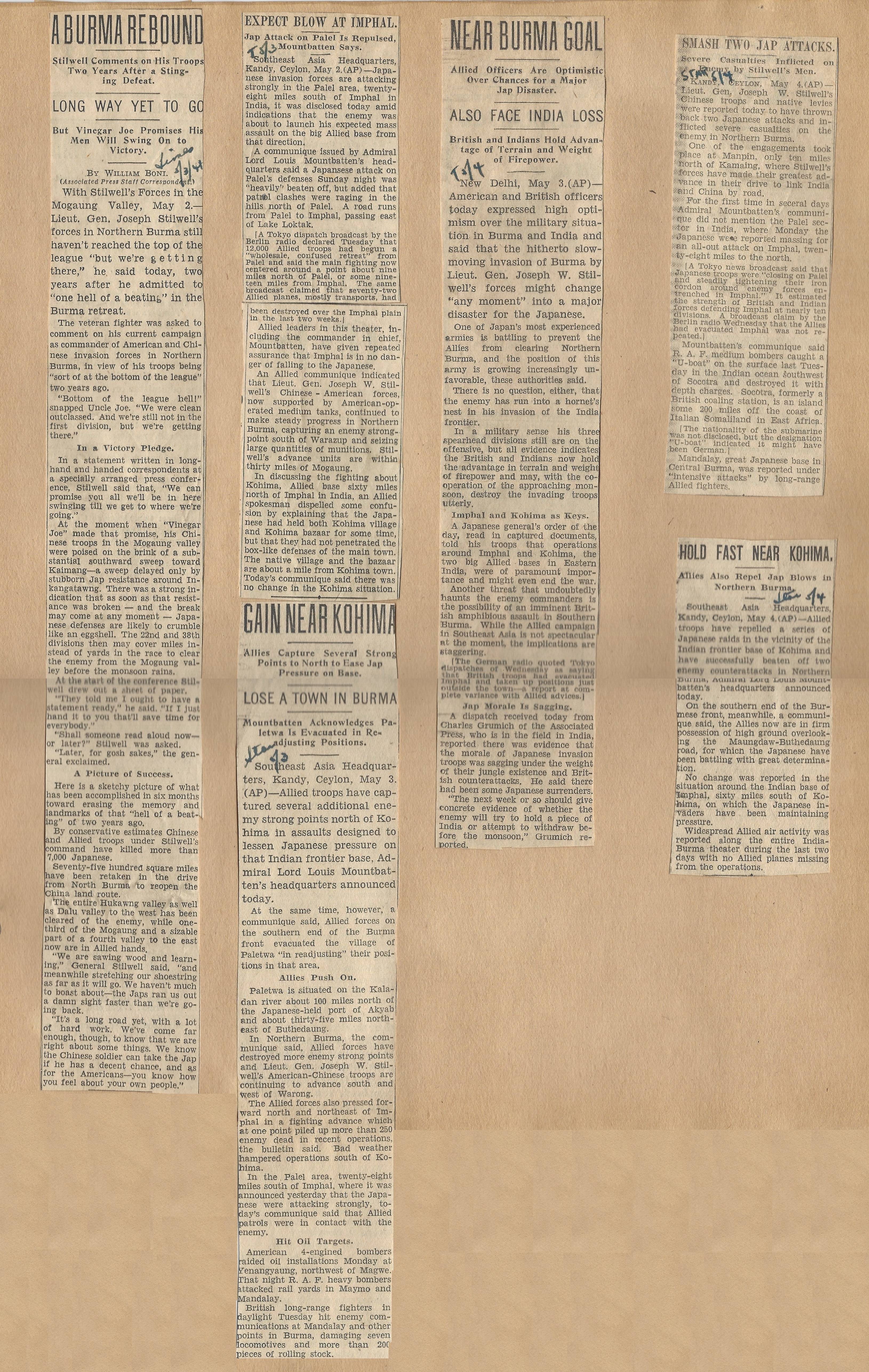 | Introduction In 1941, while war raged in Europe, most Americans preferred the country remain neutral and isolated from the conflict. That all changed on December 7th when the Japanese attacked Pearl Harbor and declared war on the United States. Just about every American was involved in the war, either being called to service in the armed forces, working in war production or other supporting roles. There were plenty of Moms who saw their sons off to some far-off place to fight. One such mom of Kansas City, Missouri, Josephine Smith Davis, saved newspaper articles about where her son was serving in a scrapbook. That place was the China-Burma-India Theater and her son was Lt. Col. Charles S. Davis. Below are the scrapbook pages filled with the CBI-related newspaper clippings she saved. For more about Col. Davis and his service in CBI - CLICK HERE Viewing Instructions Scroll down to view individual pages of the scrapbook. Click on the displayed page to open a new window with an enlarged image of that page. This image is more easily readable being 175% the size of the original. You can scroll up/down/left/right. Click on the image to close the window and return to this main page. Note that each page can be several scans pieced together and there may be some distortion where the scans were joined. To view all pages expanded - CLICK HERE Scroll down or click this box to continue to first page |