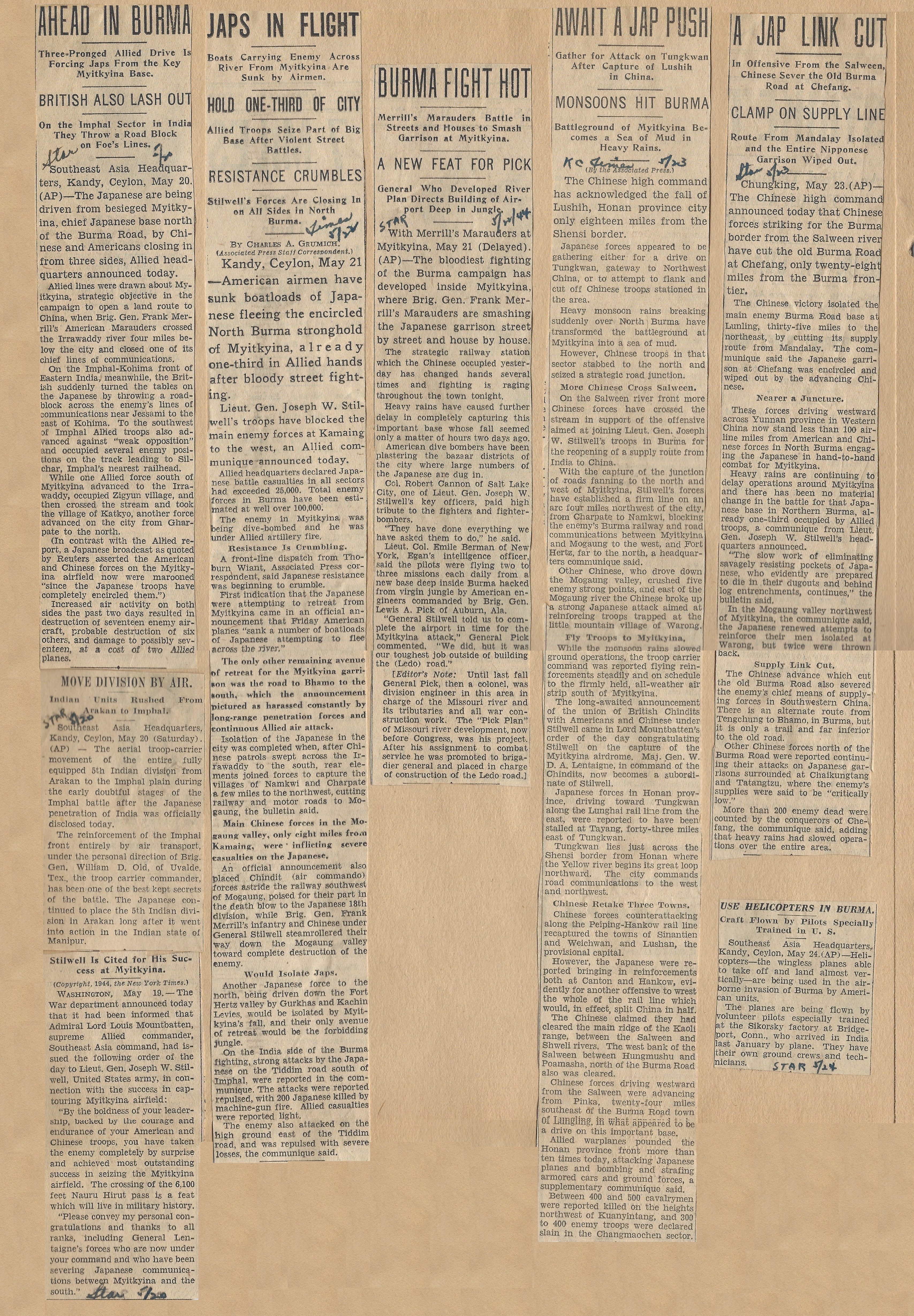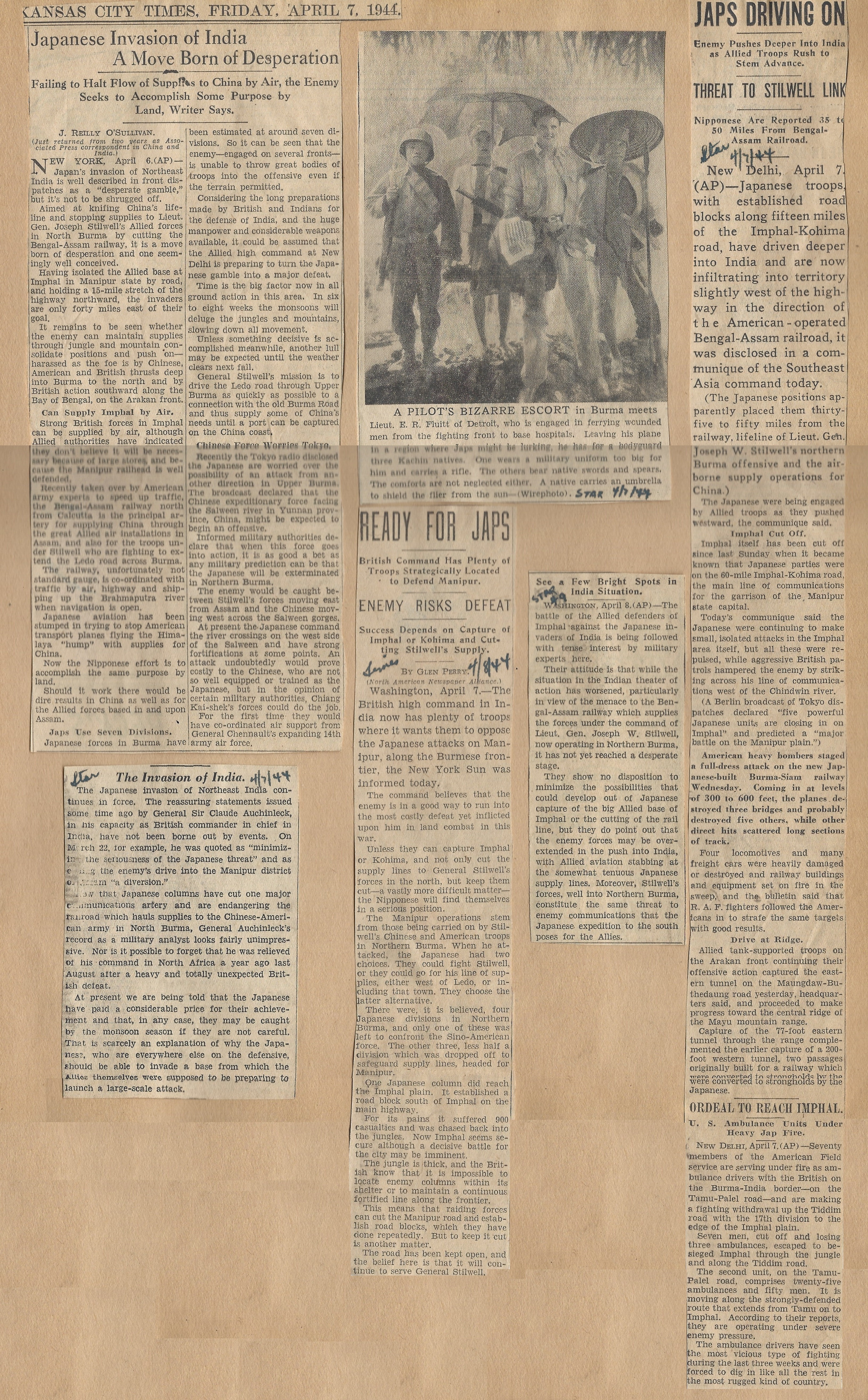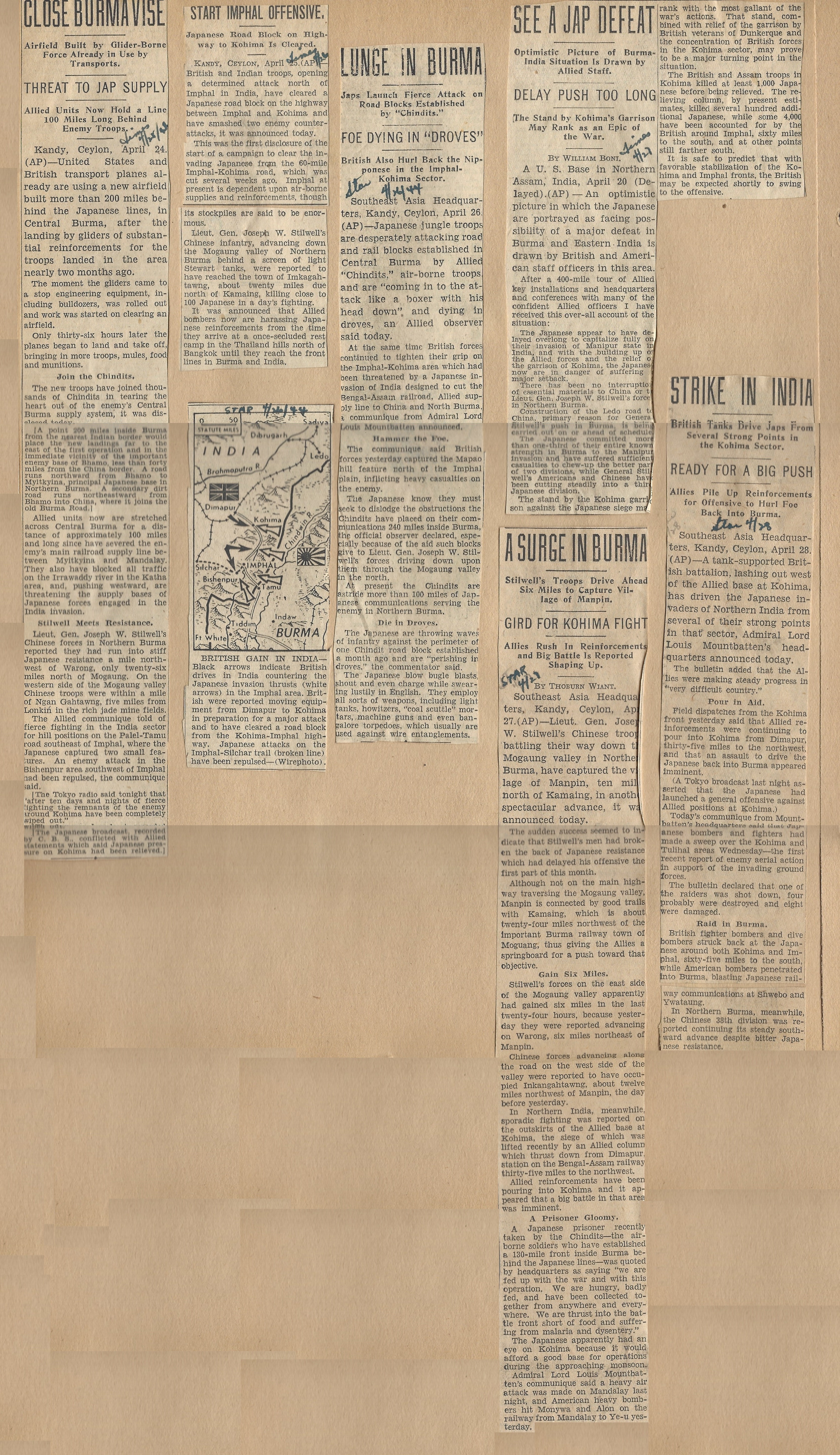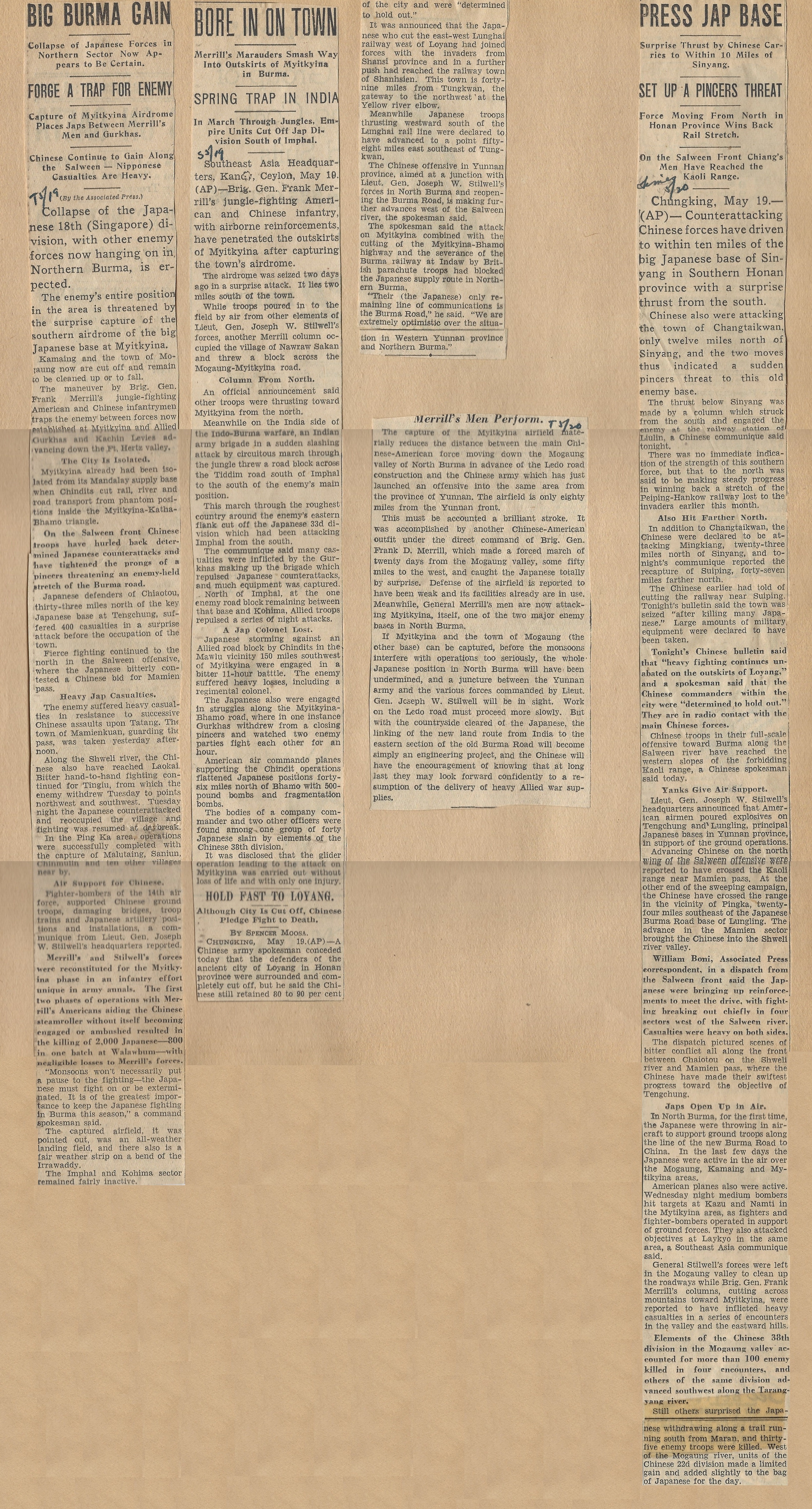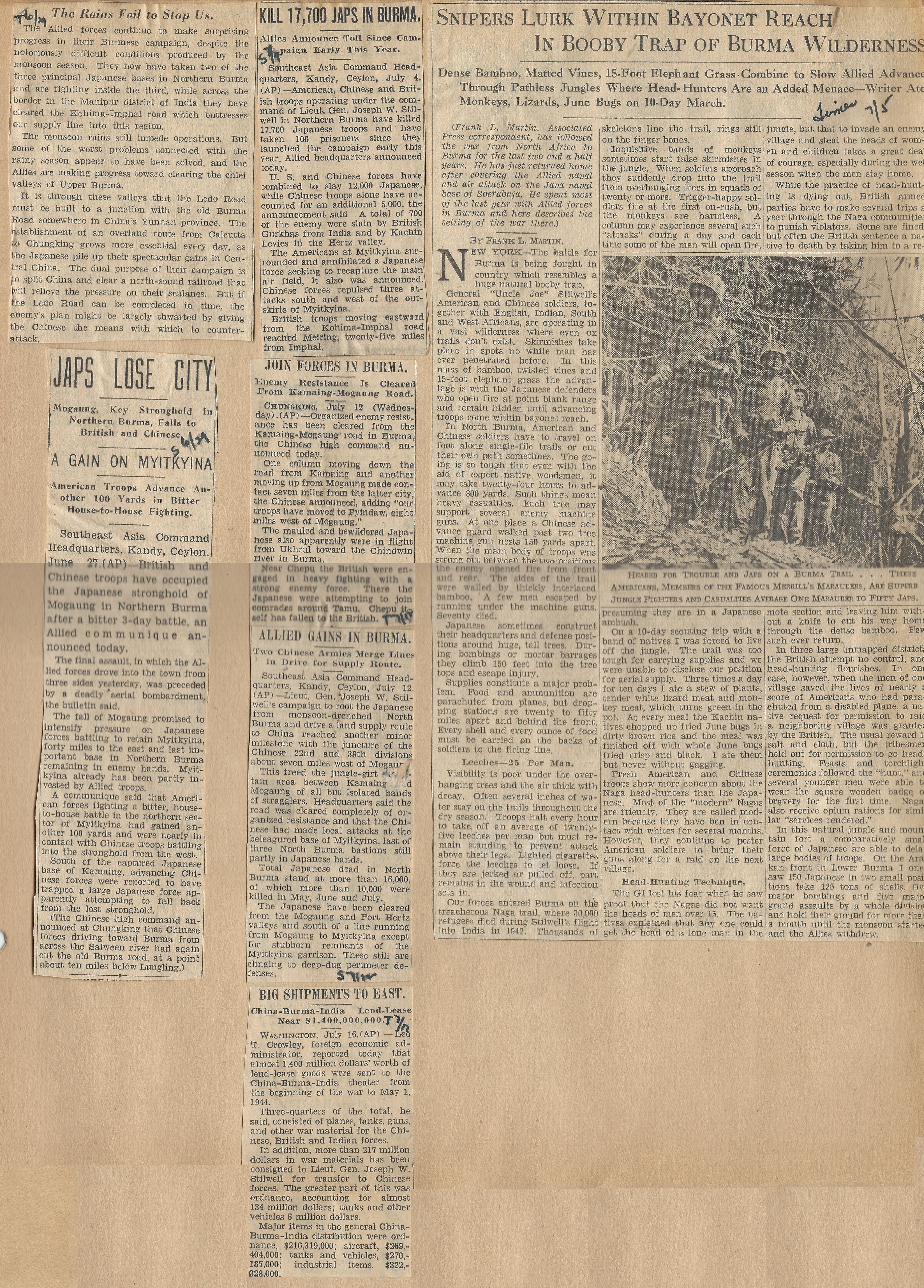 | Introduction In 1941, while war raged in Europe, most Americans preferred the country remain neutral and isolated from the conflict. That all changed on December 7th when the Japanese attacked Pearl Harbor and declared war on the United States. Just about every American was involved in the war, either being called to service in the armed forces, working in war production or other supporting roles. There were plenty of Moms who saw their sons off to some far-off place to fight. One such mom of Kansas City, Missouri, Josephine Smith Davis, saved newspaper articles about where her son was serving in a scrapbook. That place was the China-Burma-India Theater and her son was Lt. Col. Charles S. Davis. Below are the scrapbook pages filled with the CBI-related newspaper clippings she saved. For more about Col. Davis and his service in CBI - CLICK HERE Viewing Instructions Scroll down to view individual pages of the scrapbook. Click on the displayed page to open a new window with an enlarged image of that page. This image is more easily readable being 175% the size of the original. You can scroll up/down/left/right. Click on the image to close the window and return to this main page. Note that each page can be several scans pieced together and there may be some distortion where the scans were joined. To view all pages expanded - CLICK HERE Scroll down or click this box to continue to first page |