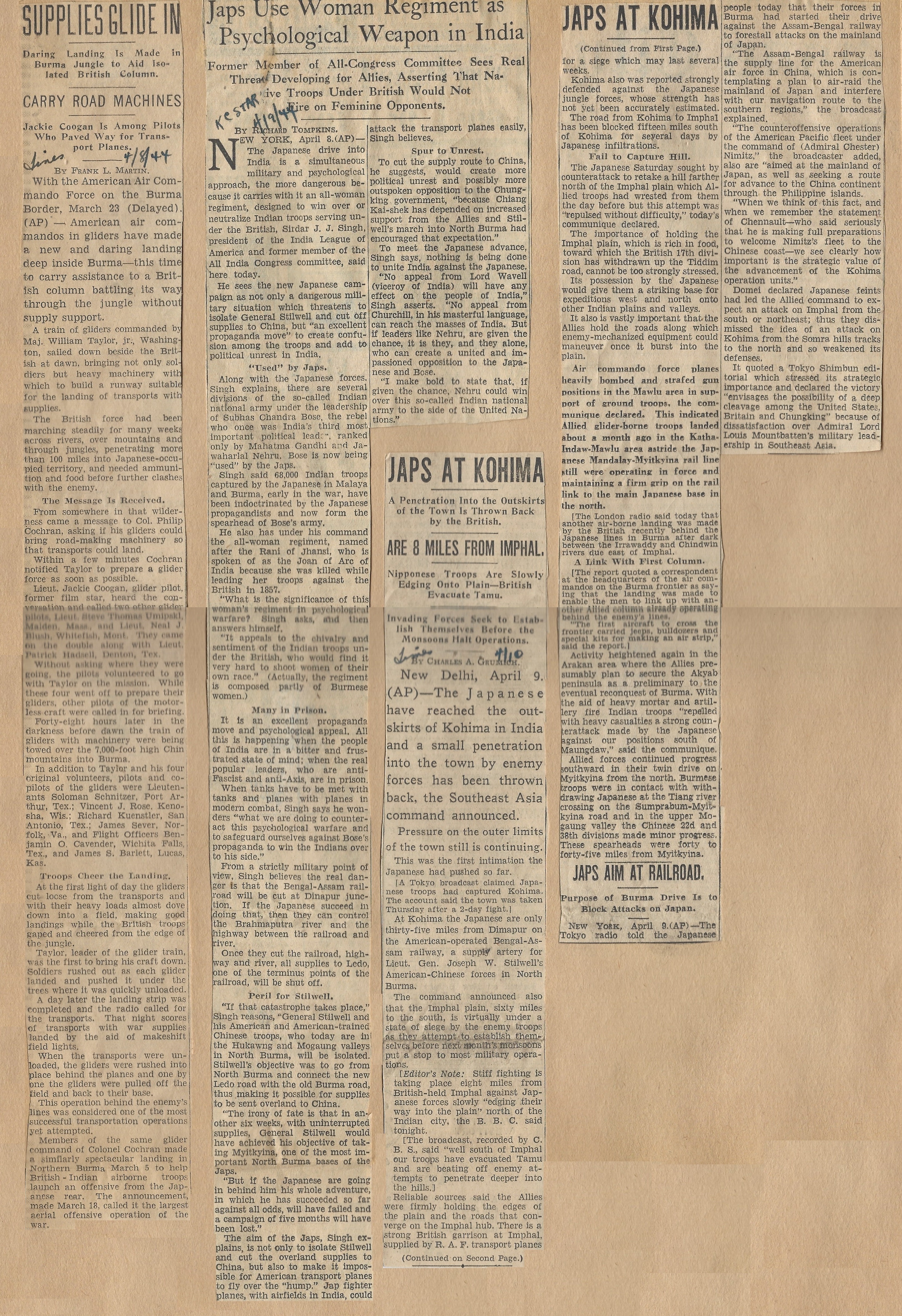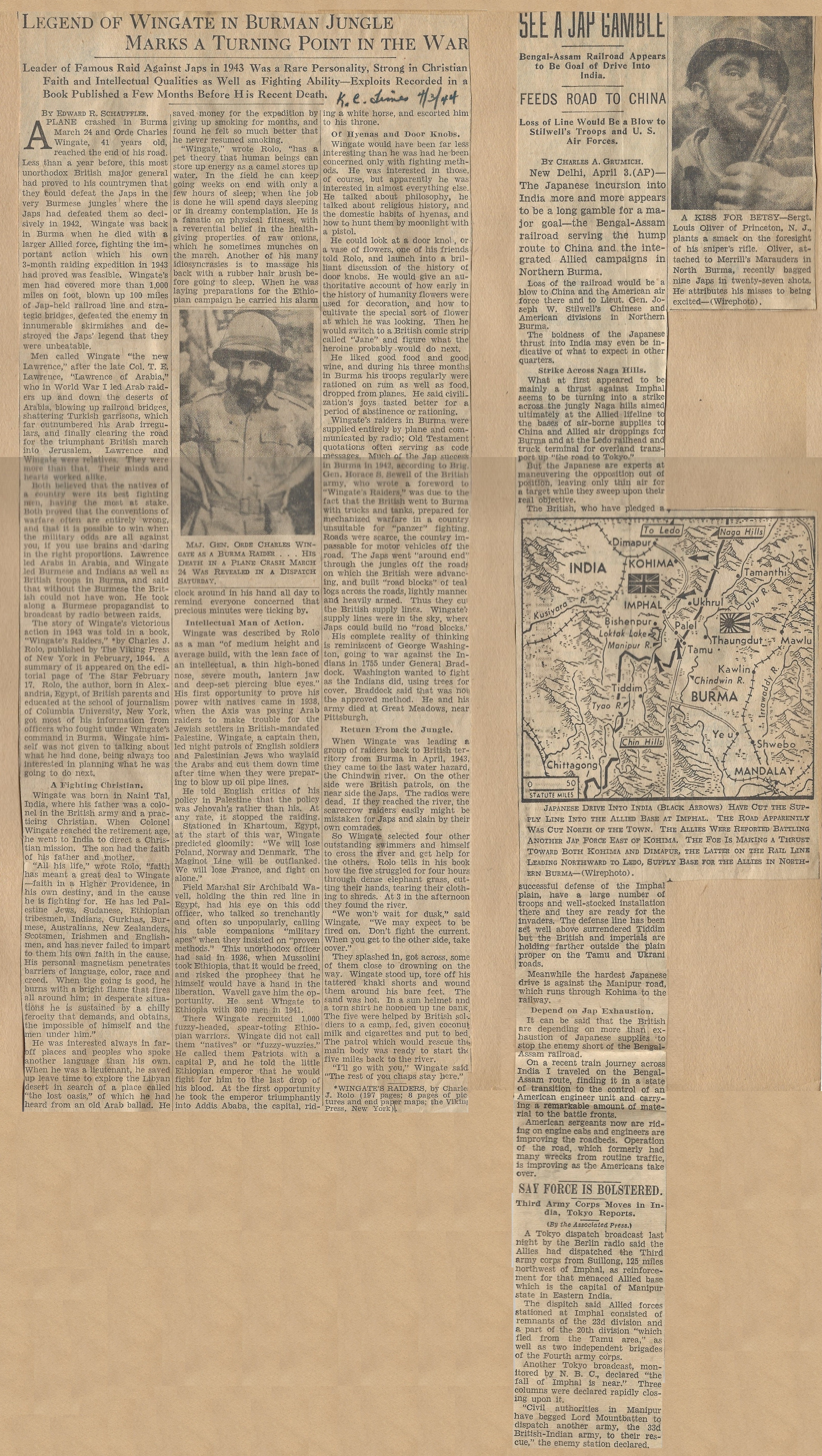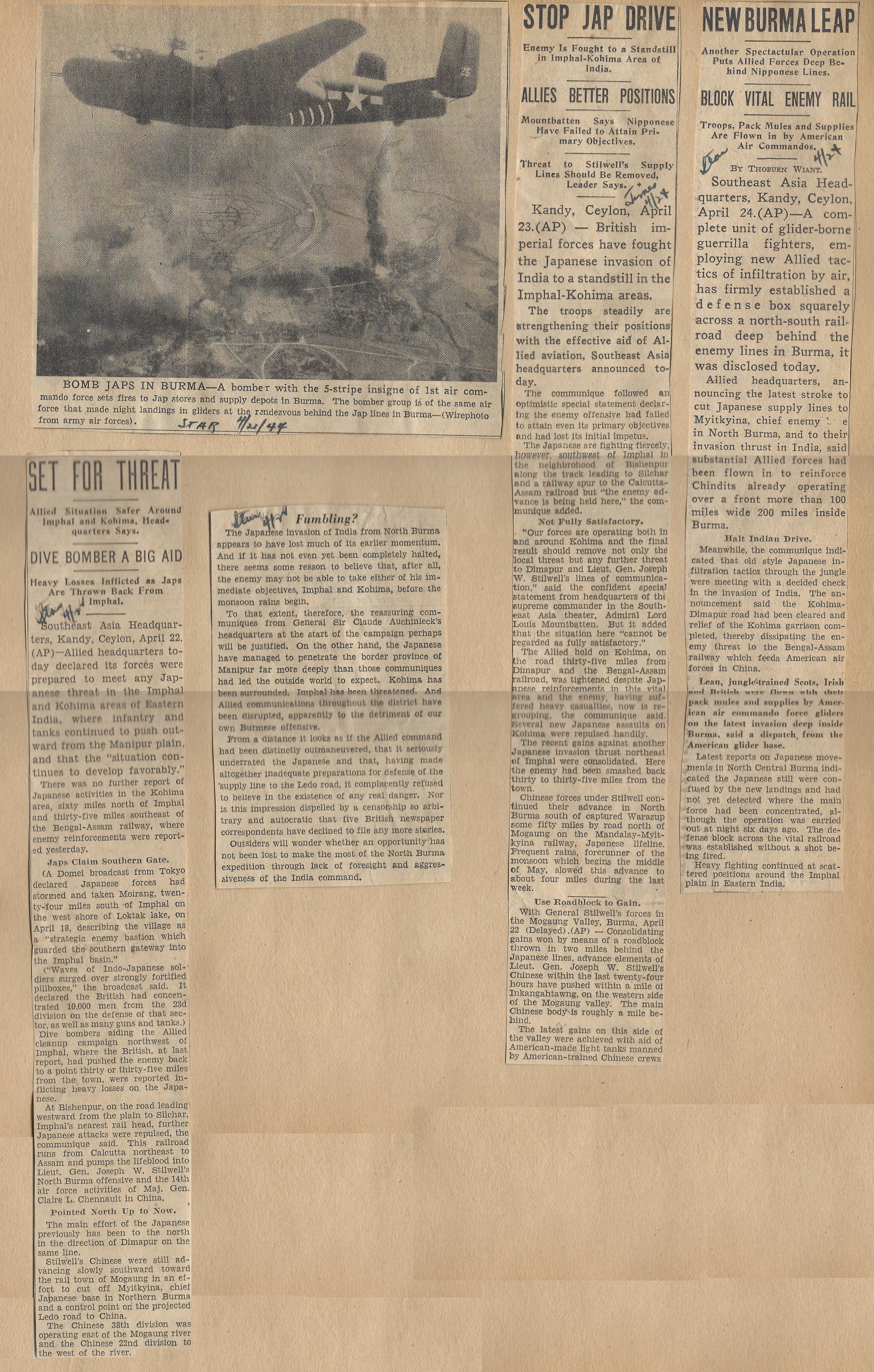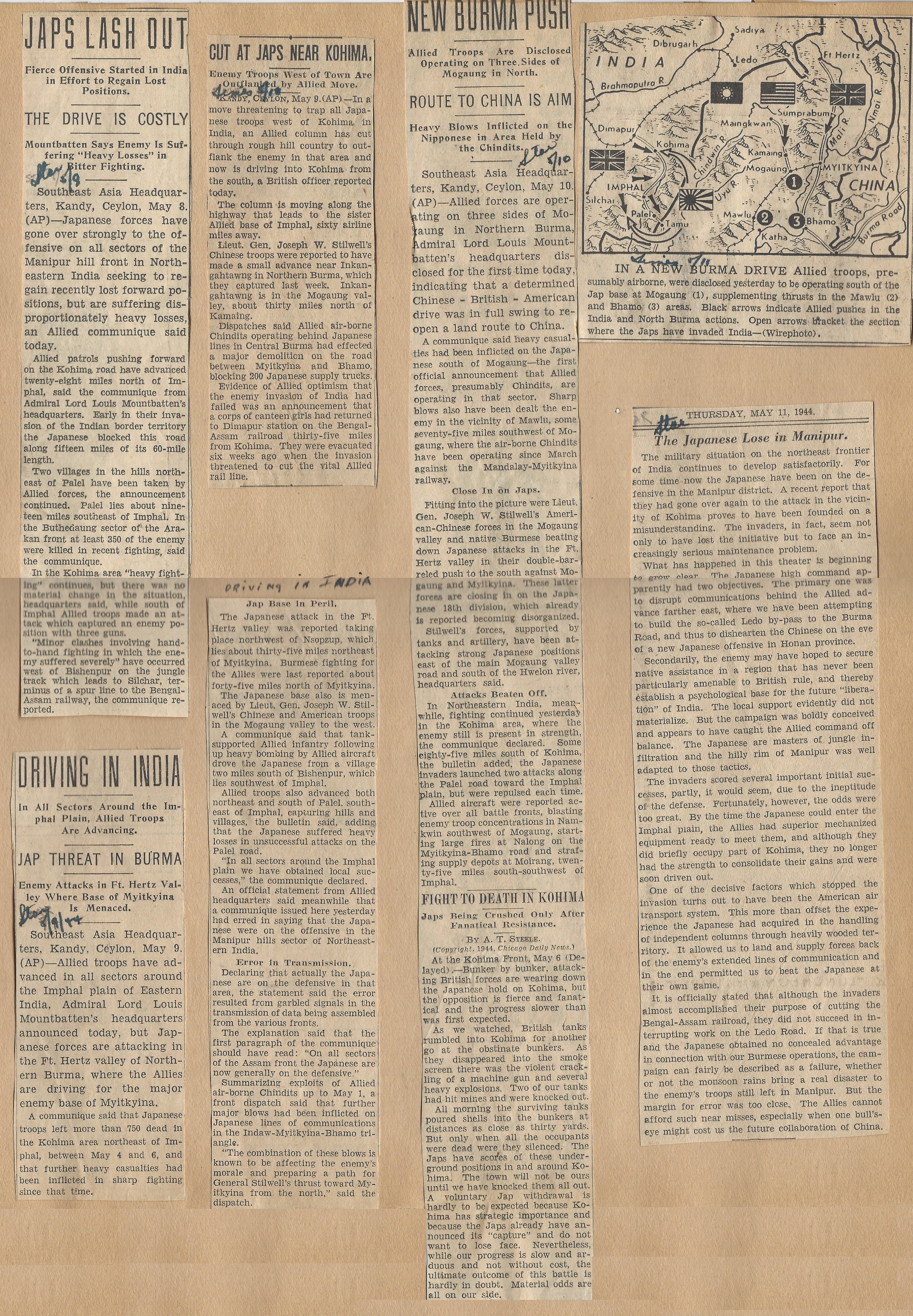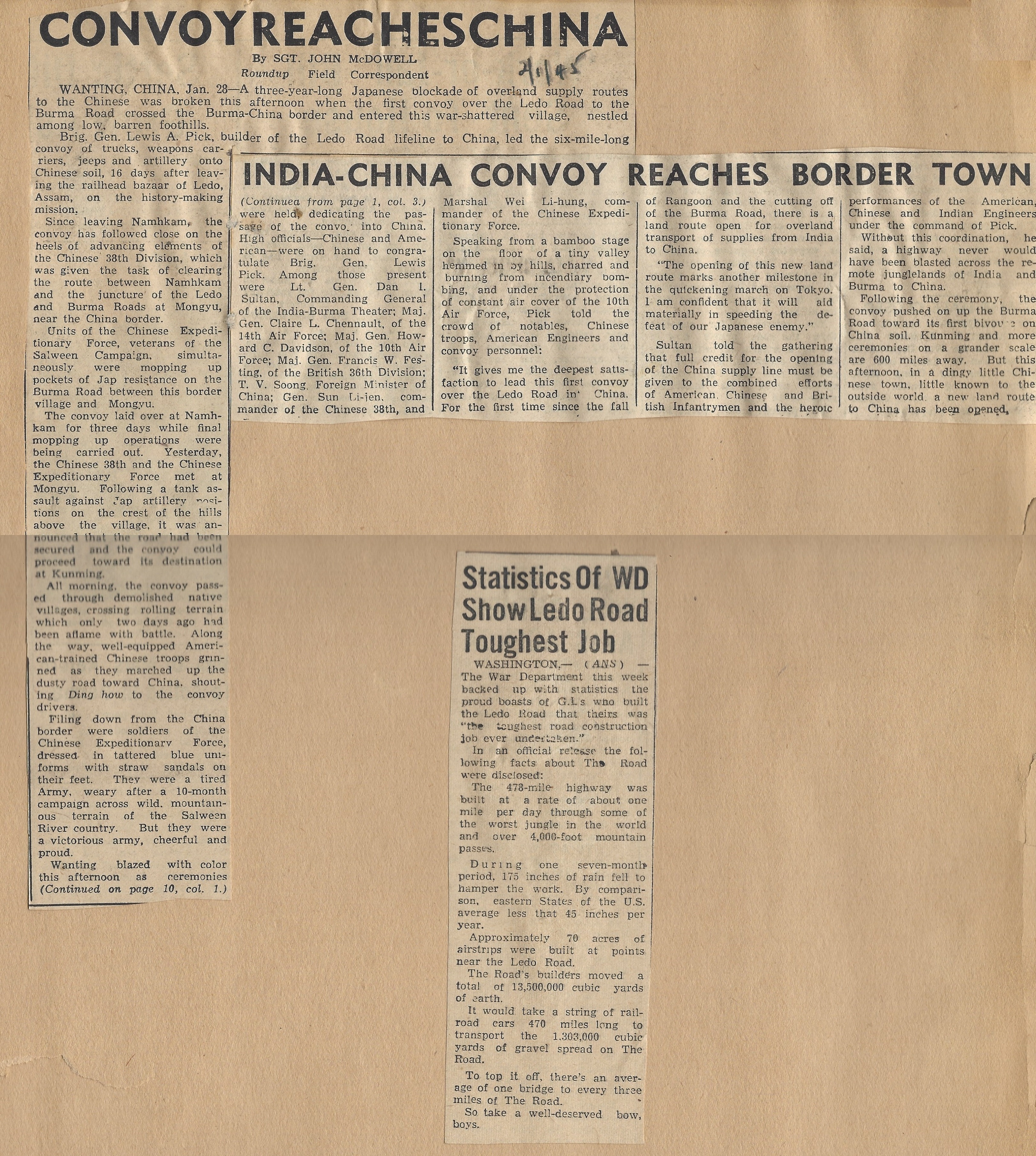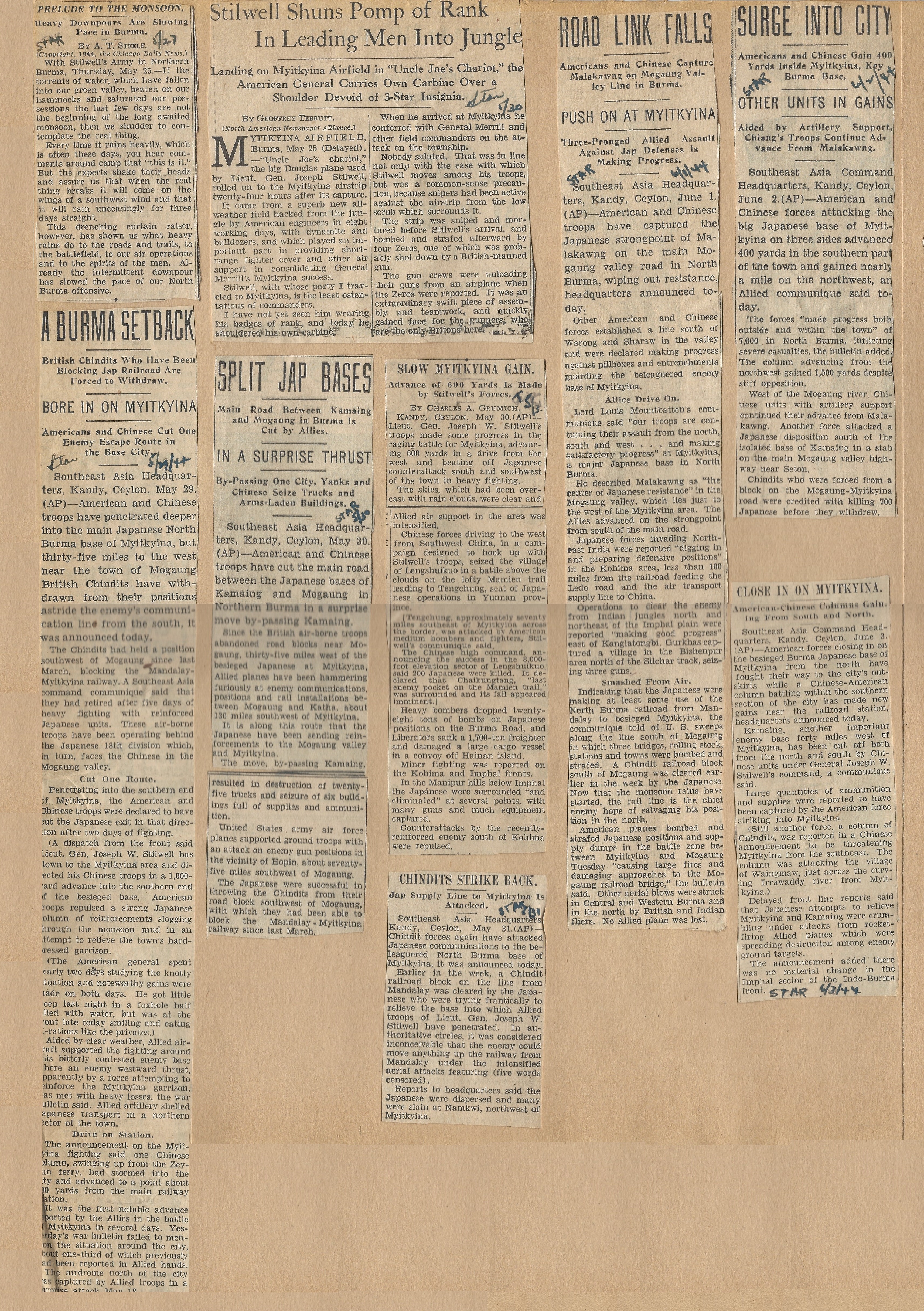 | Introduction In 1941, while war raged in Europe, most Americans preferred the country remain neutral and isolated from the conflict. That all changed on December 7th when the Japanese attacked Pearl Harbor and declared war on the United States. Just about every American was involved in the war, either being called to service in the armed forces, working in war production or other supporting roles. There were plenty of Moms who saw their sons off to some far-off place to fight. One such mom of Kansas City, Missouri, Josephine Smith Davis, saved newspaper articles about where her son was serving in a scrapbook. That place was the China-Burma-India Theater and her son was Lt. Col. Charles S. Davis. Below are the scrapbook pages filled with the CBI-related newspaper clippings she saved. For more about Col. Davis and his service in CBI - CLICK HERE Viewing Instructions Scroll down to view individual pages of the scrapbook. Click on the displayed page to open a new window with an enlarged image of that page. This image is more easily readable being 175% the size of the original. You can scroll up/down/left/right. Click on the image to close the window and return to this main page. Note that each page can be several scans pieced together and there may be some distortion where the scans were joined. To view all pages expanded - CLICK HERE Scroll down or click this box to continue to first page |