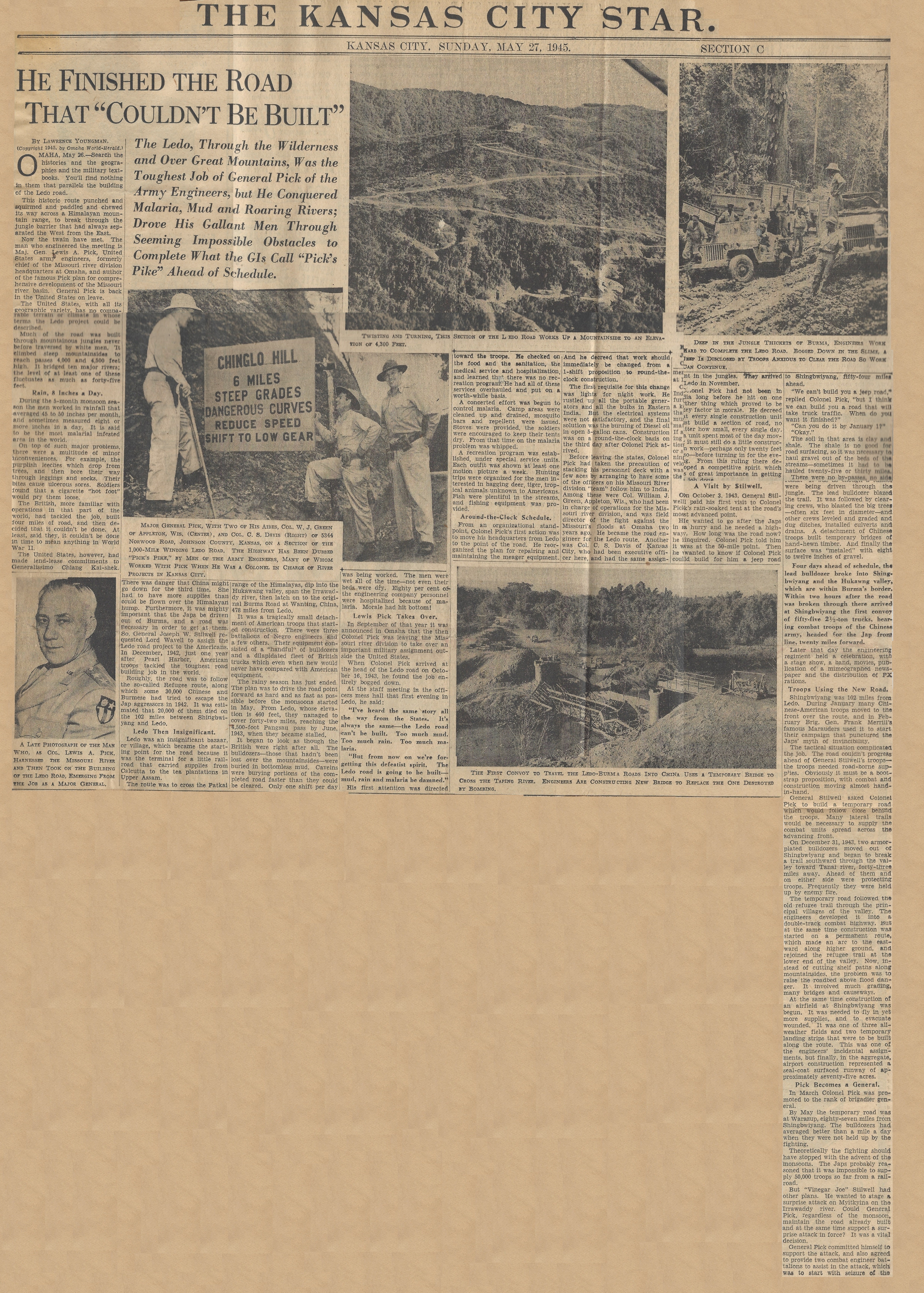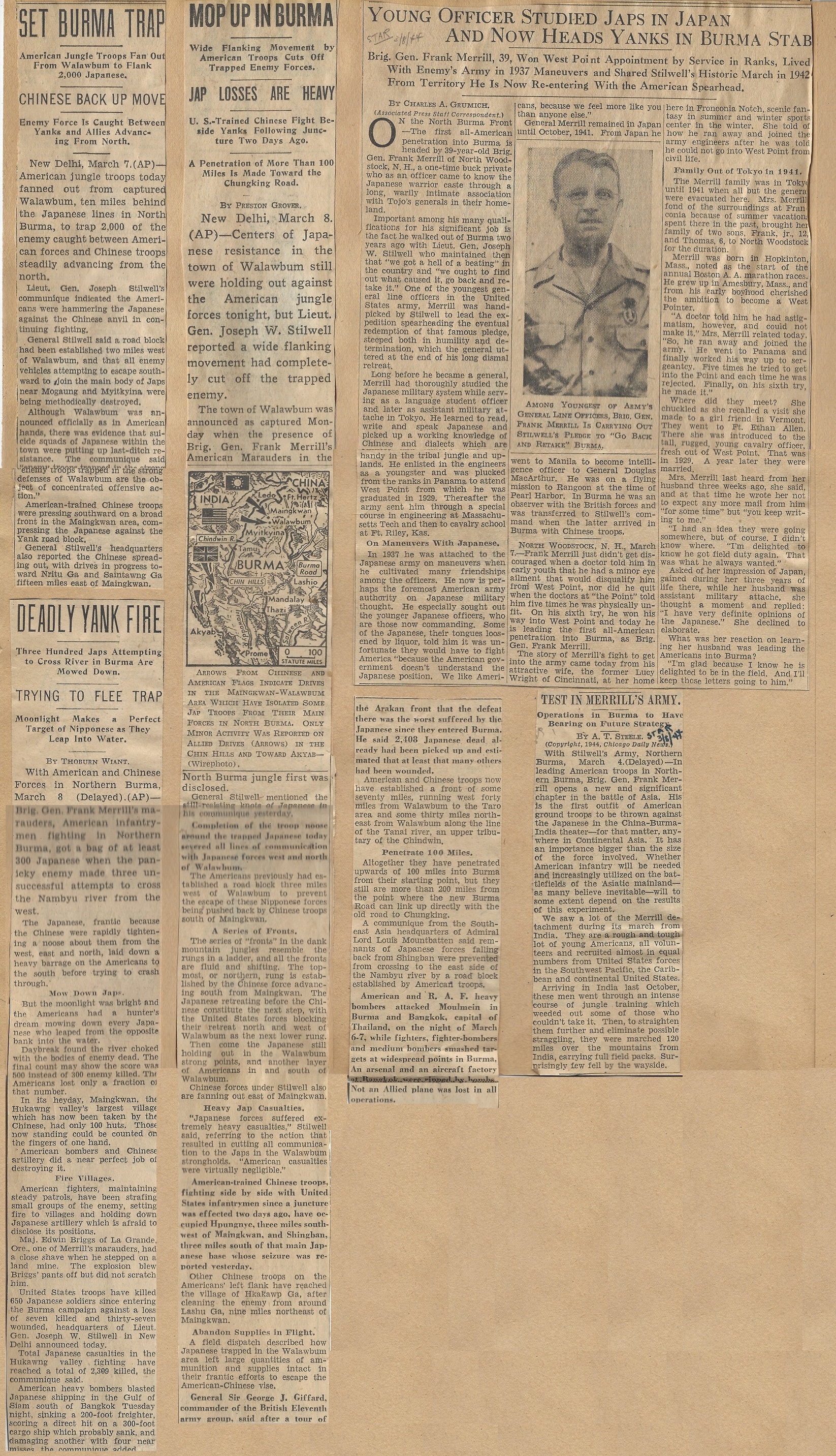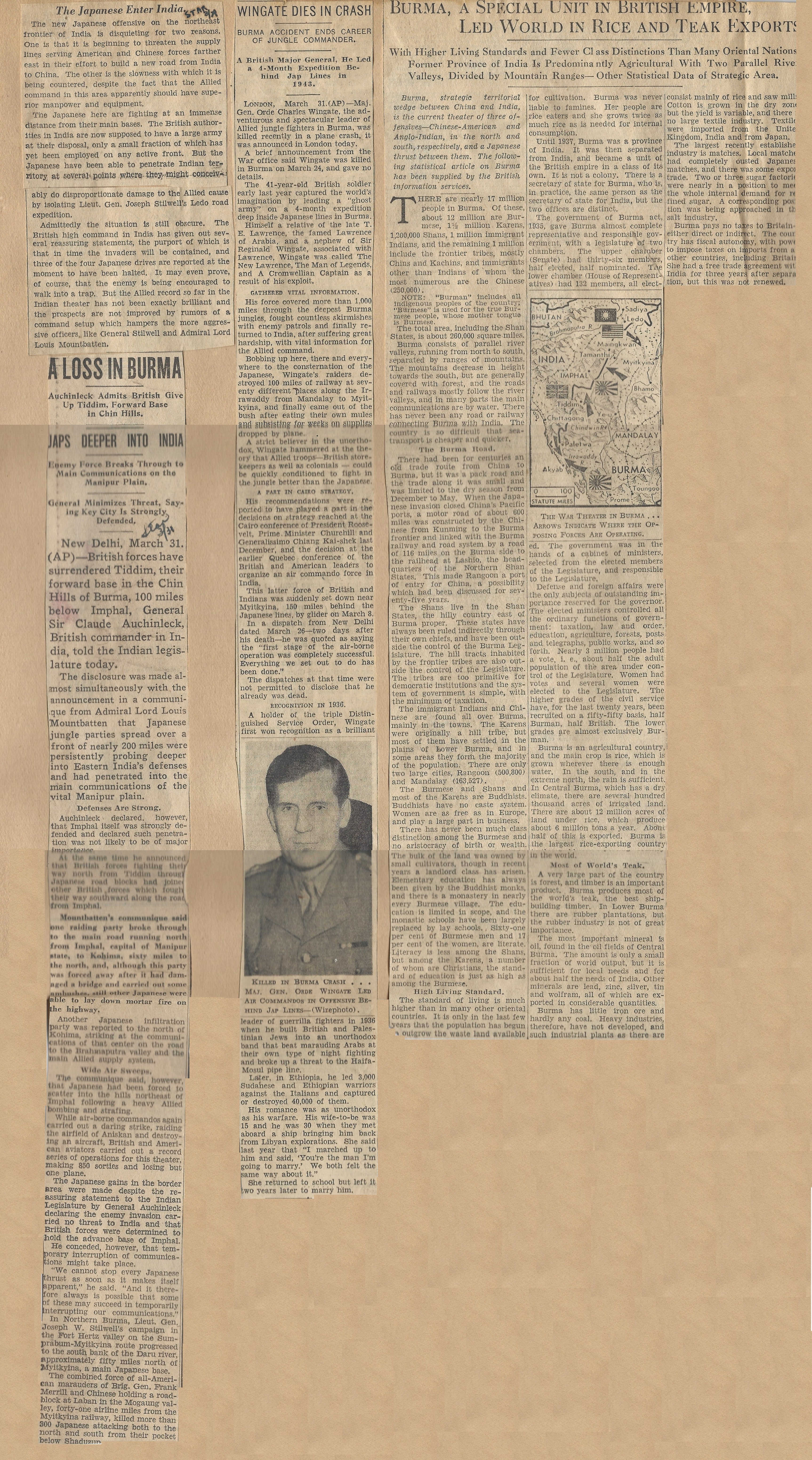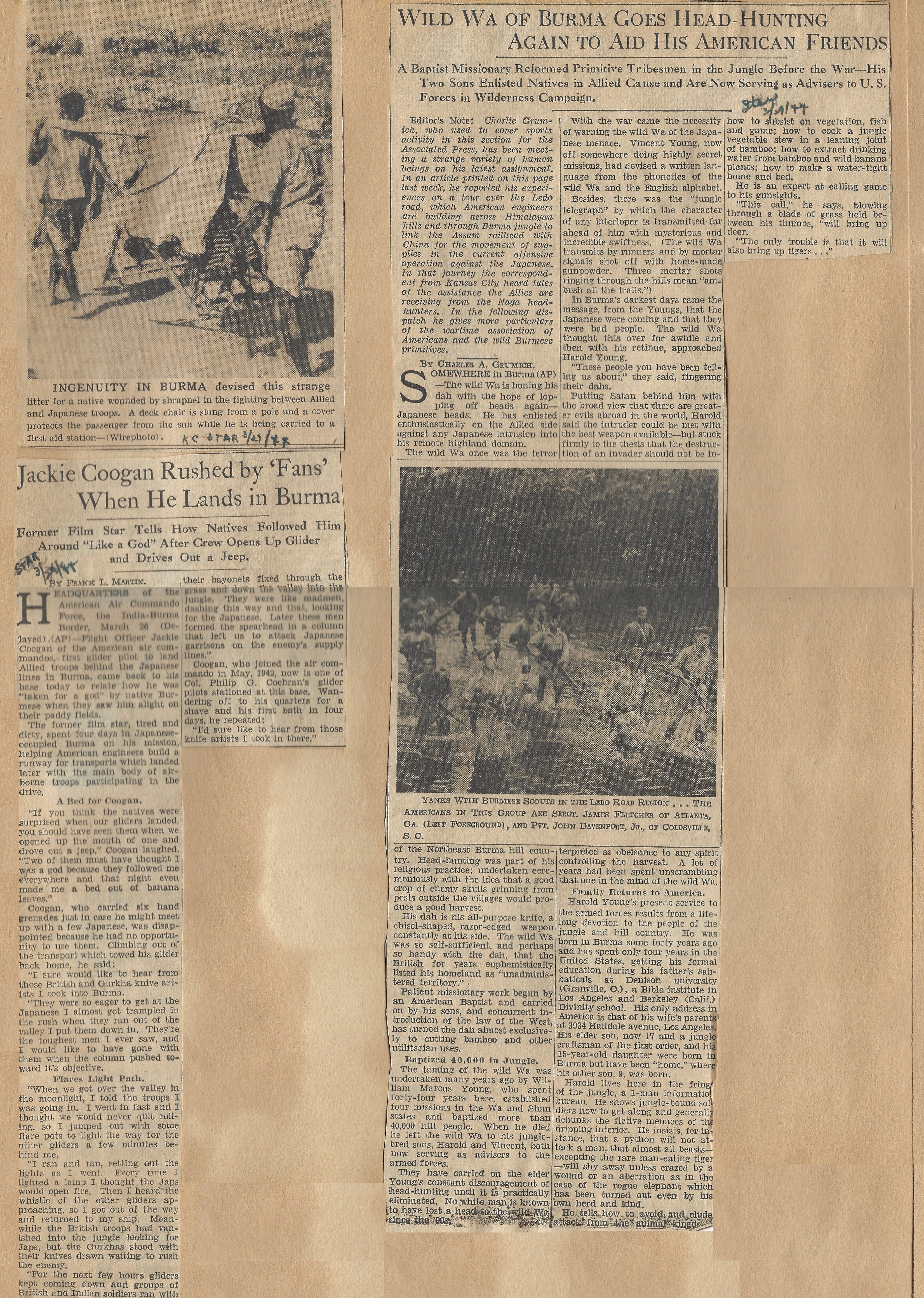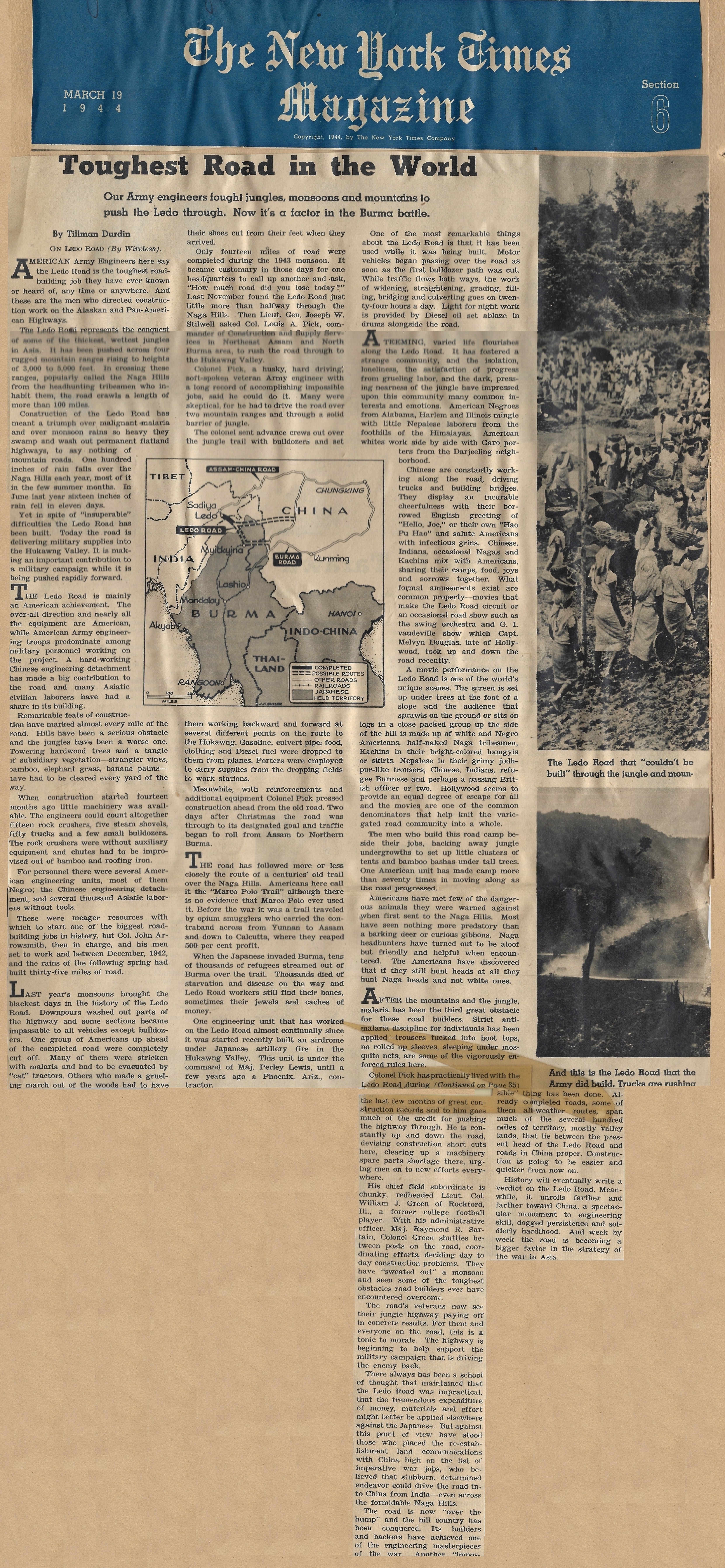 | Introduction In 1941, while war raged in Europe, most Americans preferred the country remain neutral and isolated from the conflict. That all changed on December 7th when the Japanese attacked Pearl Harbor and declared war on the United States. Just about every American was involved in the war, either being called to service in the armed forces, working in war production or other supporting roles. There were plenty of Moms who saw their sons off to some far-off place to fight. One such mom of Kansas City, Missouri, Josephine Smith Davis, saved newspaper articles about where her son was serving in a scrapbook. That place was the China-Burma-India Theater and her son was Lt. Col. Charles S. Davis. Below are the scrapbook pages filled with the CBI-related newspaper clippings she saved. For more about Col. Davis and his service in CBI - CLICK HERE Viewing Instructions Scroll down to view individual pages of the scrapbook. Click on the displayed page to open a new window with an enlarged image of that page. This image is more easily readable being 175% the size of the original. You can scroll up/down/left/right. Click on the image to close the window and return to this main page. Note that each page can be several scans pieced together and there may be some distortion where the scans were joined. To view all pages expanded - CLICK HERE Scroll down or click this box to continue to first page |