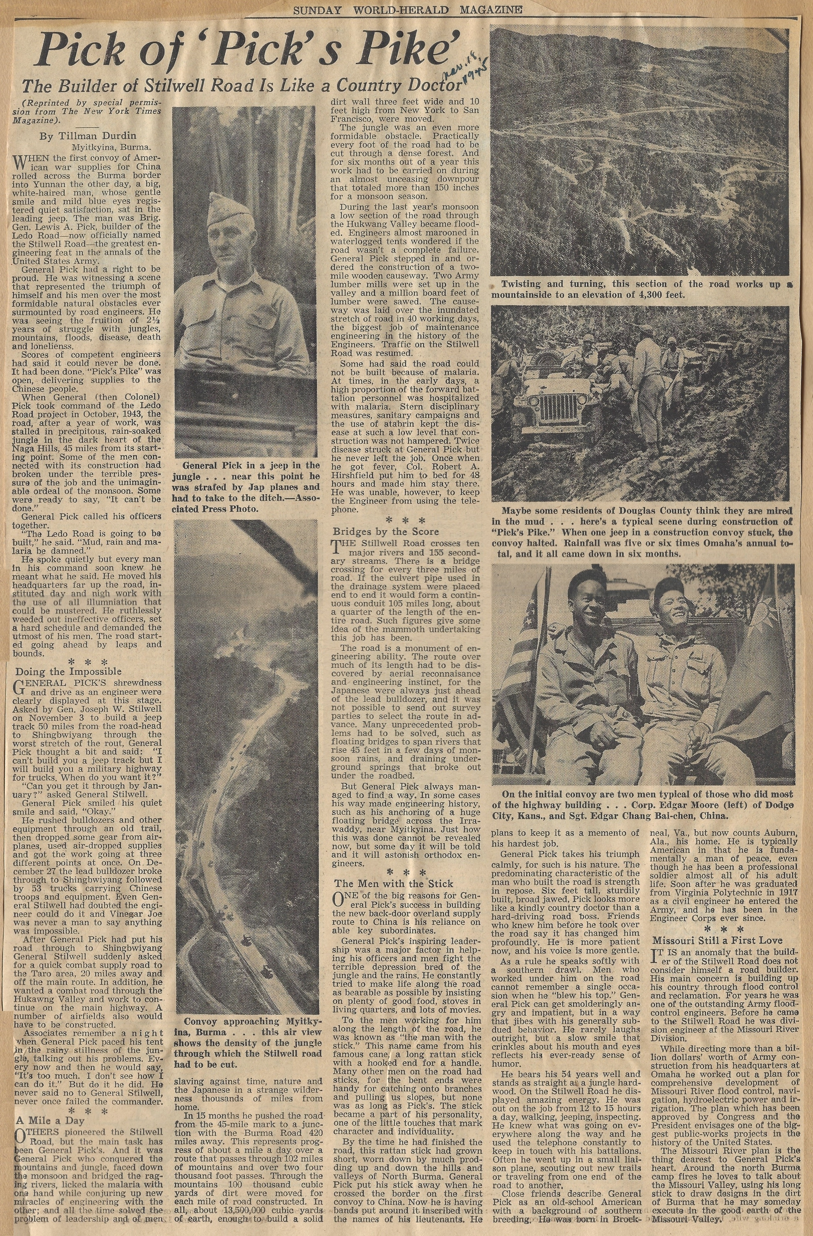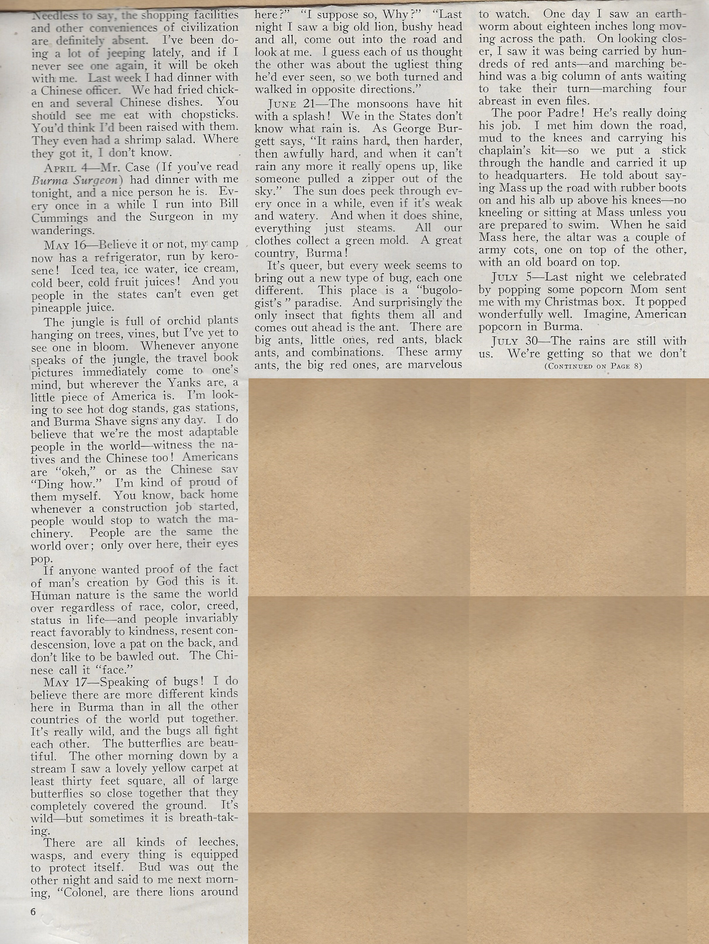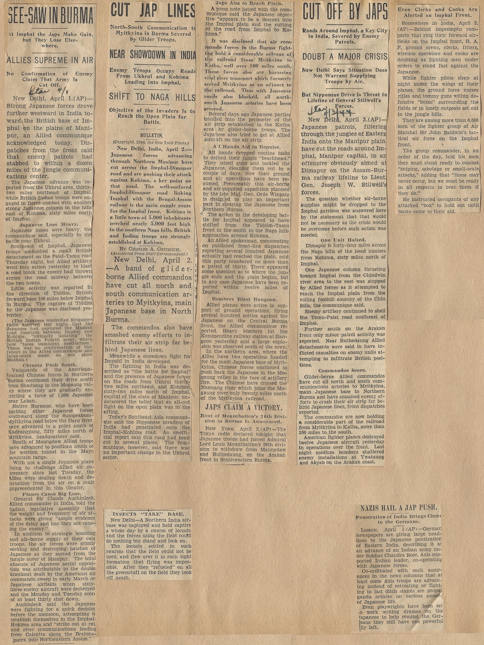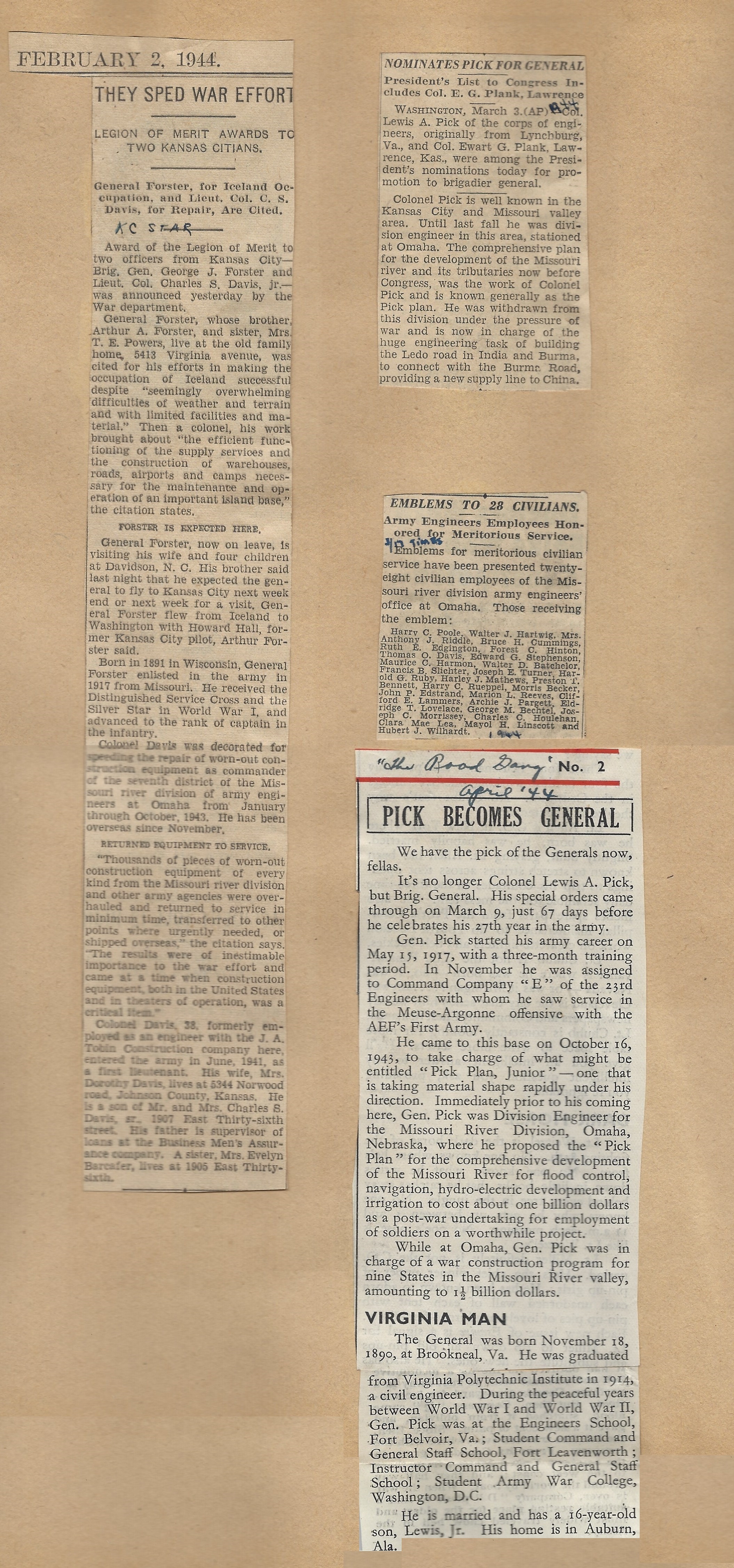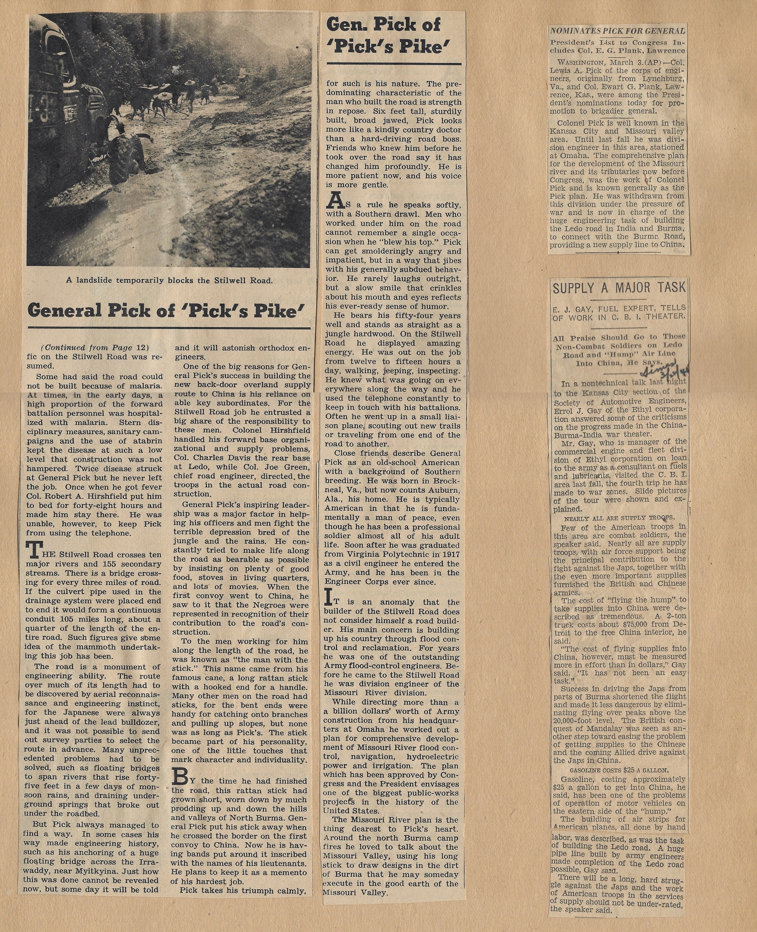 | Introduction In 1941, while war raged in Europe, most Americans preferred the country remain neutral and isolated from the conflict. That all changed on December 7th when the Japanese attacked Pearl Harbor and declared war on the United States. Just about every American was involved in the war, either being called to service in the armed forces, working in war production or other supporting roles. There were plenty of Moms who saw their sons off to some far-off place to fight. One such mom of Kansas City, Missouri, Josephine Smith Davis, saved newspaper articles about where her son was serving in a scrapbook. That place was the China-Burma-India Theater and her son was Lt. Col. Charles S. Davis. Below are the scrapbook pages filled with the CBI-related newspaper clippings she saved. For more about Col. Davis and his service in CBI - CLICK HERE Viewing Instructions Scroll down to view individual pages of the scrapbook. Click on the displayed page to open a new window with an enlarged image of that page. This image is more easily readable being 175% the size of the original. You can scroll up/down/left/right. Click on the image to close the window and return to this main page. Note that each page can be several scans pieced together and there may be some distortion where the scans were joined. To view all pages expanded - CLICK HERE Scroll down or click this box to continue to first page |