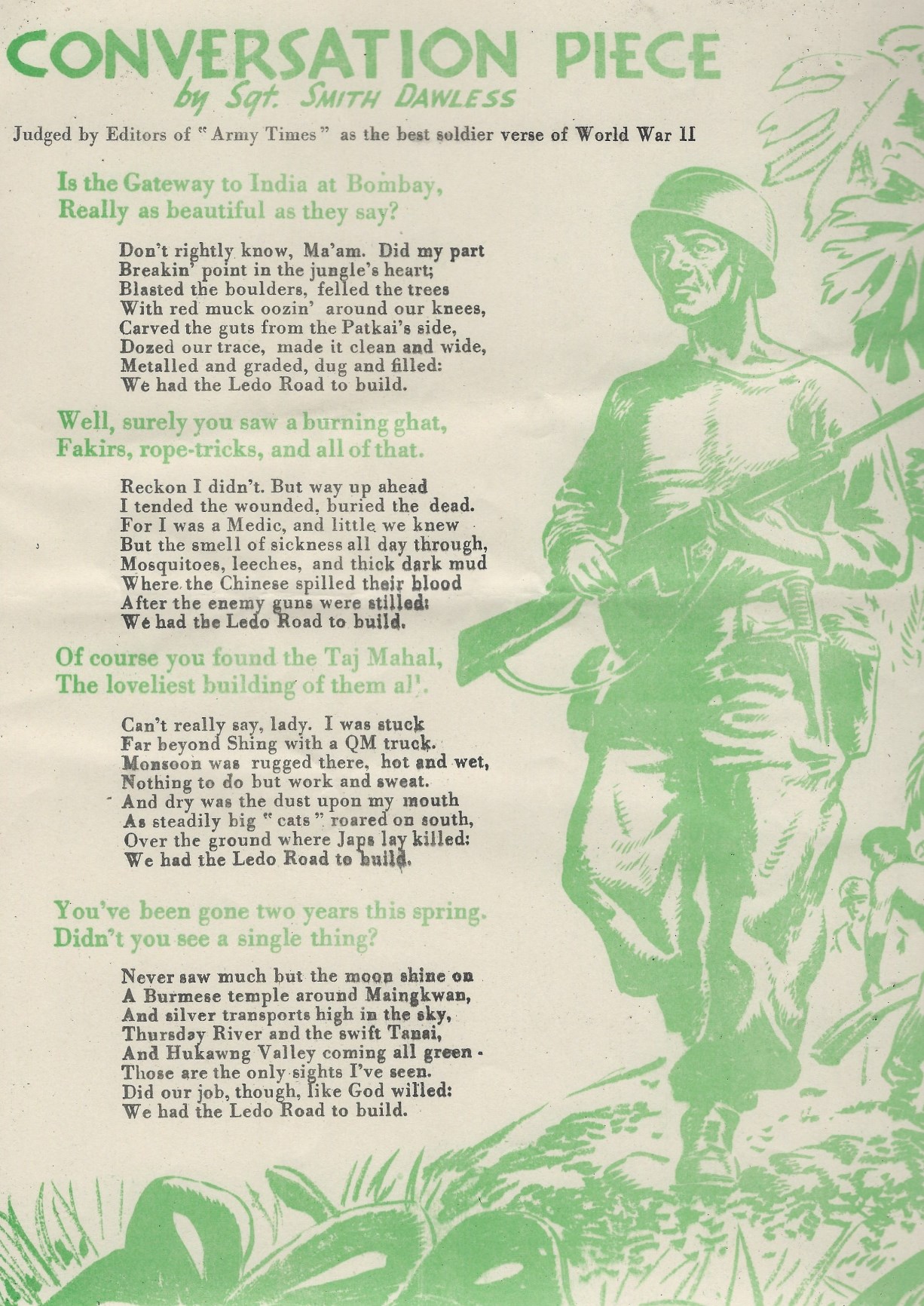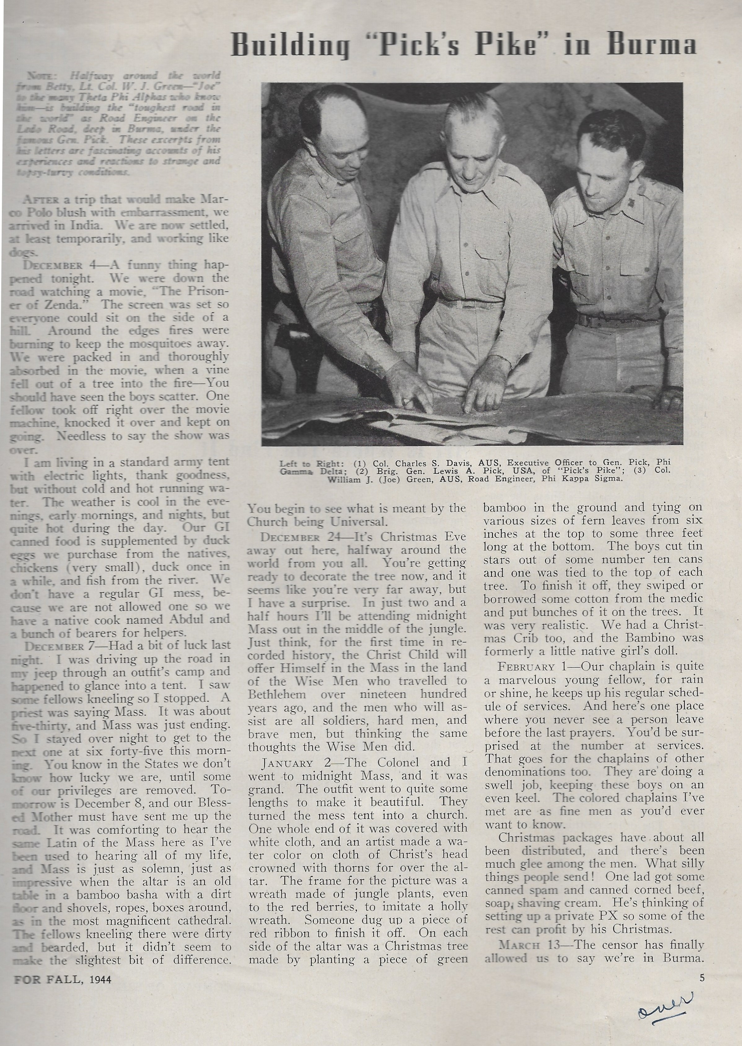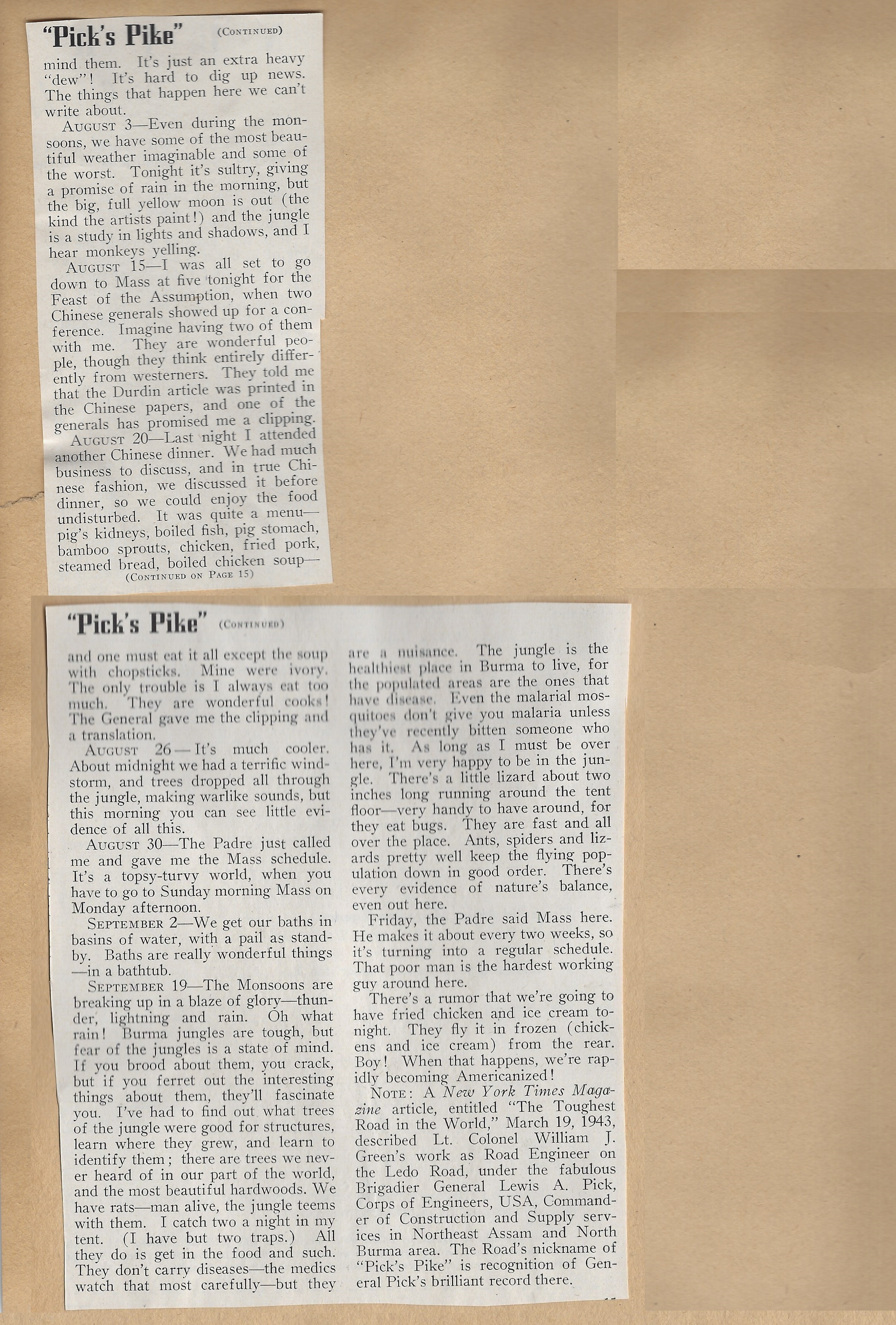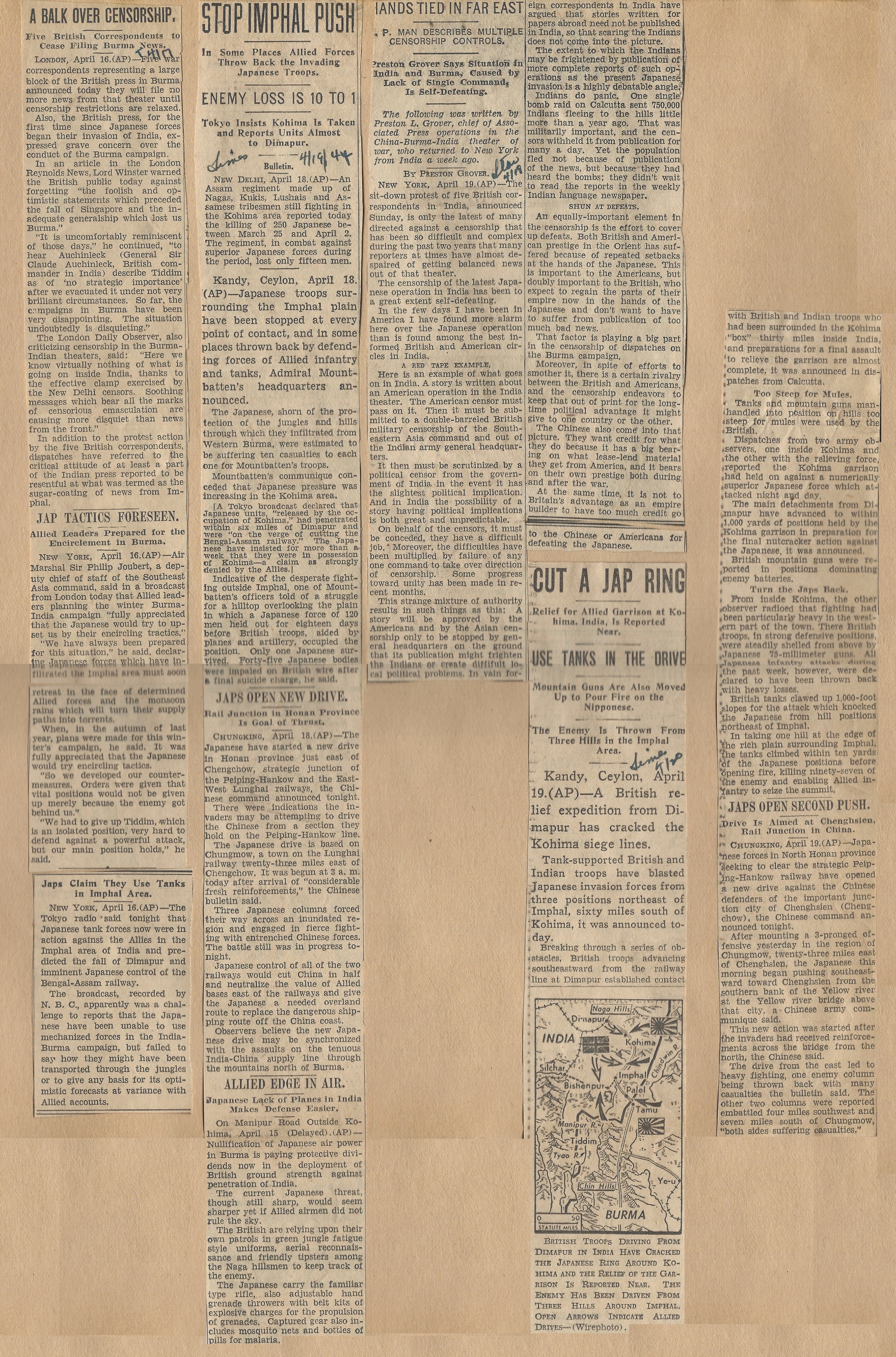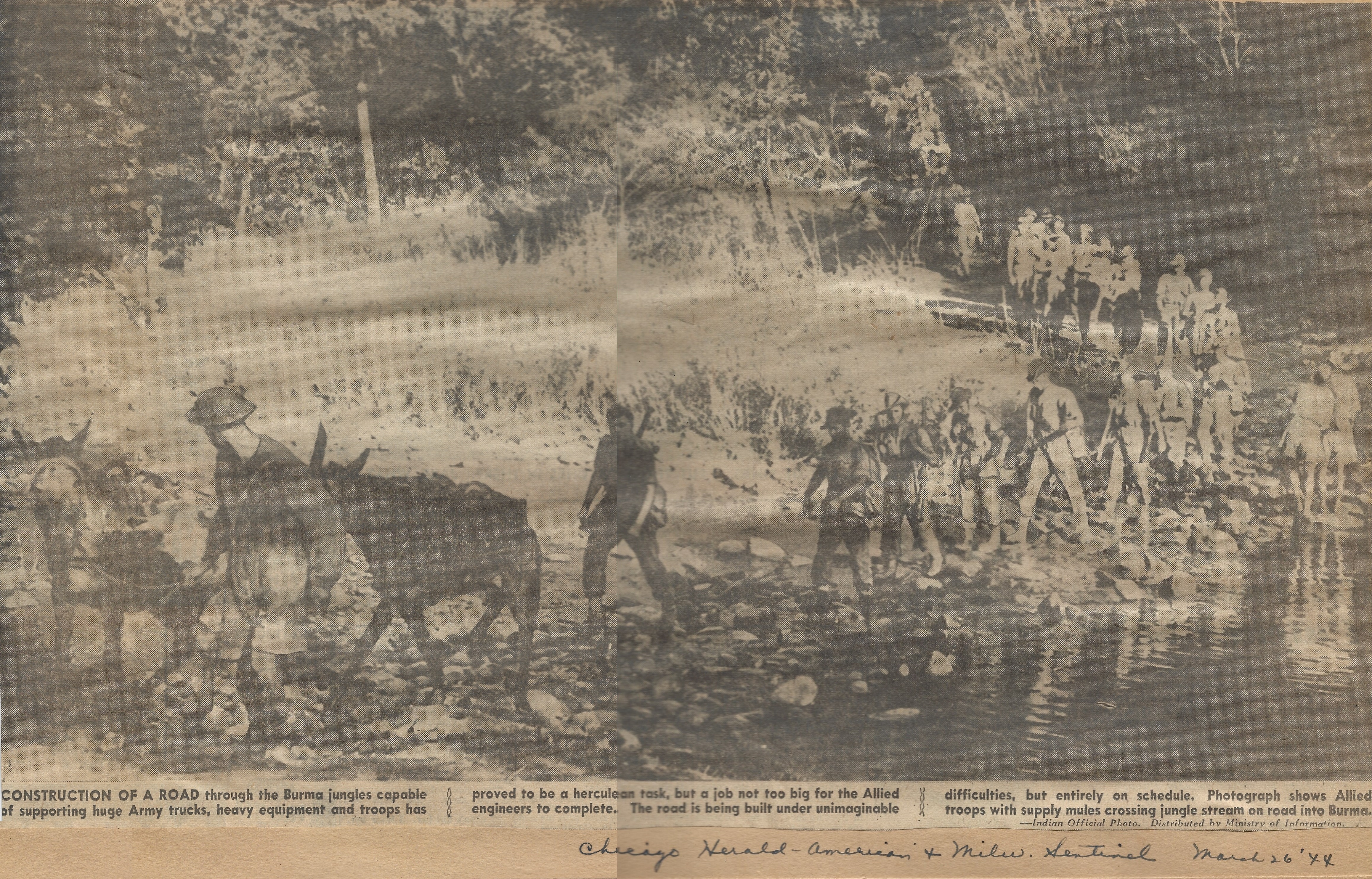 | Introduction In 1941, while war raged in Europe, most Americans preferred the country remain neutral and isolated from the conflict. That all changed on December 7th when the Japanese attacked Pearl Harbor and declared war on the United States. Just about every American was involved in the war, either being called to service in the armed forces, working in war production or other supporting roles. There were plenty of Moms who saw their sons off to some far-off place to fight. One such mom of Kansas City, Missouri, Josephine Smith Davis, saved newspaper articles about where her son was serving in a scrapbook. That place was the China-Burma-India Theater and her son was Lt. Col. Charles S. Davis. Below are the scrapbook pages filled with the CBI-related newspaper clippings she saved. For more about Col. Davis and his service in CBI - CLICK HERE Viewing Instructions Scroll down to view individual pages of the scrapbook. Click on the displayed page to open a new window with an enlarged image of that page. This image is more easily readable being 175% the size of the original. You can scroll up/down/left/right. Click on the image to close the window and return to this main page. Note that each page can be several scans pieced together and there may be some distortion where the scans were joined. To view all pages expanded - CLICK HERE Scroll down or click this box to continue to first page |