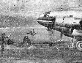 On Homeward Leg; Overall Time Scheduled Is Under 144 Hours Bermuda, Azores, Will Be Route of Luxury Ship, Handled by Staggered Crews, Slashing ATC's Minimum Time Around World Hq., Calcutta - Winging its way back home is a C-54 luxury airliner, the first ATC plane to fly a round trip bearing passengers on a regular schedule from New York to Calcutta. This new service from U.S. points to AAF, ATC, ASC Hq in India operates regularly on fast through schedules. Coming from the States, the flight is scheduled to consume 69 hours, elapsed time, and going home, because of difference in prevailing winds, 74 hours and 20 minutes. Aboard the beautifully-appointed ship as it left Calcutta the evening of March 17 was a full passenger load. En route, passengers were served hot coffee, snacks and sandwiches from the ship's galley. Every comfort of airline service before the war will be theirs, with a GI flight clerk replacing the comely stewardess. Bucket seats - long the bane of the existence of globe-trotters using military airlines - give way to well-upholstered reclining seats on the plane, enabling passengers to read, sleep or just relax and watch the clouds go by. Coming out, the plane left Wilmington, Del., and proceeded to New York, Bermuda, the Azores, Casablanca, Tripoli, Cairo, Abadan, Karachi and Calcutta. Going back the flight has taken the ship from Bermuda to Washington and Wilmington. Cuts Circuit Time Colonel, GI and civilian were aboard the giant Douglas C-54 Skymaster as it left Calcutta. Crew of the ship on the first leg home includes Capt. Ira R Johnston, Houston, Tex., pilot; Capt. Maurice Searls, New York City, co-pilot; Capt. Lauritz Kjerulff, Lake Charles, La., relief pilot; 1st Lt. B. B. McKinney, Ft. Worth, Tex., navigator; Sgt. James E. Thompson, Iowa Falls, Iowa, engineer and S/Sgt. H. G. Maxwell, Houston, Del., radio operator. Crews on the new direct scheduled run make the entire journey in various planes, in consecutive hops, with short layovers between legs. The crew on the first hop, for instance, was relieved at Karachi after the initial leg was completed, and another crew took over for the flight to Abadan. The new schedule cuts still further, 'round-the-world flying time via ATC. From Calcutta, priority passengers may board a plane which will take them to Ceylon and Australia, through the facilities of the ICD, and thence through the Pacific and back to the States. For some time the ATC has maintained 'round-the-world service, but portions of the circuit were not regularly scheduled flights. They were "on-call" hops made to carry certain high priority passengers from one end of the world to another. Furlough Deals Stretched from 30 Days to 45 WD Chief of Staff Revises Plan; Those Now Home To Benefit Too Hq., Calcutta - Rest and recuperation furloughs in the States have been lengthened from 30 to 45 days, it has been revealed by the personnel section. The furlough baksheesh, made possible by a directive issued by the War Department chief of staff, and applicable apparently to all commands, will concern all ICD personnel except those who actually have departed from the States for return to this theater. All Will Benefit According to A-1, only a few men have been "short-changed" on the deal. Not only will those whose furlough orders are cut hereafter, but those now enjoying free time at home will get the benefit of the full 45 days, it is said. Even those who may have left their homes for the port of aerial embarkation will be caught and returned to their residences for the extra 15 days. The POAE will take care of amending the orders, to make the stretching of the furlough official and legal, if the man is stopped there before return to ICD. If the man as yet has not left his home, then the reception station where he reported will cut the proper orders and notify the vacationer that he has been given 15 days grace. Requests to CG ICD Stateside furloughs currently are governed by ATC Regulation 35-13 which provides opportunity for key personnel to continue, on their own volition, in a certain division after a period of rest and recuperation in Shangri-La. Individuals desiring the furlough, in lieu of regular rotation which means sweating out quotas and returning to the States for permanent reassignment, must submit written requests to the division commander. The regulation prohibits coercion or pressure "to develop such a desire." Air Travel Physical exams are given those desiring such furloughs, and certification of ability to withstand continued foreign duty must be submitted with the individual's written request. Men travel to the States and back by air. After arriving in Uncle Sugar they report to the reception station nearest their home for orders giving them free reign for 45 days. Two years of overseas duty is the minimum eligibility requirement for ground personnel. Flying personnel must have completed the required number of air hours before they become eligible for the furlough. Atabrine Program Fights Malaria In Assam, Bengal Hq., Calcutta - ICD has begun a program of malaria suppression by the use of atabrine throughout the Assam and Bengal wings, it was announced this week by Col. E. A. Abbey, division surgeon. No effort has been spared to insure the completeness and regularization of the atabrine plan, which has been put to a long, thorough test in the Southwest Pacific and found invaluable in minimizing the disease. Kills One Type Personnel with assemble by roster every day after a meal and each man will swallow one atabrine tablet, washed down with a glass of water. The fact that he has taken the tablet will be noted by the non-com in charge. A man who misses a day must take two tablets the following day. Suppressive atabrine, it is pointed out, will not prevent malarial infection, though it will keep a man from becoming ill with malaria. It kills one type of malarial parasite, malignant tertian, but only suppresses the other type, benign tertian. This me