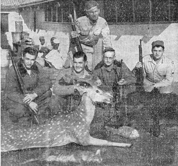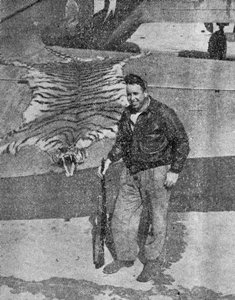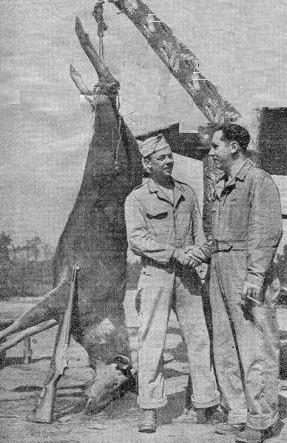 Hunting, Wishes He Hadn't 1332 BU, Assam - Capt. William H. Tebay, CO of Squadron "E" has well and truly earned the appellation "Buffalo Bill." Returning to his base at 2 a.m., one night last week, the captain was hardly prepared for the guest waiting on his basha porch - a 1,400-pound water buffalo. In no mood to receive the visitor, Capt. Tebay shooed him from the porch. Then, thinking the beast might cause further disturbance, he made off to pursue it into the jungle. As if by magic, the half-ton bulked had melted into the night. "Buffalo Bill" probed the darkness with his flashlight - but no buffalo. By this time Tebay was ready to believe it all had been an illusion. Then came a mighty roar from a nearby slit-trench. The animal was trapped - bit good! In hardly any time, a C-2 wrecker, a cowboy from Texas, 32 well-wishers and 12 know-it-alls had appeared on the scene. But all efforts to raise the buffalo were futile. Finally an incline was dug, and an hour and a half after falling into the trench, the uninvited guest was induced out of the trench and disappeared into the jungle blackness with injured oriental calm. Neither oriental nor calm, "Buffalo Bill" took his new nickname and his badly frayed nerves to bed.