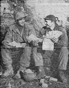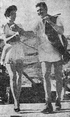 Trouper Jack Gwynn Livens China Scene 1342 AAF BU, CHINA - The indomitable spirit that characterizes showmanship is at it's best when USO trouper Jack Gwynn is on the scene. Far overdue for a rest, after having covered Italy, North Africa and India with the "Funzafire" unit, Gwynn refused time out to come to China and the end of the line to do his magic for the entertainment-hungry Joes. Seven shows in 36 hours was the pace Jack set for himself playing in mess halls, hospitals, dayrooms and any available space he can find. When not putting on his act he is in bull sessions with the boys and signing "short snorters." He also has a son who is a pilot in the ETO which probably accounts for his untiring efforts to amaze his many audiences with his bag of tricks. 'Babes In Boyland' To Tour China Theater Latest of the shows to come to the China Theater is the Entertainment Production Unit's "Babes in Boyland," which is due at APO 627 on March 10, and from there will embark on a tour of all the installations in the theater, it was announced this week by the Theater Special Service office. This compact six men and a girl unit was especially designed to fit any stage, and features the vocalizing and comedy routines of May Carter, a versatile young comedienne who has been playing before GI audiences throughout the India-Burma Theater for better than two years. Playing opposite May is Glenn Turnbull, who won acclaim as a dancer in the "Hey Rookie" show, and who recently joined the Entertainment Production Unit. Glenn not only does some hoofing but also sings and handles the male lead in comedy blackouts. Billed as the "Three Harmoniking's, Hy Dolber, Aage Thompson and Don Prible, supply a musical harmonica background for the vocals in addition to doing a little soloing and vocalizing on their own. Roland Bellrose, accordionist, and Kenny Golden, bass, round out the unit, doing individual bits and filling out the musical background for the various vocalists. ![]()