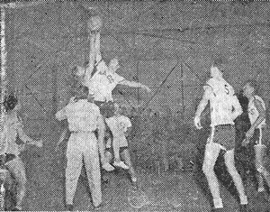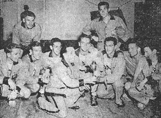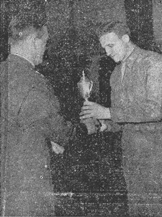 For All-China Cage Crown Displaying their best passing form of the season and shooting with uncanny accuracy, the AACS Signals battered the Kunming Cagers 51-24, Sunday night at the Hangar at APO 627, before 1,500 fans that included four generals, to win the All-China basketball championship in the finals of the cage tourney held under the auspices of the Theater Special Service Office. In the opening game of the evening the Yankee All-Stars slaughtered the ATC Commandos 50-25 to take third place. The Cagers were never in the game as, suffering from the loss of Ben Schall and Hubert Wolfe, both of whom injured their ankles in Saturday's semi-final game against ATC, they score only six baskets in the 40 minutes of play. The Signals never looked better as led by Bill Knapp, who scored 15 points, they picked cleverly to get in under for layups, and set up set shots outside the foul circle. After opening cautiously and feeling out the Cagers man-to-man defense, the Signals picked up speed with Dick Hughes and Weyman Crawford cutting under the boards for layups, Mel Maceau tapping in a rebound under the basket and Art Hobson throwing in a long shot to dash out to an 18-4 lead at the end of the first period. By halftime the Signals starting five had lengthened their lead to 28-9, as the Cagers, in what was probably their worse shooting form of the season, were only able to sink two buckets being constantly hurried in their shots by the aggressive Signals defense. In the second half it was simply a case of playing out the time as the Signals put on a clever passing display, Willie Knapp began to hit with long shots from outside as the Cagers packed the defense and, when they rushed to break up the Signals monopoly of the ball, Art Hobson, Mel Maceau and Dick Hughes broke through for easy buckets. Despite the runaway score the Cagers never gave up, pressing the Signals on the offense and making them work for every basket in spite of their big height advantage. Chapman and Joe Fruschione kept driving all the time, Fruschione netting six of the eight foul shots that he drew. In the opening game for third place in the China ranking, the Yankee All-Stars had no trouble at all with the ATC Commandos. Using their height advantage to good effect, they effectively bottled up the Commandos with their zone defense and tallied repeatedly under the board to roll up a 23-11 halftime margin. Led by Leo Locher, who dumped seven buckets for 14 points, they won 50-25, while Elmer "Soup" Campbell with 10 points kept ATC in the scoring column. In brief but impressive ceremonies after the game the "General Wedemeyer Trophy" was presented to the winners by Brig.-Gen. Douglas Weart, commanding general, Rear Echelon CT; the "General McClure Trophy" was awarded to the runners-up by Col. David Barnett, chief of staff, Chinese Combat Command, and souvenir banners were given to all the competing teams by Colonel Paul Myers, commanding officer of the Air Base and host for the tourney. The "General Chennault Award" was presented by Maj.-Gen. C. L. Chennault, commanding general of the 14th Air Force, to Lt. Hubert Wolfe, Hastings, Neb., of the Kunming Cagers, as the "Outstanding Sportsman" of the tourney. Sgt. William Knapp, Brooklyn, N.Y., was presented with the "General Cheves Award" by Major-Gen. G. X. Cheves, commanding general, SOS, as the "Outstanding Player" of the tourney for his work in leading the AACS Signals in the championship.